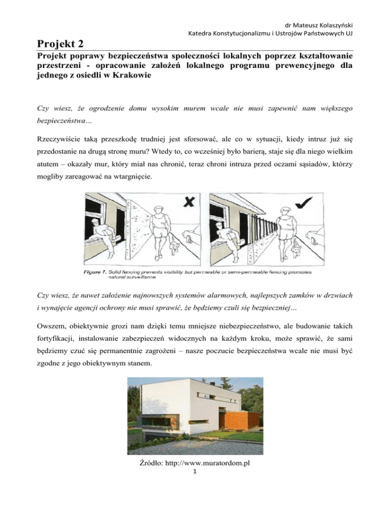 dr Mateusz Kolaszyński Katedra Konstytucjonalizmu i Ustrojów Państwowych UJ Projekt 2 Projekt poprawy bezpieczeństwa społ społeczności eczności lokalnych poprzez kształtowanie kszt przestrzeni - opracowanie założeń lokalnego programu prewencyjnego dla jednego z osiedli w Krakowie Czy wiesz, że ogrodzenie domu wysokim murem wcale nie musi zapewnić nam większego bezpieczeństwa… Rzeczywiście taką przeszkodę trudniej jest sforsować, ale co w sytuacji, kiedy intruz już się przedostanie na drugą stronę muru? Wtedy to, co wcześniej było barierą, staje się dla niego wielkim atutem – okazały mur, który miał nas chronić, teraz chroni int intruza ruza przed oczami sąsiadów, którzy mogliby zareagować na wtargnięcie. Czy wiesz, że nawet założenie najnowszych systemów alarmowych, najlepszych zamków w drzwiach i wynajęcie agencji ochrony nie musi sprawić, że będziemy czuli się bezpieczniej… Owszem, obiektywnie grozi nam dzięki temu mniejsze niebezpieczeństwo, ale budowanie takich fortyfikacji, instalowanie zabezpieczeń widocznych na każdym kroku, może sprawić, że sami będziemy czuć się permanentnie zagrożeni – nasze poczucie bezpieczeństwa wcale nie musi być zgodne z jego obiektywnym stanem. Źródło: http://www.muratordom.pl 1 dr Mateusz Kolaszyński Katedra Konstytucjonalizmu i Ustrojów Państwowych UJ Czy wiesz, że na stan naszego bezpieczeństwa wpływ ma nie tylko Policja… Poza nią i innymi służbami mundurowymi powinny działać jeszcze kolejne podmioty, dzięki którym wzrasta poziom bezpieczeństwa np. instytucje pomocy społecznej, organizacje pozarządowe i inne formy samoorganizowania się obywateli. Równie istotna rola, jak władzy centralnej, przypada samorządom terytorialnym. W dużym stopniu na poprawę stanu bezpieczeństwa w najbliższej okolicy ma wpływ także aktywizacja społeczności lokalnych, a nawet każdego obywatela. Założenia projektu: Celem projektu organizowanego przez Koło Konstytucjonalistów UJ jest przeanalizowanie przy pomocy narzędzi naukowych stanu bezpieczeństwa lokalnego na jednym z krakowskich osiedli. Takie przedsięwzięcie zakłada poznanie podstawowych koncepcji naukowych dotyczących przygotowania i wdrażania programów prewencyjnych w społecznościach lokalnych. Po wytypowaniu osiedla, które stanie się przedmiotem badań, uczestnicy projektu zapoznają się z infrastrukturą bezpieczeństwa, przeprowadzą identyfikację problemów, analizę stanu faktycznego oraz subiektywnego odczucia bezpieczeństwa mieszkańców. Wymaga to przeprowadzania badań empirycznych, nie tylko obserwacji osiedla, ale także przeprowadzenia wywiadów z mieszkańcami, władzami lokalnymi, osobami odpowiedzialnymi za bezpieczeństwo na danym terenie, np. przedstawicielami staży miejskiej. 2 dr Mateusz Kolaszyński Katedra Konstytucjonalizmu i Ustrojów Państwowych UJ Po przeprowadzeniu takiej możliwie kompleksowej analizy, kolejny etap będzie polegał na opracowaniu diagnozy oraz poszukiwaniu rozwiązań poprawiających bezpieczeństwo na danym obszarze – najlepiej takich, które w najmniejszym stopniu ingerują w przestrzeń i stosunki społeczne. Ten etap powinien zakończyć się przygotowaniem lokalnego programu prewencyjnego, który może zostać zaprezentowany mieszkańcom bądź instytucjom odpowiedzialnym za zapewnienie bezpieczeństwa. Rezultaty projektu: poznanie podstawowych koncepcji prewencji kryminalnej i ocena jak sprawdzają się one w praktyce; poznanie podstaw i zasad funkcjonowania infrastruktury bezpieczeństwa w Krakowie; poznanie i wykorzystanie wiedzy dotyczącej metod badawczych charakterystycznych dla nauk społecznych; doświadczenia związane z przebiegiem projektu, a także jego rezultaty mogą zostać zaprezentowane w publikacji naukowej, której współautorami zostaną osoby najbardziej zaangażowane w przedsięwzięcie. Okres trwania projektu: semestr roku akademickiego 2016/2017 Więcej informacji na temat projektu można uzyskać u dr. Mateusza Kolaszyńskiego (mateusz.kolaszyń[email protected]) 3
