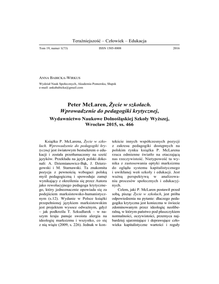 Teraźniejszość – Człowiek – Edukacja Tom 19, numer 1(73) ISSN 1505-8808 2016 ANNA BABICKA-WIRKUS Wydział Nauk Społecznych, Akademia Pomorska, Słupsk e-mail: [email protected] Peter McLaren, Życie w szkołach. Wprowadzenie do pedagogiki krytycznej, Wydawnictwo Naukowe Dolnośląskiej Szkoły Wyższej, Wrocław 2015, ss. 466 Książka P. McLarena, Życie w szkołach. Wprowadzenie do pedagogiki krytycznej jest światowym bestselerem o edukacji i została przetłumaczony na sześć języków. Przekładu na język polski dokonali: A. Dziemianowicz-Bąk, J. Dzierzgowski i M. Starnawski. Ta znakomita pozycja z pewnością wzbogaci polską myśl pedagogiczną i spowoduje zamęt wynikający z określenia się przez Autora jako rewolucyjnego pedagoga krytycznego, który jednoznacznie opowiada się za podejściem marksistowsko-humanistycznym (s.12). Wydanie w Polsce książki przepełnionej językiem marksistowskim jest projektem wysoce odważnym, gdyż – jak podkreśla T. Szkudlarek – w naszym kraju panuje swoista alergia na ideologię marksizmu i wszystko, co się z nią wiąże (2009, s. 226). Jednak w kon- tekście innych współczesnych pozycji z zakresu pedagogiki dostępnych na polskim rynku książka P. McLarena rzuca odmienne światło na otaczającą nas rzeczywistość. Nietypowość ta wynika z zastosowania optyki marksizmu do oglądu systemu kapitalistycznego i uwikłanej weń szkoły i edukacji. Jest ważną perspektywą w analizowaniu procesów społecznych i edukacyjnych. Celem, jaki P. McLaren postawił przed sobą, pisząc Życie w szkołach, jest próba odpowiedzenia na pytanie: dlaczego pedagogika krytyczna jest konieczna w świecie zdominowanym przez ideologię neoliberalną, w którym państwo pod płaszczykiem normalności, oczywistości, przemyca najbardziej ujarzmiające i deprawujące człowieka kapitalistyczne wartości i reguły 174 Anna BABICKA-WIRKUS postępowania? Czy cel ten został osiągnięty? Książka Życie w szkołach. Wprowadzenie do pedagogiki krytycznej, poza wstępami (Wstęp do wydania polskiego, Wstęp), przedmowami (Przedmowa, Przedmowa do wydania trzeciego) i epilogiem składa się z pięciu części i aneksu, w którym zawarty jest wywiad z P. McLarenem przeprowadzony przez José Marię Barroso Tristána, a także informacje o rewolucyjnym pedagogu oraz indeks nazwisk przywoływanych się w tekście. Część pierwsza książki nosi tytuł Klasa – rozejść się. Autor odwołuje się tu do dwóch definicji klasy – w znaczeniu społeczno-ekonomicznym i szkolnym. Klasa bowiem jest istotnym aspektem różnicującym ludzi w świecie kapitalizmu. Dzieli ona jednostki na właścicieli środków produkcji (kapitaliści – 1% społeczeństwa) i tych, którzy sprzedają swoją pracę (pracujący/robotnicy – 99% społeczeństwa). Jak stwierdza Autor: (Kapitalizm ma – A.B.-W.) (...) straszliwą zdolność psychologizowania głęboko zakorzenionych (choć warunkowych) hierarchii władzy i przywileju, przedstawiania ich jako homogeniczne i prywatne doświadczenia indywidualne. W rezultacie dziewięćdziesiąt dziewięć procent mieszkańców świata sądzi, że to wyłącznie oni sami są odpowiedzialni za swój ciężki los (s. 28). Pochodzenie społeczne, klasowe uczniów kształtuje ich codzienne doświadczenia, dlatego też powinno mieć istotne znaczenie dla nauczycieli i pedagogów, którzy z nimi pracują. Historia życia ucznia, jego codzienne doświadczenia są ważne w przestrzeni oddziaływań pedagogicznych. Tę tezę P. McLaren próbuje udowodnić, w mojej ocenie z pozytywnym skutkiem, przez całą książkę. Nie można oddzielić ucznia od jego kultury ulicznej, rządzącej się odmiennymi regułami od kultury szkoły, która narzuca uczniom dominujące wartości, normy i zasady. Radykalny pedagog przykłada ogromną wagę do codziennych doświadczeń uczniów dla kształcenia i wychowania w szkole. Ten wątek jest bardzo rozbudowany (również w innych rozdziałach) i zaświadcza o wyjątkowości omawianej książki. Jednocześnie Autor dostrzega znaczenie nauki praktycznych umiejętności matematycznych, informatycznych, analizowania tekstów kultury itp. Jednak skupienie się na codziennych doświadczeniach ucznia pomaga uświadomić sobie młodemu człowiekowi jego pozycję w świecie, a także zapoznać się z najróżniejszymi kontekstami i aspektami wyznaczającymi to położenie. Można zastanawiać się, w jaki sposób wykorzystać to doświadczenie uczniów. McLaren podpowiada: Doświadczenie można wykorzystać na zajęciach tematycznych poświęconych rozumieniu procesów gospodarczych, mediom i przekazywanym przez nie treściom, ekologii, umiejętnościom konsumenckim i innego rodzaju krytycznym umiejętnościom ważnym, gdy żyje się w nieregulowanym, globalnym kapitalizmie (s. 66). Odwoływanie się w analizach do własnych doświadczeń pozwoli uczniom rozwinąć „język krytyki” i „język możliwości”. Przełoży się to z kolei na umie- Peter McLaren, Życie w szkołach. Wprowadzenie do pedagogiki krytycznej... jętność krytycznej refleksji nad warunkami społeczno-gospodarczymi, w których żyją młodzi ludzie i na umiejętność krytycznego analizowania swojego położenia w świecie, a także relacji, jakie łączą jednostkę ze światem. Są to umiejętności niezbędne do świadomego uczestnictwa w rzeczywistości zawłaszczonej przez stosunki kapitalistyczne. Znaczenie pochodzenia klasowego dla kształcenia i wychowania młodych ludzi ma również kolejny wymiar. Chodzi mianowicie o praktykę, działanie. Pedagogika, która zorientowana jest na praktykę, pozwala według P. McLarena (...) wyprowadzić teorie na ulice (s. 67). Autor formułuje następujący pogląd: Twierdzę za Marksem, że jest konieczne, by nauczyciele dostrzegali sprzeczność „wolnej” i „powszechnej” edukacji w burżuazyjnym społeczeństwie, a także kwestionowali twierdzenie, jakoby edukacja mogła być „