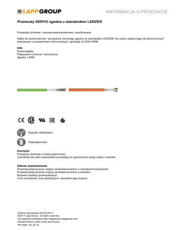 INFORMACJA O PRODUKCIE Przewody SERVO zgodne z standardem LENZE® Przewody silnikowe i resolwerowe/enkoderowe, certyfikowane Kable do serwomotorów i sprzężenia zwrotnego zgodne ze standardem LENZE®, do użytku statycznego lub dynamicznych zastosowań z prowadnicami łańcuchowymi, aprobaty UL/CSA AWM Info Serwonapędy Połączenia ruchome i nieruchome Zgodny z EMC Sygnały zakłócające Olejoodporność Korzyści Przewody silnikowe o niskiej pojemności Certyfikaty dla wielu standardów pozwalają na ograniczenie liczby części i kosztów Zakres zastosowania Przewód połączeniowy między serwosterownikiem a enkoderem/resolwerem Przewód połączeniowy między serwosterownikiem a silnikiem Budowa instalacji przemysłowych Linie montażowe, linie produkcyjne, wszystkie typy maszyn Ostania aktualizacja (04.03.2017) ©2017 Lapp Group - all rights reserved. Zarządzanie produktem http://lapppoland.lappgroup.com Aktualne dane w pliku Dane techniczne. PN 0456 / 02_03.16 INFORMACJA O PRODUKCIE Przewody SERVO zgodne z standardem LENZE® Normy i aprobaty Przewody enkoderowe i resolwerowe: UL AWM Style 2464 dla połączeń nieruchomych, UL AWM Style 21165 dla połączeń ruchomych, CSA AWM I/II A/B Przewód silnikowy: UL AWM Style 2570 dla połączeń nieruchomych, UL AWM Style 20940 dla połączeń ruchomych, CSA AWM I/II A/B UL File No. E63634 Zastosowanie w prowadnicach łańcuchowych: proszę postępować zgodnie z wytycznymi montażu - załącznik T3 Budowa produktu Budowa zgodnie ze standardem LENZE® Płaszcz zewnętrzny z PVC, izolacja żyły PP, stosowany w połączeniach nieruchomych Płaszcz zewnętrzny z PUR, izolacja żyły TPE, stosowany w połączeniach ruchomych Dalsze informacje: Specyfikacja techniczna Przewody sygnałowe: zielone (RAL 6018) Serwoprzewód: pomarańczowy (RAL 2003) Dane techniczne Klasyfikacja: ETIM 5.0 Class-ID: EC000104 Opis klasy ETIM 5.0: Przewód sterowniczy Oznaczenie żył: Przewody enkoderowe - 7072508 (połączenia nieruchome) bk/ye+bk/gn+bk/rd+bk/bu+bk/wh- 7072517 (połączenia ruchome) gn/ye+bu/rd+gy/pk+bk/vt+bn/wh Przewody resolwerowe:- 7072507 ( połączenia nieruchome) bk/ye+bk/gn+bk/rd+bk/wh- 7072516 ( połączenia ruchome) gn/ye+bu/rd+gy/pk+bn/wh Minimalny promień gięcia: Połączenia ruchome: 10 x średnica zewnętrzna Połączenia nieruchome: 7,5 x średnica zewnętrzna Napięcie nominalne: Przewody sygnałowe: 30 V (VDE), 300 V (UL/CSA) Przewody zasilające- żyły zasilające: U 0 /U 0.6/1 kV (VDE),600 V (UL/CSA)- żyły sterownicze:24 V (VDE)600 V (UL/CSA) Żyła ochronna: G = z żyłą ochronną żółto - zieloną Zakres temperatury: Połączenia ruchome: od -5°C do +70°C Połączenia nieruchome: od -40°C do +80°C Wskazówka Wszystkie podane wartości dotyczące produktów są wartościami nominalnymi w temperaturze pokojowej (o ile nie wskazano inaczej). Szczegółowe wartości (np. tolerancje) są dostępne na zamówienie. Standardowe odcinki proszę sprawdzić na: www.lapppolska.pl Rodzaj opakowania: krążek ≤ 30 kg lub ≤ 250 m, w przeciwnym razie bęben Prosimy określić wielkość opakowania (np. 1 x 500 m bęben lub 5 x 100 m krążek) Nazwy produktów firmy Lenze® (EWLM_, EWLR_, EWLE_, EWLL_, EYL i EYP) są zarejestrowanymi znakami towarowymi firmy Lenze® AG i służą tylko do celów porównawczych. DESINA® jest zastrzeżoną marką Związku Niemieckich Fabryk Obrabiarek. Przewody do prowadnic łańcuchowych przed zainstalowaniem powinny być magazynowane tylko na bębnach. Numer katalogowy odnosi się do oryginalnych produktów firmy LAPP Fotografie nie mogą być używane do wymiarowania oraz nie stanowią szczegółowego odwzorowania przedstawionych produktów. * Podane ceny to ceny netto bez podatku VAT i dodatkowych opłat. Sprzedaż klientom biznesowym. Ostania aktualizacja (04.03.2017) ©2017 Lapp Group - all rights reserved. Zarządzanie produktem http://lapppoland.lappgroup.com Aktualne dane w pliku Dane techniczne. PN 0456 / 02_03.16 Powered by TCPDF (www.tcpdf.org) Liczba żył i przekrój [mm²] Średnica zewnętrzna [mm] Indeks miedzi [kg/km] Waga [kg/km] Przewody silnikowe do połączeń nieruchomych 7072500 4 G 1,0 + (2 x 0,5) 10 81 128 7072501 4 G 1,5 + (2 x 0,5) 11,2 106 173 7072502 4 G 2,5 + (2 x 0,5) 12,3 153 244 Przewód enkoderowy z płaszczem zewnętrznym z PVC, ekranowany do połączeń nieruchomych 7072507 3 x (2 x 0,14) + 1 x (2 x 0,5) 9,3 43 91 7072508 4 x (2 x 0,14) + 1 x (2 x 1,0) 11 65 136 Przewody silnikowe do pracy w prowadnicach łańcuchowych 7072509 4 G 1,0 + (2 x 0,5) 10 81 151 7072510 4 G 1,5 + (2 x 0,5) 11,5 106 192 7072511 4 G 2,5 + (2 x 0,5) 13,2 153 271 7072512 4 G 4 + (2 x 1,0) 14,6 235 373 7072513 4 G 6 + (2 x 1,0) 16,8 316 477 7072514 4 G 10 + (2 x 1,0) 20,1 513 710 7072515 4 G 16 + (2 x 1,0) 23,8 710 1015 Przewód reslwerowy i enkoderowy do pracy w prowadnicach łańcuchowych 7072516 3 x (2 x 0,14) + 1 x (2 x 0,5) 10 44 107 7072517 4 x (2 x 0,14) + 1 x (2 x 1,0) 11,5 65 145 Przewody SERVO zgodne z standardem LENZE® Ostania aktualizacja (04.03.2017) ©2017 Lapp Group - all rights reserved. Zarządzanie produktem http://lapppoland.lappgroup.com Aktualne dane w pliku Dane techniczne. PN 0456 / 02_03.16 INFORMACJA O PRODUKCIE Powered by TCPDF (www.tcpdf.org) Numer katalogowy