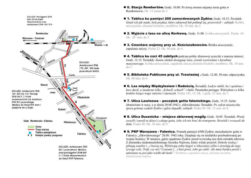 n 0. Stacja Rembertów. Godz. 10.00. Po lewej stronie mijamy teren getta w Rembertowie. Ok. 15 minut do 1. n 1. Tablica ku pamięci 200 zamordowanych Żydów. Godz. 10.15. Świadek: Gnali ich jak stado, byle prędzej, który odstawał lub potknął się, przewrócił – zabijali. Krótka uroczystość, złożenie kwiatów, modlitwa. Ok. 30 min. do 2. n 2. Wyjście z lasu na ulicę Korkową. Godz. 11.00. Krótka uroczystość. Psalm 44. Ok. 20 min. do 3. n 3. Cmentarz wojenny przy ul. Kościuszkowców. Krótka uroczystość, zapalenie zniczy. Psalm 22. Ok. 40 min. do 4. n 4. Tablica ku czci 45 zabitych podczas próby zbiorowej ucieczki z marszu śmierci. Godz. 12.15. Świadek: Zanim zdołali dosięgnąć lasu, zostali wystrzelani z karabinu maszynowego. Krótka uroczystość, zapalenie zniczy,złożenie kwaitów, modlitwa. Ok. 10 min. do 5. n 5. Biblioteka Publiczna przy ul. Trawiastej . Godz. 12.40. 30 min. odpoczynku. Ok. 60 min. do 6. n 6. Las między Międzylesiem i Radością. Świadek: Ludzie słabli, bo i spiekota i kurz dusił, a żandarmi tylko „Schnell, schnell” i tłukli. Pasażerka pociągu: Widziałam co kilka kroków leżące trupy starców i staruszek. Psalm 143, 14. Ok. 1 godz. 25 min. do 7. n 7. Ulica Lawinowa – początek getta falenickiego. Godz. 15.35. Getto obstawiono w nocy, a w dzień 20.08.1942 r. zlikwidowano. Świadek: Po całym miasteczku (poza gettem) szukali Żydów i gdzie dopadli, zabijali. Psalm 94. Ok. 15 min. do 8. n 8. Ulica Dusznicka – miejsce zbiorowej mogiły. Godz. 16.05. Świadek: Wtedy zwozili i znosili te dzieci z całego getta, żeby ich nie brać do transportu. Strzelali i wrzucali do dołu. Psalm 88. Ok. 10 min. do 9. n 9. PKP Warszawa - Falenica. Pomnik pamięci 6500 Żydów, mieszkańców getta w Falenicy „zlikwidowanego” 20.08. 1942 roku. Znajduje się on niedaleko przebudowanej po wojnie bożnicy. W miejscu, gdzie spędzono Żydów przed wywózką stoi dziś ośrodek zdrowia. Z dziennika siedemnastoletniego Szymka Najwera, który wtedy przeżył: Dokoła siedzą i pilnują szaulisi (...) bawią się. Wybierają sobie kogoś w stłoczonej ciżbie i strzelają do tego żywego celu. Trafi, czy nie? Czasami (…) ktoś prosi, żeby go zabić. Ale musi bardzo prosić i udzielane to jest jako wielki akt łaski”. Modlitwa, zapalenie zniczy, złożenie kwiatów. Zakończenie marszu. Uczcijmy 70-tą rocznicę „marszu śmierci”, jaki odbyli 20 sierpnia 1942 pozostali jeszcze przy życiu Żydzi z Rembertowa. Kolumnę złożoną z ponad tysiąca osób konni żandarmi niemieccy pędzili do Falenicy; tych, którzy zdołali dojść, razem z tysiącami Żydów falenickich załadowano do wagonów, które odjechały do obozu zagłady w Treblince. Całą trasę . marszu znaczyły zwłoki tych, których zamordowano po drodze. Zbiórka 20 maja 2012 roku w niedzielę, o godzinie 10.00 przed stacja kolejową Warszawa – Rembertów przy ulicy Cyrulików. Trasa liczy ok. 15 kilometrów – w sumie około czterech godzin marszu – do stacji kolejowej Falenica. Istnieje możliwość dołączenia do trasy w miejscach oznaczonych na mapce. Marsz nie ma być wycieczką ani rajdem, ale rodzajem pielgrzymki. W trakcie kolejnych przerw przewidziane są modlitwy i wspólne czytanie psalmów. Prosimy o odpowiednie zachowanie, pełne szacunku w stosunku do ofiar zbrodni (wyciszenie telefonów komórkowych, powstrzymanie się od głośnych rozmów, śmiechów itp.) . W każdym punkcie trasy można dołączyć do Marszu Mapa dostępna na: www.wawer.warszawa.pl, www.rembertow.waw.pl, www.facebook.com/pamiecfalenica Organizatorzy: R R E M E B M W E B E A W R T R T W A W I A N I Ę D Z Y L W R E N I Ó W E A M Ó R N N E S I E M I Ę D Z Y L E S I E R A D O R A D O M I F A F A E D L L Z E E N E N Ś Ć Ś S Z I I Ć Y C C Komitet Upamiętnienia Zagłady Getta w Falenicy i Rembertowie Paweł Przyrowski, Piotr Bieliński, Jacek Borkowicz, Magdalena Borkowska, Ewa Jaskólska, Leszek Korneluk, Zbigniew Kozłowski, Wiktor Kulerski, Jolanta Pełka, Etel Szyc, Maria Tuszko, Mariusz Umecki. Współorganizatorzy: Urząd Dzielnicy Rembertów m.st. Warszawy Urząd Dzielnicy Wawer m.st. Warszawy Biblioteka Publiczna w Dzielnicy Wawer m.st. Warszawy 20 MAJA 2012 MARSZ PAMIĘCI N A A