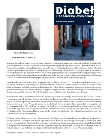 Gabriela Będkowska Diabeł mieszka w Polsce B Schemat jest dobrze znany: reportażysta z zamożnej aglomeracji wsiada do pociągu i jedzie na wschód, żeby „poznać prawdziwą Polskę”. Przytoczy dane z Wikipedii dotyczące liczby mieszkańców. Opisze kościółek w centrum miasta, sklepik z ławką dla piwoszy i zdemolowane przystanki autobusowe. Obowiązkowo będzie o biedzie i przemocy domowej, nastoletnich matkach i ojcach nadużywających alkoholu. O popegeerowskim bezrobociu i braku perspektyw dla młodych. O wszechwładnym proboszczu i homoseksualistach boksujących się ze swoją orientacją. O ciasnych, zagrzybionych mieszkaniach, opłacanych z pensji, za którą warszawiak nie wstałby rano z łóżka. Szczęśliwe zakończenia i optymistyczne formułki do takich tematów niezbyt pasują. Paweł Reszka – uznany dziennikarz współpracujący z „Gazetą Wyborczą” - nie dał się zupełnie stłamsić przez ten kanon. W zbiorze jego reportaży „Diabeł i tabliczka czekolady” są mieszkania socjalne, ale jest i kobieta, która w jednym z nich żyje szczęśliwie. Pojawia się gej – ale o dziwo, pogodzony ze swoją orientacją. Są prowincjonalne stereotypy, ale i 60-latka kipiąca dobrym samopoczuciem. Jest ojciec tak ubogi, że oddaje krew, aby dostać czekoladę dla pociech. Ale jest też matka, która zwłoki swoich dzieci ukrywa w beczce. Paweł Reszka dobrze poznał Lubelszczyznę. Wydaje się, że zna i rozumie jej mieszkańców. Nie osądza, a słucha i rzetelnie notuje ich historie. Pojawia się rzadko, chyłkiem, pozwalając grać swoim bohaterom najważniejszą rolę w każdym z reportaży. Rozmawia z osobami duchownymi i mordercami, homoseksualistami i kobietą, którą uwiódł sam Jezus. Wraca do głośnych, medialnych spraw, ale pisze też o czymś tak prozaicznym jak przydomowa toaleta. Do każdego z tematów i do każdego z rozmówców podchodzi z szacunkiem i bez założonych tez. Jego język jest oszczędny, ale i lekki. Paweł Reszka puści czasem oko do czytelnika, a czasem woli być bardzo serio. Nie musi poddawać wypowiedzi bohaterów retuszowi – bo i obraz Lubelszczyzny, który się z nich wyłania jest go pozbawiony. Wydanie zbioru własnych reportaży to ryzykowne przedsięwzięcie. Pawłowi Reszce nie udało się utrzymać wysokiego poziomu każdego z nich. Obok reportaży bardzo dobrych, przykuwających uwagę od pierwszych zdań, są też te nieszczególnie udane, ze zbyt nachalnie wytłuszczoną frazą definiującą szczęście. „Diabeł i czekolada” to wciąż jednak efekt skrupulatnej, solidnej reporterskiej pracy. Od pułapek sztampy nie udało się Reszce zupełnie uciec, ale jego Polska B ma więcej twarzy niż tylko księży-pedofilów i niedożywionych dzieci. Paweł Piotr Reszka „Diabeł i tabliczka czekolady” wyd. Agora