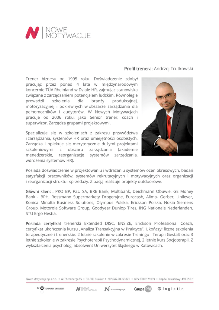 Profil trenera: Andrzej Trutkowski Trener biznesu od 1995 roku. Doświadczenie zdobył pracując przez ponad 4 lata w międzynarodowym koncernie TÜV Rheinland w Dziale HR, zajmując stanowiska związane z zarządzaniem potencjałem ludzkim. Równolegle prowadził szkolenia dla branży produkcyjnej, motoryzacyjnej i pokrewnych w obszarze zarządzania dla pełnomocników i audytorów. W Nowych Motywacjach pracuje od 2006 roku, jako Senior trener, coach i superwizor. Zarządza grupami projektowymi. Specjalizuje się w szkoleniach z zakresu przywództwa i zarządzania, systemów HR oraz umiejętności osobistych. Zarządza i opiekuje się merytorycznie dużymi projektami szkoleniowymi z obszaru zarządzania (akademie menedżerskie, reorganizacje systemów zarządzania, wdrożenia systemów HR). Posiada doświadczenie w projektowaniu i wdrażaniu systemów ocen okresowych, badań satysfakcji pracowników, systemów rekrutacyjnych i motywacyjnych oraz organizacji i reorganizacji struktur sprzedaży. Z pasją realizuje projekty outdoorowe. Główni klienci: PKO BP, PZU SA, BRE Bank, Multibank, Deichmann Obuwie, GE Money Bank - BPH, Rossmann Supermarkety Drogeryjne, Eurocash, Alima- Gerber, Unilever, Konica Minolta Business Solutions, Olympus Polska, Ericsson Polska, Nokia Siemens Group, Motorola Software Group, Goodyear Dunlop Tires, ING Nationale Nederlanden, STU Ergo Hestia. Posiada certyfikat trenerski Extended DISC, ENSIZE, Erickson Professional Coach, certyfikat ukończenia kursu „Analiza Transakcyjna w Praktyce”. Ukończył liczne szkolenia terapeutyczne i trenerskie: 2 letnie szkolenie w zakresie Treningu i Terapii Gestalt oraz 3 letnie szkolenie w zakresie Psychoterapii Psychodynamicznej, 2 letnie kurs Socjoterapii. Z wykształcenia psycholog, absolwent Uniwersytet Śląskiego w Katowicach.