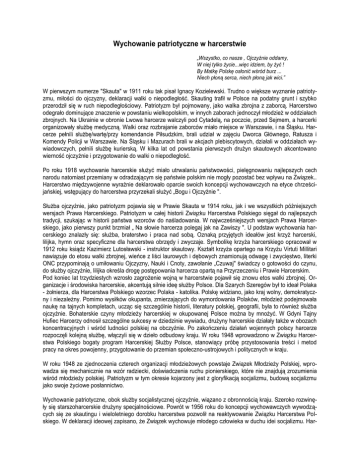 Wychowanie patriotyczne w harcerstwie „Wszystko, co nasze , Ojczyźnie oddamy, W niej tylko życie...więc idziem, by żyć ! By Matkę Polskę osłonić wśród burz ... Niech płoną serca, niech płoną jak wici.” W pierwszym numerze "Skauta" w 1911 roku tak pisał Ignacy Kozielewski. Trudno o większe wyznanie patriotyzmu, miłości do ojczyzny, deklaracji walki o niepodległość. Skauting trafił w Polsce na podatny grunt i szybko przerodził się w ruch niepodległościowy. Patriotyzm był pojmowany, jako walka zbrojna z zaborcą. Harcerstwo odegrało dominujące znaczenie w powstaniu wielkopolskim, w innych zaborach jednoczył młodzież w oddziałach zbrojnych. Na Ukrainie w obronie Lwowa harcerze walczyli pod Cytadelą, na poczcie, przed Sejmem, a harcerki organizowały służbę medyczną. Walki oraz rozbrajanie zaborców miało miejsce w Warszawie, i na Śląsku. Harcerze pełnili służbę/wartę/przy komendancie Piłsudzkim, brali udział w zajęciu Dworca Głównego, Ratusza i Komendy Policji w Warszawie. Na Śląsku i Mazurach brali w akcjach plebiscytowych, działali w oddziałach wywiadowczych, pełnili służbę kurierską. W kilka lat od powstania pierwszych drużyn skautowych akcentowano wierność ojczyźnie i przygotowanie do walki o niepodległość. Po roku 1918 wychowanie harcerskie służyć miało utrwalaniu państwowości, pielęgnowaniu najlepszych cech narodu natomiast przemiany w odradzającym się państwie polskim nie mogły pozostać bez wpływu na Związek.. Harcerstwo międzywojenne wyraźnie deklarowało oparcie swoich koncepcji wychowawczych na etyce chrześcijańskiej, wstępujący do harcerstwa przyrzekali służyć „Bogu i Ojczyźnie ". Służba ojczyźnie, jako patriotyzm pojawia się w Prawie Skauta w 1914 roku, jak i we wszystkich późniejszych wersjach Prawa Harcerskiego. Patriotyzm w całej historii Związku Harcerstwa Polskiego sięgał do najlepszych tradycji, szukając w historii państwa wzorców do naśladowania. W najwcześniejszych wersjach Prawa Harcerskiego, jako pierwszy punkt brzmiał „ Na słowie harcerza polegaj jak na Zawiszy ". U podstaw wychowania harcerskiego znalazły się: służba, braterstwo i praca nad sobą. Oznaką przyjętych ideałów jest krzyż harcerski, lilijka, hymn oraz specyficzne dla harcerstwa obrzędy i zwyczaje. Symbolikę krzyża harcerskiego opracował w 1912 roku ksiądz Kazimierz Lutosławski - instruktor skautowy. Kształt krzyża opartego na Krzyżu Virtuti Millitari nawiązuje do etosu walki zbrojnej, wieńce z liści laurowych i dębowych znamionują odwagę i zwycięstwo, literki ONC przypominają o umiłowaniu Ojczyzny, Nauki i Cnoty, zawołanie „Czuwaj" świadczy o gotowości do czynu, do służby ojczyźnie, lilijka określa drogę postępowania harcerza opartą na Przyrzeczeniu i Prawie Harcerskim. Pod koniec lat trzydziestych wzrosło zagrożenie wojną w harcerstwie pojawił się znowu etos walki zbrojnej. Organizacje i środowiska harcerskie, akcentują silnie ideę służby Polsce. Dla Szarych Szeregów był to ideał Polaka - żołnierza, dla Harcerstwa Polskiego wzorzec Polaka - katolika. Polskę widziano, jako kraj wolny, demokratyczny i niezależny. Pomimo wysiłków okupanta, zmierzających do wymordowania Polaków, młodzież podejmowała naukę na tajnych kompletach, ucząc się szczególnie historii, literatury polskiej, geografii, była to również służba ojczyźnie. Bohaterskie czyny młodzieży harcerskiej w okupowanej Polsce można by mnożyć. W Gdyni Tajny Hufiec Harcerzy odnosił szczególne sukcesy w dziedzinie wywiadu, drużyny harcerskie działały także w obozach koncentracyjnych i wśród ludności polskiej na obczyźnie. Po zakończeniu działań wojennych polscy harcerze rozpoczęli kolejną służbę, włączyli się w dzieło odbudowy kraju. W roku 1948 wprowadzono w Związku Harcerstwa Polskiego bogaty program Harcerskiej Służby Polsce, stanowiący próbę przystosowania treści i metod pracy na okres powojenny, przygotowanie do przemian społeczno-ustrojowych i politycznych w kraju. W roku 1948 ze zjednoczenia czterech organizacji młodzieżowych powstaje Związek Młodzieży Polskiej, wprowadza się mechanicznie na wzór radziecki, doświadczenia ruchu pionierskiego, które nie znajdują zrozumienia wśród młodzieży polskiej. Patriotyzm w tym okresie kojarzony jest z gloryfikacją socjalizmu, budową socjalizmu jako swoje życiowe posłannictwo. Wychowanie patriotyczne, obok służby socjalistycznej ojczyźnie, wiązano z obronnością kraju. Szeroko rozwinęły się starszoharcerskie drużyny specjalnościowe. Powrót w 1956 roku do koncepcji wychowawczych wywodzących się ze skautingu i wieloletniego dorobku harcerstwa pozwolił na reaktywowanie Związku Harcerstwa Polskiego. W deklaracji ideowej zapisano, że Związek wychowuje młodego człowieka w duchu idei socjalizmu. Har- cerstwo z jednej strony odwoływało się do społecznych potrzeb, z drugiej zaś strony do tradycji skautowych. W ideale wychowawczym pojawiły się takie wartości, jak uspołecznianie, aktywność, dążenie do postępu i sprawiedliwości społecznej, walka o równość i wolność ludzi. Patriotyzm utożsamiany jest ze służbą socjalistycznej ojczyźnie, wychowaniem obronnym, działalnością społeczną, przyjaźnią. Szeroko rozwinęły się specjalistyczne drużyny starszoharcerskie, a rok 1968 zapoczątkował organizację manewrów techniczno - obronnych, jako największe przedsięwzięcie patriotyczno - obronne. Rok 1973 przynosi następne zmiany, Związek Harcerstwa Polskiego wraz z pozostałymi organizacjami młodzieżowymi utworzył Federację Socjalistycznych Związków Młodzieży Polskiej. Kolejny przełom w koncepcjach patriotyczno wychowawczych Związku nastąpił w latach 1980 - 1981. Harcerstwo powróciło do swoich korzeni. Silnie zaakcentował swoją obecność nurt programowo - metodyczny postulującą odnowę harcerstwa. W dziedzinie wychowa