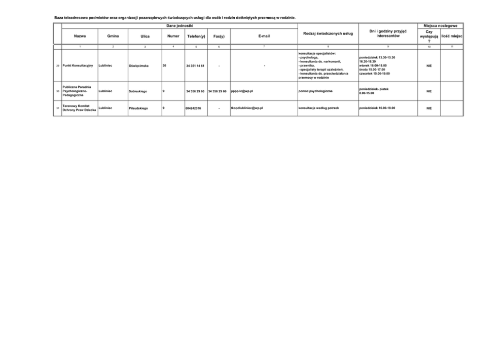 Baza teleadresowa podmiotów oraz organizacji pozarządowych świadczących usługi dla osób i rodzin dotkniętych przemocą w rodzinie. Dane jednostki Miejsca noclegowe Nazwa Gmina Ulica Numer Telefon(y) Fax(y) E-mail 1 2 3 4 5 6 7 29 Punkt Konsultacyjny Lubliniec Oświęcimska 30 34 351 14 61 30 Publiczna Poradnia PsychologicznoPedagogiczna Lubliniec Sobieskiego 9 34 356 29 66 31 Terenowy Komitet Lubliniec Ochrony Praw Dziecka Piłsudskiego 9 604242316 - Dni i godziny przyjęć interesantów 8 9 Czy występują Ilość miejsc ? 10 konsultacje specjalistów: - psychologa, - konsultanta ds. narkomanii, - prawnika, - specjalisty terapii uzależnień, - konsultanta ds. przeciwdziałania przemocy w rodzinie poniedziałek 13.30-15.30 16.30-18.30 wtorek 16.00-18.00 środa 15.00-17.00 czwartek 15.00-19.00 NIE [email protected] pomoc psychologiczna poniedziałek- piatek 8.00-15.00 NIE [email protected] konsultacje według potrzeb poniedziałek 16.00-18.00 NIE - - 34 356 29 66 Rodzaj świadczonych usług 11