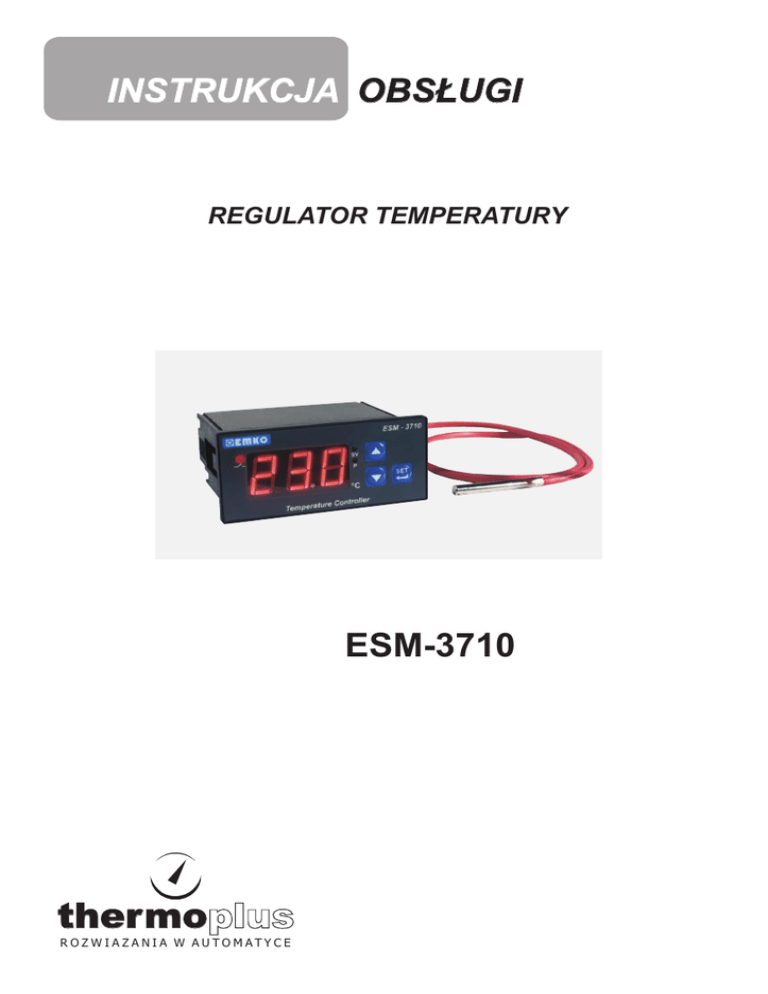 INSTRUKCJA OBS£UGI REGULATOR TEMPERATURY ESM-3710 thermoplus R OZ W I A Z A N I A W A U TO M ATY C E 1. CHARAKTERYSTYKA REGULATORA Regulator temperatury mikroprocesorowy przeznaczony do wspó³pracy z czujnikami rezystancyjnymi Pt100 i PTC oraz termoparami J lub K. Wybór czujnika temperatury dokonuje siê wg. kodu zamawiania z karty katalogowej. Tryb pracy: "grzanie" lub "ch³odzenie" wybiera siê w menu regulatora. Regulator posiada 1 wyjœcie przekaŸnikowe. Wyposa¿ony jest w funkcjê kalibracji czujnika temperatury i nastawy histerezy. Posiada równie¿ funkcjê ochrony agregatu dla aplikacji ch³odniczych. Obs³uga regulatora i nastawa temperatury jest bardzo prosta i intuicyjna i nie wymaga wykwalifikowanej obs³ugi. Dziêki temu regulator znajduj¹ szerokie zastosowanie w prostych uk³adach regulacji temperatury takich jak: piece suszarnicze, cegielnie, maszyny przetwórstwa tworzyw sztucznych, piece piekarnicze i w przemyœle spo¿ywczym. Monta¿ w tablicy za pomoc¹ do³¹czonych uchwytów mocuj¹cych. 2. DANE TECHNICZNE WEJŒCIE: Czujnik rezystancyjny: PTC, Pt100 Termoelementy: J, K KONTROLA PRACY: Algorytm regulacji: dwustawny ON-OFF z histerez¹ Nastawa: z klawiatury foliowej Zakresy regulacji (patrz sposób zamawiania): -50...+150°C ;-50...400°C; 19,9...99,9°C; 0...999°C; 0...800°C Tryb pracy: rewersyjny (grzanie) lub bezpoœredni (ch³odzenie) Czas próbkowania: < 0,330ms WYJŒCIE: 1 przekaŸnikowe prze³¹czne 10(3)A SPDT 250VAC lub 1 pó³przewodnikowe SSR (12VDC/20mA) Wyœwietlacz: LED, 3 cyfry, czerwony o wysokoœci 14mm Dok³adnoœæ: ±1% zakresu pomiarowego Rozdzielczoœæ: 0,1°C (dla Pt100 -19,9...99,9°C), pozosta³e 1°C Kompensacja zimnych koñców termopar: automatyczna ± 0.1°C/1°C WARUNKI U¯YTKOWANIA: Temperatura otoczenia: 0...50°C Wilgotnoœæ wzglêdna: 0...90%Rh (bez kondensacji) Zasilanie: 230VAC ±10% 50Hz (opcja 12VAC/DC lub 24VAC) Pobór mocy: 1,5 VA Separacja galwaniczna: 2kV Klasa zanieczyszczenia: II Instalacja podstawowa DANE MONTA¯OWE: Obudowa: tablicowa PC+ABS UL94V0 Wymiary obudowy (sz x w x g³): 77 x 35 x 58,5mm (1/4 DIN 43700) Wymiary otworu monta¿owego: 71 x 29mm 1 Stopieñ ochrony: IP65 od frontu, IP20 od ty³u 3. SPOSÓB ZAMAWIANIA ESM3710 Kod: 3 5 6 Zasilanie: 24V (±15%) 50/60Hz (opcja) 230V (±15%) 50/60Hz 12V (±15%) 50/60Hz (opcja) Zakres regulacji: 150°C -50°C 0°C 800°C 0°C 999°C -50°C 400°C -19.9°C 99.9°C Wejœcie pomiarowe: PTC (w komplecie) J (Fe CuNi) K (NiCr Ni ) PT 100 PT 100 0 - Interfejs do komunikacji: brak Kod: 12 05 10 11 09 Kod: 0 Wyjœcie: Kod: 1 Wyjœcie przekaŸnikowe SPDT 10A(3)250V 2 Wyjœcie na przekaŸnik pó³przewodnikowy SSR (opcja) Przyk³ad: ESM3710-5-12-0-1 - Regulator z czujnikiem PTC w komplecie o zakresie -50...+150°C i rozdzielczoœci 1°C oraz jednym wyjœciem przekaŸnikowym, zasilanie sieciowe 230VAC ESM3710-5-09-0-1 - Regulator z wejœciem Pt100 o zakresie -19,9...+99,9°C i rozdzielczoœci 0,1°C oraz jednym wyjœciem przekaŸnikowym, zasilanie sieciowe 230VAC. 4. PANEL PRZEDNI. dioda do sygnalizowania trybu nastawy temperatury dioda do sygnalizowania trybu programowania klawisz zwiêkszaj¹cy wartoœæ dioda do sygnalizowania aktywacji wyjœcia wyœwietlacz LED SV P SET klawisz zmniejszaj¹cy wartoœæ klawisz trybu nastawy temp. i programowania 2 5. OBS£UGA REGULATORA. 5.1. ZMIANA TEMPERATURY ZADANEJ. Rozpocznij nastawê przyciskiem SET SV P SV P SET SET Dioda SV zapali siê. ZatwierdŸ nastawê przyciskiem SET SV P Przyciskami: lub nastaw ¿¹dan¹ wartoœæ temperatury. SET Dioda SV zgaœnie. Uwaga: Jeœli nie zatwierdzisz zmiany nastawy przyciskiem “SET”, w ci¹gu 20 sekund od ostatniego naciœniêcia przycisku, nastawa wróci do poprzedniej wartoœci. Informacja: Aby usprawniæ szybkie zwiêkszanie lub zmniejszanie wartoœci nastaw: przytrzymuj¹c klawisz lub stale przez minimum 5 sekund dziêsi¹te czêœci jednoœci zamieni¹ siê w jednoœci, a po 10 sekundach jednoœci w dziesi¹tki. 5.2. PROGRAMOWANIE PARAMETRÓW REGULATORA. SV P SET Rozpocznij nastawê parametrów trzymaj¹c przycisk SET przez 5 sek. SV P SET Naciskaj przycisk SET aby wybraæ parametr który chcesz zmieniæ. Dioda P zacznie migaæ. SV P SET Przyciskami: lub nastaw ¿¹dan¹ wartoœæ parametru. SET SV P SET Przyciskiem zatwierdza siê now¹ wartoœæ parametru i powraca do listy parametrów. Zakoñcz programowanie nie naciskaj¹c klawiszy przez 20 sekund. Informacja: Aby usprawniæ szybkie zwiêkszanie lub zmniejszanie wartoœci nastaw: przytrzymuj¹c klawisz lub stale przez minimum 5 sekund dziêsi¹te czêœci jednoœci zamieni¹ siê w jednoœci, a po 10 sekundach jednoœci w dziesi¹tki. 5.3. LISTA PARAMETRÓW. nazwa parametru wartoœæ domyœlna Histereza. Zakres nastawy zale¿y od wejœcia pomiarowego regulatora: dla PTC: 0...20°C; dla termopar: 0...100°C; dla Pt100 0...100°C lub 0,0...10,0 Ograniczenie dolnego zakresu temperatury zadanej. Zakres nastawy zale¿y od wejœcia pomiarowego regulatora: dla PTC: -50...SUH°C; dla termopar: 0...SUH°C; dla Pt100 0...SUH°C lub -19,9...SUH Ograniczenie górne zakresu temperatury zadanej. Zakres nastawy zale¿y od wejœcia pomiarowego regulatora: dla PTC: SUL...150°C; dla termopar: SUL...999°C; dla Pt100 SUL...400°C lub SUL...99,9 Wzorcowanie czujnika temperatury. Zakres zale¿y od wejœcia pomiarowego regulatora: dla PTC: -20...+20°C; dla termopar: -100...+100°C; dla Pt100 -100...+100°C lub -10,0...+10,0 HCS=0 Tryb pracy wyjœcia: 0 - grzanie; 1 - ch³odzenie HCS=1 Nastêpne parametry s¹ dostêpne tylko dla aplikacji ch³odniczych (HCS=1). OpóŸnienie za³¹czenia sprê¿arki po w³¹czeniu regulatora. Zakres: 0...20min Minimalny odstêp miêdzy za³¹czeniem sprê¿arki, a jej ostatnim wy³¹czeniem . Zakres: 0...20min. Minimalny odstêp miêdzy dwoma za³¹czeniami sprê¿arki. Zakres: 0...20min. PdF=0,1 Status wyjœcia przekaŸnikowego w razie uszkodzenia czujnika: 0 - wy³¹czony, 1 - w³¹czony, 2 - tryb awaryjny - patrz paramet