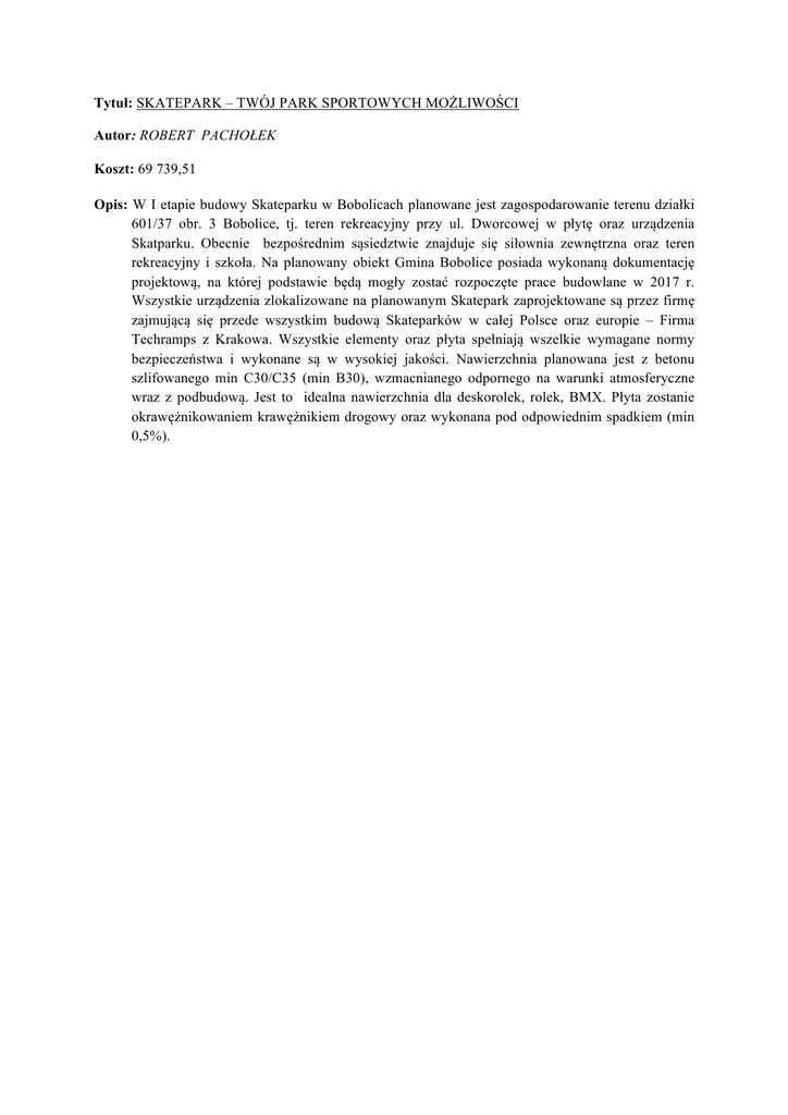 Tytuł: SKATEPARK – TWÓJ PARK SPORTOWYCH MOŻLIWOŚCI Autor: ROBERT PACHOŁEK Koszt: 69 739,51 Opis: W I etapie budowy Skateparku w Bobolicach planowane jest zagospodarowanie terenu działki 601/37 obr. 3 Bobolice, tj. teren rekreacyjny przy ul. Dworcowej w płytę oraz urządzenia Skatparku. Obecnie bezpośrednim sąsiedztwie znajduje się siłownia zewnętrzna oraz teren rekreacyjny i szkoła. Na planowany obiekt Gmina Bobolice posiada wykonaną dokumentację projektową, na której podstawie będą mogły zostać rozpoczęte prace budowlane w 2017 r. Wszystkie urządzenia zlokalizowane na planowanym Skatepark zaprojektowane są przez firmę zajmującą się przede wszystkim budową Skateparków w całej Polsce oraz europie – Firma Techramps z Krakowa. Wszystkie elementy oraz płyta spełniają wszelkie wymagane normy bezpieczeństwa i wykonane są w wysokiej jakości. Nawierzchnia planowana jest z betonu szlifowanego min C30/C35 (min B30), wzmacnianego odpornego na warunki atmosferyczne wraz z podbudową. Jest to idealna nawierzchnia dla deskorolek, rolek, BMX. Płyta zostanie okrawężnikowaniem krawężnikiem drogowy oraz wykonana pod odpowiednim spadkiem (min 0,5%).