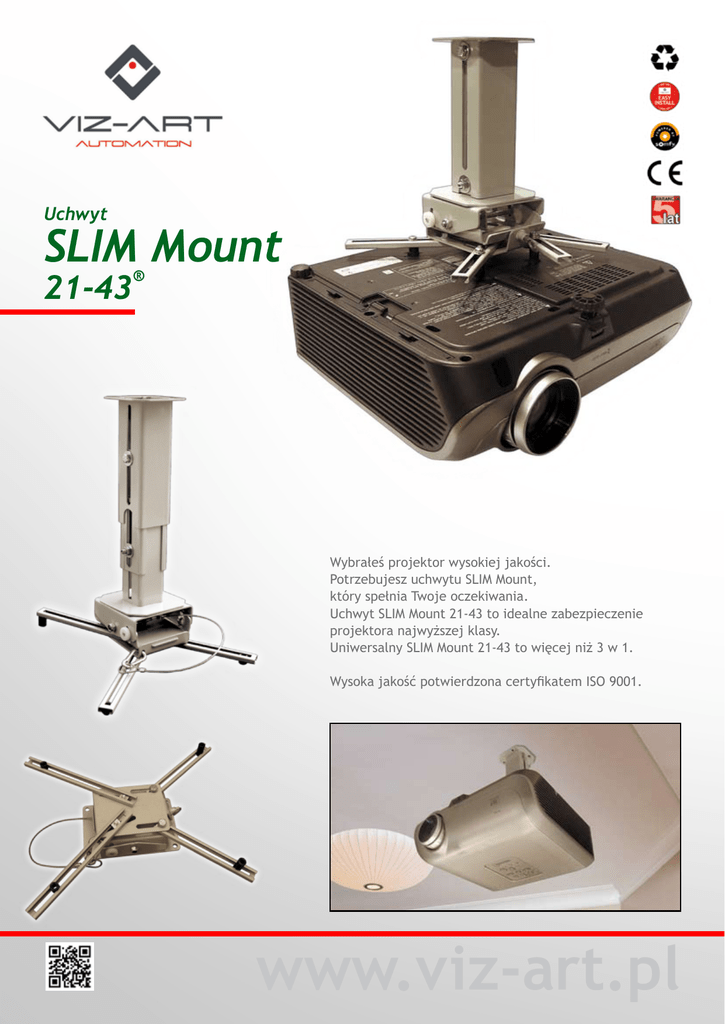 Uchwyt SLIM Mount ® 21-43 Wybrałeś projektor wysokiej jakości. Potrzebujesz uchwytu SLIM Mount, który spełnia Twoje oczekiwania. Uchwyt SLIM Mount 21-43 to idealne zabezpieczenie projektora najwyższej klasy. Uniwersalny SLIM Mount 21-43 to więcej niż 3 w 1. Wysoka jakość potwierdzona certyfikatem ISO 9001. www.viz-art.pl Uchwyt SLIM Mount ® 21-43 Opis produktu SLIM Mount 21-43 o wyjątkowej konstrukcji zapewnia szeroki zakres regulacji i pochylenia projektora w każdej płaszczyźnie. SLIM Mount 21-43 jest najlepszym wyborem do wymagających projektów. Zastosowanie SLIM Mount 21-43 dedykowany do projektorów wysokiej klasy. Idealnie sprawdza się w ekskluzywnych wnętrzach Kina Domowego, salach konferencyjnych oraz na uczelniach. Funkcjonalność SLIM Mount 21-43 to konstrukcja dopasowana do każdego projektora. Autorski systemem prowadzenie kabli oraz łatwa regulacja uchwytu to płynne ustawienie projektora pod każdym kątem. SLIM Mount 21-43 posiada najszerszy zakres regulacji i wysięgu. Troszczymy się o ekologię. Segregujemy pozostałości poprodukcyjne. Szanujemy Twój czas. Produkty wykonane są precyzyjnie, zapewniając szybki montaż. Produkcja wykonywana w Polsce. Nie importujemy produktów z Azji. Bezpieczeństwo użytkowania dla dzieci i osób starszych. Produkty wykonywane przez osoby dorosłe. Nie popieramy pracy dzieci. Wygoda instalacji Wybierz miejsce projekcji a SLIM Mount 21-43 zapewni bezpieczeństwo i 100 % komfortu użytkowania projektora. Przemyślane rozwiązania to cechy charakterystyczne dla VIZ-ART. Miejsca użytkowania: •sale szkoleniowe i gabinety •Kino Domowe •teatry, muzea •wystawy i kluby Uchwyt SLIM Mount 21-43 Odległość instalacyjna 21-43 cm Masa własna 1,5 kg Udźwig 15 kg Wykończenie srebrno-popielaty lakier proszkowy Nastawność •góra/dół •prawo/lewo •pochylenie względem ekranu Wymiary • D – 135 mm • W – 90 mm • H – 210 mm Przestrzeń instalacyjna regulowana Okablowanie system prowadzenia kabli W zestawie •kompletny uchwyt •zestaw montażowy •szablon instalacyjny •instrukcja Bezpieczeństwo •stabilny system instalacji •linka zabezpieczająca Gwarancja 2 lata Produkcja VIZ-ART Polska wersja 07/02.05.2014