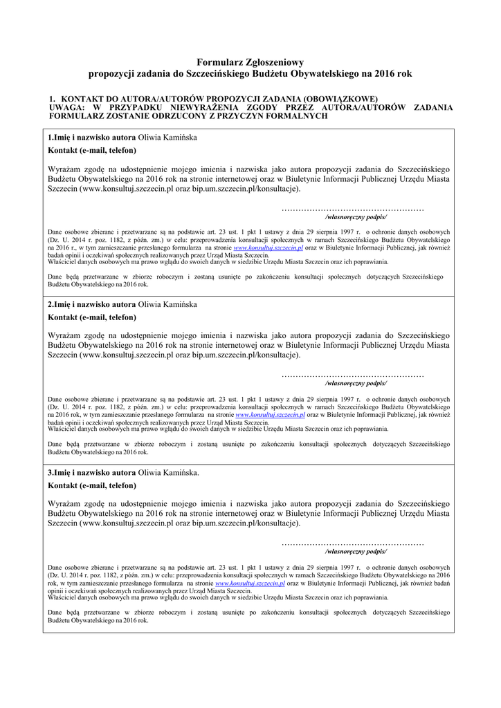 Formularz Zgłoszeniowy propozycji zadania do Szczecińskiego Budżetu Obywatelskiego na 2016 rok 1. KONTAKT DO AUTORA/AUTORÓW PROPOZYCJI ZADANIA (OBOWIĄZKOWE) UWAGA: W PRZYPADKU NIEWYRAŻENIA ZGODY PRZEZ AUTORA/AUTORÓW ZADANIA FORMULARZ ZOSTANIE ODRZUCONY Z PRZYCZYN FORMALNYCH 1.Imię i nazwisko autora Oliwia Kamińska Kontakt (e-mail, telefon) Wyrażam zgodę na udostępnienie mojego imienia i nazwiska jako autora propozycji zadania do Szczecińskiego Budżetu Obywatelskiego na 2016 rok na stronie internetowej oraz w Biuletynie Informacji Publicznej Urzędu Miasta Szczecin (www.konsultuj.szczecin.pl oraz bip.um.szczecin.pl/konsultacje). …………………………………………… /własnoręczny podpis/ Dane osobowe zbierane i przetwarzane są na podstawie art. 23 ust. 1 pkt 1 ustawy z dnia 29 sierpnia 1997 r. o ochronie danych osobowych (Dz. U. 2014 r. poz. 1182, z późn. zm.) w celu: przeprowadzenia konsultacji społecznych w ramach Szczecińskiego Budżetu Obywatelskiego na 2016 r., w tym zamieszczanie przesłanego formularza na stronie www.konsultuj.szczecin.pl oraz w Biuletynie Informacji Publicznej, jak również badań opinii i oczekiwań społecznych realizowanych przez Urząd Miasta Szczecin. Właściciel danych osobowych ma prawo wglądu do swoich danych w siedzibie Urzędu Miasta Szczecin oraz ich poprawiania. Dane będą przetwarzane w zbiorze roboczym i zostaną usunięte po zakończeniu konsultacji społecznych dotyczących Szczecińskiego Budżetu Obywatelskiego na 2016 rok. 2.Imię i nazwisko autora Oliwia Kamińska Kontakt (e-mail, telefon) Wyrażam zgodę na udostępnienie mojego imienia i nazwiska jako autora propozycji zadania do Szczecińskiego Budżetu Obywatelskiego na 2016 rok na stronie internetowej oraz w Biuletynie Informacji Publicznej Urzędu Miasta Szczecin (www.konsultuj.szczecin.pl oraz bip.um.szczecin.pl/konsultacje). …………………………………………… /własnoręczny podpis/ Dane osobowe zbierane i przetwarzane są na podstawie art. 23 ust. 1 pkt 1 ustawy z dnia 29 sierpnia 1997 r. o ochronie danych osobowych (Dz. U. 2014 r. poz. 1182, z późn. zm.) w celu: przeprowadzenia konsultacji społecznych w ramach Szczecińskiego Budżetu Obywatelskiego na 2016 rok, w tym zamieszczanie przesłanego formularza na stronie www.konsultuj.szczecin.pl oraz w Biuletynie Informacji Publicznej, jak również badań opinii i oczekiwań społecznych realizowanych przez Urząd Miasta Szczecin. Właściciel danych osobowych ma prawo wglądu do swoich danych w siedzibie Urzędu Miasta Szczecin oraz ich poprawiania. Dane będą przetwarzane w zbiorze roboczym i zostaną usunięte po zakończeniu konsultacji społecznych dotyczących Szczecińskiego Budżetu Obywatelskiego na 2016 rok. 3.Imię i nazwisko autora Oliwia Kamińska. Kontakt (e-mail, telefon) Wyrażam zgodę na udostępnienie mojego imienia i nazwiska jako autora propozycji zadania do Szczecińskiego Budżetu Obywatelskiego na 2016 rok na stronie internetowej oraz w Biuletynie Informacji Publicznej Urzędu Miasta Szczecin (www.konsultuj.szczecin.pl oraz bip.um.szczecin.pl/konsultacje). …………………………………………… /własnoręczny podpis/ Dane osobowe zbierane i przetwarzane są na podstawie art. 23 ust. 1 pkt 1 ustawy z dnia 29 sierpnia 1997 r. o ochronie danych osobowych (Dz. U. 2014 r. poz. 1182, z późn. zm.) w celu: przeprowadzenia konsultacji społecznych w ramach Szczecińskiego Budżetu Obywatelskiego na 2016 rok, w tym zamieszczanie przesłanego formularza na stronie www.konsultuj.szczecin.pl oraz w Biuletynie Informacji Publicznej, jak również badań opinii i oczekiwań społecznych realizowanych przez Urząd Miasta Szczecin. Właściciel danych osobowych ma prawo wglądu do swoich danych w siedzibie Urzędu Miasta Szczecin oraz ich poprawiania. Dane będą przetwarzane w zbiorze roboczym i zostaną usunięte po zakończeniu konsultacji społecznych dotyczących Szczecińskiego Budżetu Obywatelskiego na 2016 rok. 2. TYTUŁ ZADANIA (OBOWIĄZKOWE) (Należy wpisać pełny tytuł zadania. Tytuł zadania powinien być sformułowany tak, aby jednoznacznie obrazował faktyczne zadanie, które ma być realizowane w ramach Szczecińskiego Budżetu Obywatelskiego na 2016 rok) UWAGA: RUBRYKĘ NALEŻY WYPEŁNIĆ CZYTELNIE WIELKIMI LITERAMI PODANY TYTUŁ ZADANIA BĘDZIE OBOWIĄZYWAŁ NA LIŚCIE DO GŁOSOWANIA M I N I J E Z I S Z M A 3. Z O O O R E M R A G D O N A D W Y M CHARAKTER ZADANIA (OBOWIĄZKOWE) (Do Szczecińskiego Budżetu Obywatelskiego można składać propozycje zadań do zrealizowania o charakterze inwestycyjnym, zgodne z kompetencjami Gminy Miasto Szczecin. Zadania mają również charakter dzielnicowy, przez co rozumie się realizację zadania dotyczącego głównie potrzeb mieszkańców jednej dzielnicy Szczecina. W sytuacji jeśli zadanie swoim zasięgiem obejmuje więcej niż obszar jednej dzielnicy o wyborze dzielnicy decyduje autor propozycji zadania) Proszę wybrać wyłącznie jedną z podanych poniżej propozycji Dzielnica Północ Dzielnica Prawobrzeże Dzielnica Śródmieście Dzielnica Zachód 4. Proszę dokonać wyboru stawiając znak „X” w wybranej rubryce X LOKALIZACJA, MIEJSCE REALIZACJI ZADANIA (OBOWIĄZKOWE) (W ramach Szczecińskiego Budżetu Obywatelskiego można składać propozycje zadań zlokalizowane na majątku i w przestrzeni Gminy Miasto Szczecin. Należy określić obszar, na którym realizowane będzie zadanie podając dane umożliwiające przestrzenną lokalizację zadania) Teren Parku Leśnego Zdroje - Szmaragdowe 5. OPIS ZADANIA (OBOWIĄZKOWE) (Proszę opisać, co dokładnie ma zostać wykonane oraz wskazać główne działania związane z realizacją zadania) Przystosowanie terenu pod Ogród Zoologiczny, co oznacza wydzielenie terenu dla zwierząt oraz wybudowanie zagrody i kompleksu odpowiednich boksów. Potrzebne będzie również pomieszczenie gospodarcze, rezerwuar pokarmu oraz wyodrębniony punkt administrac