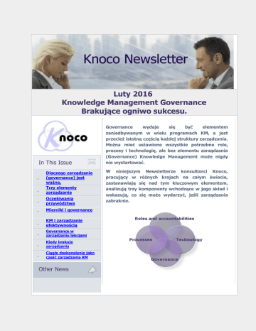 Luty 2016 Knowledge Management Governance Brakujące ogniwo sukcesu. In This Issue Dlaczego zarządzanie (governance) jest ważne. Trzy elementy zarządzania Oczekiwania przywództwa Mierniki i governance KM i zarządzanie efektywnością Governance w zarządzaniu lekcjami Kiedy brakuje zarządzania Ciągłe doskonalenie jako część zarządzania KM Other News Governance wydaje się być elementem zaniedbywanym w wielu programach KM, a jest przecież istotną częścią każdej struktury zarządzania. Można mieć ustawione wszystkie potrzebne role, procesy i technologię, ale bez elementu zarządzania (Governance) Knowledge Management może nigdy nie wystartować. W niniejszym Newsletterze konsultanci Knoco, pracujący w różnych krajach na całym świecie, zastanawiają się nad tym kluczowym elementem, analizują trzy komponenty wchodzące w jego skład i wskazują, co się może wydarzyć, jeśli zarządzania zabraknie. Oferta KM Starter Dlaczego zarządzanie (governance) jest ważne. W swojej ofercie mamy grupę niskobudżetowych usług dla firm, które chcą rozpocząć pracę z KM. Widzieliśmy wiele przykładów organizacji, które na pozór miały bardzo dobre systemy Zarządzania Obejmuje to między innymi metody: Wiedzą, a jednak te systemy nie były używane. Na role) za przechwytywanie wiedzy z projektów, miały przykład, miały określoną odpowiedzialność (czyli Oceny KM w Twojej organizacji Budowy Strategii KM Skan wiedzy, aby zidentyfikować tę, która wymaga największej uwagi Budowa zaangażowania poprzez warsztaty Zrozumienie swojej kultury organizacyjnej Tworzenie "dowodów koncepcji" zdefiniowany proces przechwytywania lekcji i miały Nick Milton, Knoco UK nawet wysokiej klasy system zarządzania lekcjami, a jednak do bazy przybywało niewiele lekcji, a jeszcze mniej było w rzeczywistości wykorzystywanych. Pytanie jest - czego brakuje, jeśli system jest na miejscu, ale nie jest używany? To, czego brakuje można nazwać „kulturą” lub „zachowaniem” - jednakże oba te zjawiska są wynikiem czegoś innego. Aby zrozumieć, co jeszcze jest potrzebne, zastanówmy się co sprawia, że ludzie przestrzegają w pracy zasad innych systemów. Na przykład, co sprawia, że ludzie postępują zgodnie z procedurami bezpieczeństwa (czasami uciążliwymi)? Forward Odpowiedź brzmi: Governance, czyli zarządzanie. W każdym If you have people you would like to zakończonym sukcesem przypadku ludzie znają reguły, wiedzą jakie są forward this email to, please forward oczekiwania względem nich, wiedzą co oznacza postępować zgodnie z using the button above zasadami i wiedzą, że jeśli tego nie zrobią, to będą wyciągnięte wobec Subscribe nich konsekwencje. To właśnie te trzy elementy składają się na zarządzanie i mają zastosowanie w każdym systemie zarządzania, tak w If you are not subscribed to this domu, jak i w pracy. newsletter and would like to be, please subscribe using the button above. Przeprowadzane przez nas oceny stanu zarządzania wiedzą (knowledge Unsubscribe management assessment) pokazują, że Governance jest jednym z najsłabiej rozwiniętych elementów KM, a jednocześnie jest jednym z tych elementów, które mają największy wpływ na długowieczność You're receiving this letter because you signed up at knoco.com or ordered free templates from us. If you no longer want to receive this newsletter, please unsubscribe using the button above. programu KM w organizacji. Skontaktuj się z nami, aby zbudować swój własny program zarządzania (governance) KM. Contact us Trzy elementy zarządzania Our Website Our contact details Wiedza jest kluczowym czynnikiem wpływającym Previous newsletters na wyniki zespołów i efektywność procesów. Email us Our facebook page Dlatego, kiedy organizacja podejmuje decyzję o Our Linked-in page wdrożeniu modelu KM, kluczowe jest zintegrowanie Nick's blog go z systemem zarządzania. Tom's blog Rupert's blog Stephanie's blog Rupert Vedalis blog in French Lescott, Ewa's blog in Polish Knoco on YouTube Zarządzanie (governance) w KM postrzegamy jako system posiadający trzy główne elementy: Knoco UK Oczekiwania organizacji względem zarządzania wiedzą: jaki poziom aktywności KM jest oczekiwany, od kogo oczekuje się wykonania, jaki standard jest oczekiwany i kiedy to powinno być zrobione. Te oczekiwania mogą być ujęte w zasadach KM albo innym, podobnym dokumencie i mogą obejmować różne oczekiwania w stosunku do różnych elementów składających się na KM, takich jak: communities of practice, lesson learning, czy korporacyjna baza danych. Zarządzanie efektywnością: pomiar stosowania KM, identyfikowanie zespołów i jednostek, które działają zgodnie z oczekiwaniami, a także identyfikowanie zespołów i jednostek, których wyniki są słabe i oferowanie im wsparcia. Wsparcie: zasoby potrzebne do tego by wspierać ludzi w działaniach KM, włączając w to zasoby na szkolenia, coaching i monitoring, a także źródła referencyjne, elearning oraz poradniki na temat procesów, ról i technologii. Te trzy elementy razem - przejrzystość oczekiwań, zarządzanie efektywnością i wsparcie na wysokim poziomie - dają gwarancję, że zadania KM zostaną wykonane, niezależnie od zakłóceń powodowanych przez pilniejsze (choć często mniej ważne) zadania. Więcej o Knowledge Management Governance tutaj. Oczekiwania przywództwa W ciągu lat mojej pracy z Knowledge Management w obszarach tak wojskowym, jak i cywilnym, jednym z czynników, który zawsze okazywał się ważny, było zarządzanie (governance). Ustanowienie jasnych oczekiwań Knowledge co do Management tego, jak powinno Cory Cannon, Knoco funkcjonować w organizacji, dostarcza US (Kansas) wskazówek, których pracownicy wiedzy (knowledge workers) bardzo potrzebują. Definiując te oczekiwania należy rozważyć trzy proste elementy: Upewnić się, że polityka Knowledge Management jest zgodna z misją i wizją or