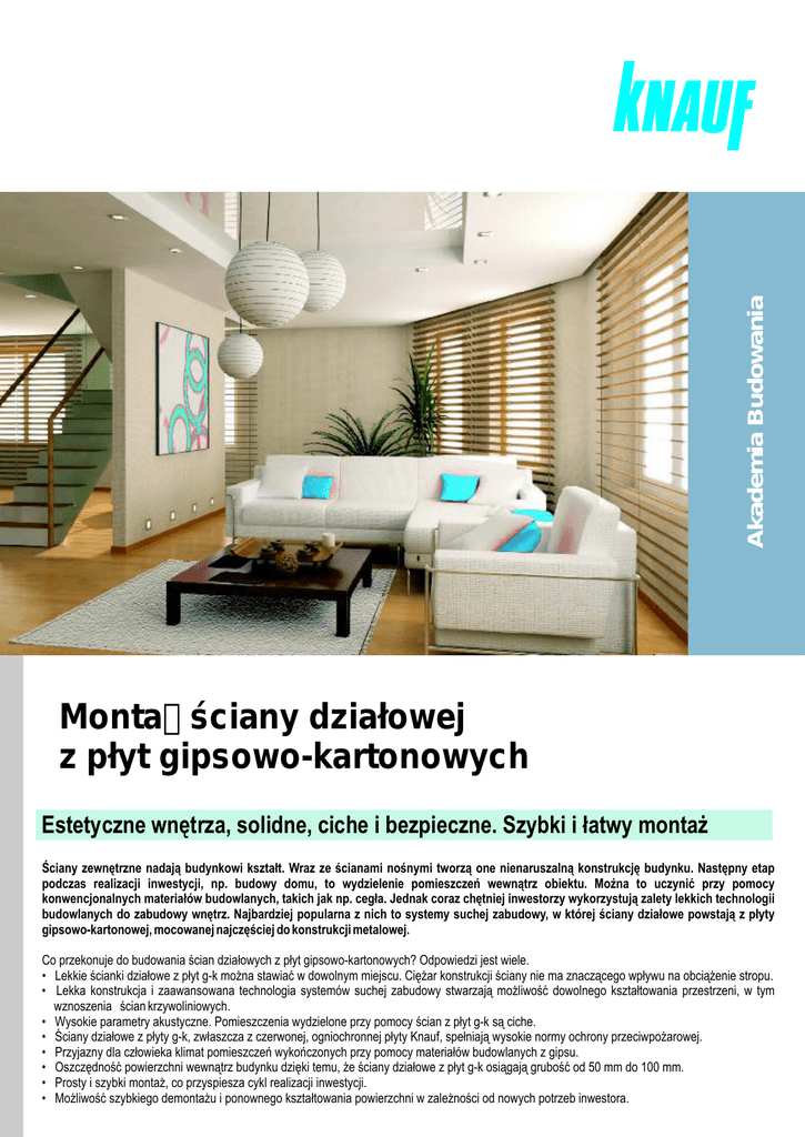 Akademia Budowania Montaż ściany działowej z płyt gipsowo-kartonowych Estetyczne wnętrza, solidne, ciche i bezpieczne. Szybki i łatwy montaż Ściany zewnętrzne nadają budynkowi kształt. Wraz ze ścianami nośnymi tworzą one nienaruszalną konstrukcję budynku. Następny etap podczas realizacji inwestycji, np. budowy domu, to wydzielenie pomieszczeń wewnątrz obiektu. Można to uczynić przy pomocy konwencjonalnych materiałów budowlanych, takich jak np. cegła. Jednak coraz chętniej inwestorzy wykorzystują zalety lekkich technologii budowlanych do zabudowy wnętrz. Najbardziej popularna z nich to systemy suchej zabudowy, w której ściany działowe powstają z płyty gipsowo-kartonowej, mocowanej najczęściej do konstrukcji metalowej. Co przekonuje do budowania ścian działowych z płyt gipsowo-kartonowych? Odpowiedzi jest wiele. • Lekkie ścianki działowe z płyt g-k można stawiać w dowolnym miejscu. Ciężar konstrukcji ściany nie ma znaczącego wpływu na obciążenie stropu. • Lekka konstrukcja i zaawansowana technologia systemów suchej zabudowy stwarzają możliwość dowolnego kształtowania przestrzeni, w tym wznoszenia ścian krzywoliniowych. • Wysokie parametry akustyczne. Pomieszczenia wydzielone przy pomocy ścian z płyt g-k są ciche. • Ściany działowe z płyty g-k, zwłaszcza z czerwonej, ogniochronnej płyty Knauf, spełniają wysokie normy ochrony przeciwpożarowej. • Przyjazny dla człowieka klimat pomieszczeń wykończonych przy pomocy materiałów budowlanych z gipsu. • Oszczędność powierzchni wewnątrz budynku dzięki temu, że ściany działowe z płyt g-k osiągają grubość od 50 mm do 100 mm. • Prosty i szybki montaż, co przyspiesza cykl realizacji inwestycji. • Możliwość szybkiego demontażu i ponownego kształtowania powierzchni w zależności od nowych potrzeb inwestora. Krok 1 Zabudowę ścian działowych z płyty gipsowo-kartonowej rozpoczynamy od wytyczenia na podłodze linii ustawienia przyszłej ściany. Do tej czynności używamy sznura traserskiego. Poprawne wytyczenie jest podstawą do łatwego wykonania wszelkich następnych czynności w trakcie montażu ścian. Krok 2 Od linii poziomych na podłodze wytyczamy prostopadłe linie pionowe na ścianach bocznych, biegnące do sufitu. Następnie linie wytyczone na podłodze przenosimy na sufit, łącząc je z liniami pionowymi. Konieczne jest bezwzględnie staranne wytyczenie linii, do której mocować będziemy konstrukcję z profili metalowych. Ułatwi to dalsze czynności montażu ściany. Krok 3 Profile UW, mocowane do podłogi, oraz profile CW, mocowane do ściany, oklejamy samoprzylepną taśmą akustyczną. Zaniedbanie tej czynności spowoduje pogorszenie parametrów akustycznych ściany (przenoszenie dźwięków z sąsiednich pomieszczeń). Krok 4 Do wytyczonych linii montujemy konstrukcję ściany z profili metalowych przy pomocy kołków szybkiego montażu. Do podłogi mocujemy profile UV, stosując kołki w rozstawie 1 m, do ściany - profile CW w rozstawie kołków min. 3 szt. na wysokość pomieszczenia do 3 m wysokości, ale nie rzadziej niż co 1 m. Do sufitu montujemy profile UW, takie jak do podłogi. Dobór szerokości profili (CW 50, CW 75, CW 100) zależy od kilku parametrów, między innymi wysokości ściany, rodzaju prowadzonych instalacji w ścianie, izolacyjności akustycznej, ilości warstw płyty, co w sumie określi grubość i sztywność ściany. Krok 5 Przed montażem profili pionowych należy dokładnie wymierzyć wysokość pomieszczenia i dociąć profile pionowe CW na wymiar mniejszy o 1-1,5 cm niż wymierzona wysokość. Profile pionowe CW wsuwamy pomiędzy profile UW na podłodze i suficie w odstępach od 30 do 60 cm, w zależności od rodzaju ściany (wysokość, ilość okładzin, przyszłego obciążenia). Nie należy ich ze sobą skręcać. Należy unikać sztukowania profili. W przypadku otworów drzwiowych należy pamiętać o ich wzmocnieniu przy pomocy profili pionowych UA. W sprawie doboru właściwych szerokości i rozstawu profili warto zasięgnąć informacji w punkcie sprzedaży. Krok 6 Po wykonaniu konstrukcji nośnej ścian z profili metalowych przystępujemy do montażu płyty gipsowo-kartonowej, zaczynając od jednej strony ściany. Płytę przykręcamy wkrętami do szybkiego montażu TN 25 mm przy pojedynczym płytowaniu lub wkrętami TN 35 mm przy płytowaniu podwójnym. Rozstaw wkrętów wynosi 25 cm dla jednej warstwy płyty. W przypadku dwóch warstw płyty, pierwszą warstwę przykręcamy wkrętami co 75 cm, drugą natomiast co 25 cm. Warunek takiego rozstawu to przerwa montażowa pomiędzy przykręceniem pierwszej i drugiej warstwy nie dłuższa niż 24 godziny. W przeciwnym razie obie warstwy przykręcamy co 25 cm. Krok 7 Przed ułożeniem izolacji należy poprowadzić wszystkie instalacje, przewidziane w danej ścianie. Następnie przystępujemy do układania izolacji. Materiał izolujący należy starannie przyciąć do szerokości rozstawu profili pionowych CW i ułożyć go pomiędzy profilami, zapełniając szczelnie przestrzeń między nimi, nawet wewnątrz profili. Krok 8 Po ułożeniu izolacji z wełny mineralnej montujemy płyty gipsowokartonowe po drugiej stronie ściany, pamiętając o przesunięciu płyty względem płyty po pierwszej stronie. Chodzi o to, aby uniknąć połączeń płyty na jednym profilu po obu stronach konstrukcji. Płyty g-k można łączyć w pionie, pamiętając o przesunięciu spoin poprzecznych nie mniejszym niż 40 cm. Ułożenie płyty po drugiej stronie zamyka zabudowę konstrukcji. Krok 9 Następnie przystępujemy do przygotowania docinanych powierzchni płyty do szpachlowania. Należy je odpylić i zagruntować przy pomocy środka gruntującego, np. Tiefengrund. Przy szpachlowaniu najważniejsze jest użycie właściwego produktu, służącego do spoinowania płyt, odpowiednie przygotowanie materiału i technologia spoinowania. Szpachlowanie ma szczególne z