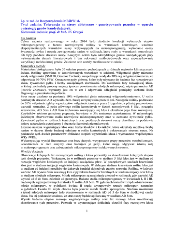 Lp. w zał. do Rozporządzenia MRiRW: 8. Tytuł zadania: Tolerancja na stresy abiotyczne - genotypowanie pszenicy w oparciu o strategię genów kandydujących. Kierownik zadania: prof. dr hab. W. Orczyk Cel zadania Celem zadania realizowanego w roku 2014 było zbadanie korelacji wybranych etapów mikrosporogenezy z fazami rozwojowymi rośliny w warunkach kontrolnych, ustalenie eksperymentalnych warunków suszy wpływających na mikrosporogenezę, wykonanie oceny żywotności pyłku i stopnia zawiązywania nasion w roślinach, które rosły w warunkach kontrolnych lub były poddane stresowi suszy. Kolejnym celem była identyfikacja genów kandydujących przy wykorzystaniu danych literaturowych i baz sekwencji nukleotydowych oraz zapoczątkowanie weryfikacji molekularnej genów. Założone cele zostały zrealizowane w całości. Materiały i metody Materiałem biologicznym było 36 odmian pszenic pochodzących z różnych regionów klimatycznych świata. Rośliny uprawiano w kontrolowanych warunkach w szklarni. Wilgotność gleby mierzono sondą wilgotności (SM150, Geomor Technik), uzupełniając wodą do 30% wg wilgotnościomierza, co odpowiada 60-70% PPW. Oznaczono pędy główne, które były używane do badania faz rozwojowych kłosa, żywotności pyłku i liczby zawiązanych ziarniaków. Do określenia fazy rozwojowej kłosa, w której zachodziły procesy mejozy (proces powstawania młodych mikrospor), użyto parametru AD (Auricle Distance), wyrażany jest on w cm i odpowiada odległości pomiędzy uszkami liścia flagowego a przedostatniego liścia. Stres suszy ustalono na poziomie 10% wilgotności gleby mierzonej wilgotnościomierzem. U roślin poddanych stresowi AD wynosiło 5cm. Suszę utrzymywano przez 5 dni. Następnie rośliny podlewano do 20% wilgotności gleby wg odczytów wilgotnościomierza przez 2 tygodnie, a później przywrócono warunki normalne. Z pędu głównego roślin kontrolnych w fazach rozwojowych 5 liści, początku krzewienia, AD 5cm i AD 8cm izolowano rozwijający się kłos i określano jego fazę rozwojową. Z pylników robiono gniecione preparaty, barwione w 3% roztworze acetokarminu. W mikroskopie świetlnym obserwowano stadia rozwojowe mikrosporogenezy oraz w oceniano żywotność pyłku. Żywotność pyłku w roślinach kontrolnych oraz poddanych stresowi suszy określano na podstawie koloru zabarwienia cytoplazmy i obecności komórek plemnikowych. Liczono nasiona wypełniające kłos oraz liczbę kłosków i kwiatków, które określały możliwą liczbę nasion w danym kłosie badanej odmiany u roślin kontrolnych i traktowanych stresem suszy. Na podstawie tych dwóch parametrów obliczano stopień wypełnienia kłosa i wyznaczano współczynnik WKs /WKk. Wykorzystując wyniki literaturowe oraz bazy danych, wytypowano grupy procesów metabolicznych, uczestniczące w nich enzymy oraz kodujące je geny, które mogą odgrywać istotną rolę w makrosporogenezie oraz zaburzeniach mikrosporogenezy indukowanych stresem. Wyniki i dyskusja Obserwacje kolejnych faz rozwojowych rośliny i kłosa pozwoliły na skorelowanie kolejnych etapów tych dwóch procesów. Wykazano, że w roślinach pszenicy w stadium 5 liści kłos jest w stadium od rozwoju wzgórków kłoskowych do inicjacji zawiązków plew. W początkowych stadiach krzewienia kłos jest w stadium inicjacji wzgórków kwiatowych. W dalszym stadium krzewienia roślin, kłos jest w stadium od inicjacji pręcików do dalszych bardziej dojrzałych etapów rozwoju. Rośliny, w których wartość AD wynosi 5cm zawierają kłos z pylnikami kwiatów bazalnych w stadium mejozy oraz kłosy w stadium młodych mikrospor. Młode mikrospory są uwalnianie z tetrad w roślinach, gdy wartość AD wynosi od 5 do 8cm, zależnie od genotypu. Badano stadia mikrosporogenezy w kwiatkach I, II i IIIrzędowych wypreparowanych z kłoska V roślin AD 5cm. W pylnikach kwiatów I rzędu obserwowano młode mikrospory, w pylnikach kwiatu II rzędu występowały tetrady mikrospor, natomiast w pylnikach kwiatu III rzędu obecna była jeszcze młoda tkanka sporogenna. Stadium uwalniania z tetrad młodych mikrospor było obserwowane w roślinach AD od 5 do 8cm w środkowej części kłosa. Na tej podstawie ustalono, że stres suszy będzie aplikowany w stadium AD 5cm. Wyniki badania etapów rozwoju wegetatywnego rośliny oraz faz rozwoju kłosa umożliwiają skorelowanie tych procesów. Pozwala to wystarczająco dokładnie określić fazy rozwojowe kłosa 1 w tym mikrosporogenezy w oparciu o łatwą do określenia fazę rozwoju wegetatywnego. Do celów projektu najważniejsze było określenie wczesnych etapów mikrosporogenezy. Zgodnie z tymi wynikami, w badanych odmianach wczesne fazy mejozy i fazy mikrosporogenezy zachodzą w roślinach gdy AD wynosi 5-8 cm. Wyniki te dobrze odpowiadają wynikom literaturowym. W trakcie realizacji zadania zebrano kolekcję 112 genotypów pszenicy pochodzących z różnych regionów klimatycznych. Do doświadczeń wybrano 36 genotypów, które reprezentują potencjalnie szeroki zakres reakcji badanej cechy tj. zaburzeń mikrosporogenezy i niepłodności pyłku na stres suszy. W roślinach testowanych genotypów obserwowano duże zróżnicowanie wypełnienia kłosa w roślinach, które były poddane stresowi suszy (WKs). Najniższe wartości WKs 8% miała odmiana Triple Dirk S, a najwyższe ponad 75% odmiany CSDH 143, CSDH 98, Upi-301. Współczynnik WKs/WKk pozwolił uwzględnić rzeczywiste i potencjalne wypełnienie kłosów, w warunkach kontrolnych i stresowych. Wartości tego parametru były zróżnicowane i wahały się od 0.37 (Mina), do ponad 0,9 (Bajka, CSDH 28, CSDH 53 Mironovska 808 i Kite, SQ1, Pinka, CSDH143, Ns-55-25, Rusalka). Żywotność pyłku z roślin kontrolnych wynosiła 100% u wszystkich genotypów. Żywotność pyłku pobranego z roślin poddanych stresowi suszy była zróżnicowana i wahała się od 0% do 100%. Najniższe wartości (0%) obserwowano u odmian: Ching Chang 6, L
