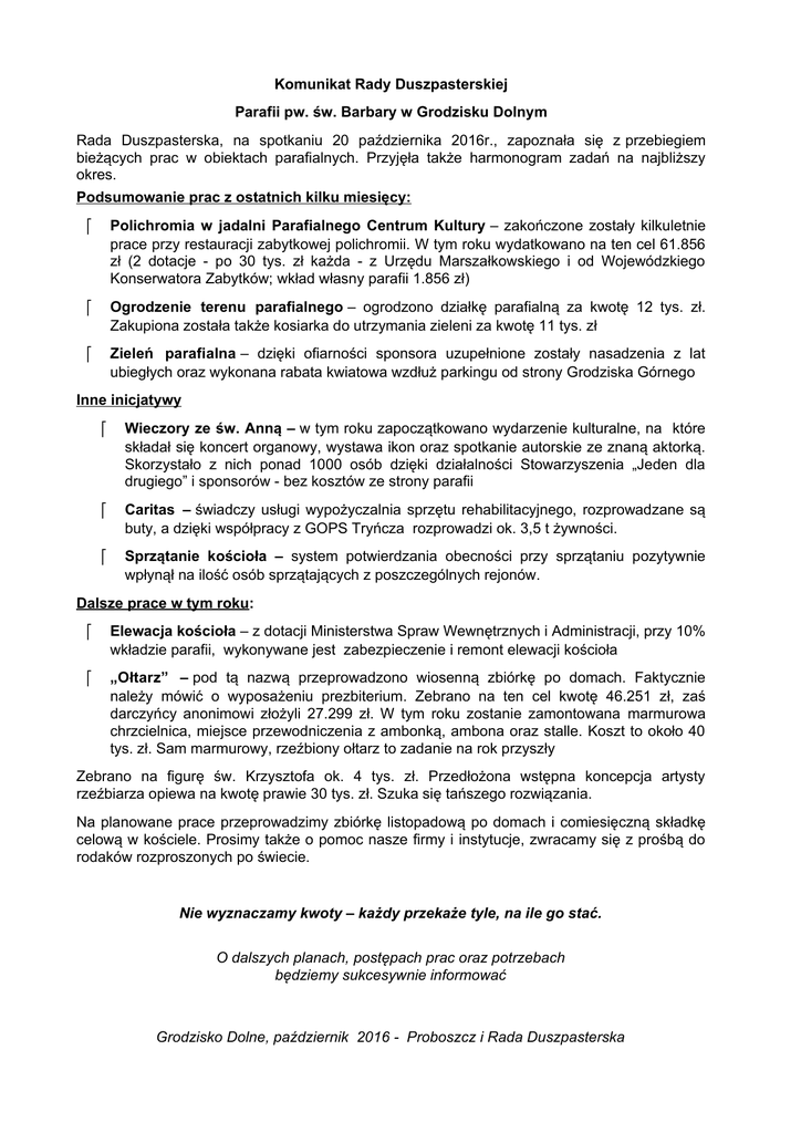Komunikat Rady Duszpasterskiej Parafii pw. św. Barbary w Grodzisku Dolnym Rada Duszpasterska, na spotkaniu 20 października 2016r., zapoznała się z przebiegiem bieżących prac w obiektach parafialnych. Przyjęła także harmonogram zadań na najbliższy okres. Podsumowanie prac z ostatnich kilku miesięcy: Polichromia w jadalni Parafialnego Centrum Kultury – zakończone zostały kilkuletnie prace przy restauracji zabytkowej polichromii. W tym roku wydatkowano na ten cel 61.856 zł (2 dotacje - po 30 tys. zł każda - z Urzędu Marszałkowskiego i od Wojewódzkiego Konserwatora Zabytków; wkład własny parafii 1.856 zł) Ogrodzenie terenu parafialnego – ogrodzono działkę parafialną za kwotę 12 tys. zł. Zakupiona została także kosiarka do utrzymania zieleni za kwotę 11 tys. zł Zieleń parafialna – dzięki ofiarności sponsora uzupełnione zostały nasadzenia z lat ubiegłych oraz wykonana rabata kwiatowa wzdłuż parkingu od strony Grodziska Górnego Inne inicjatywy Wieczory ze św. Anną – w tym roku zapoczątkowano wydarzenie kulturalne, na które składał się koncert organowy, wystawa ikon oraz spotkanie autorskie ze znaną aktorką. Skorzystało z nich ponad 1000 osób dzięki działalności Stowarzyszenia „Jeden dla drugiego” i sponsorów - bez kosztów ze strony parafii Caritas – świadczy usługi wypożyczalnia sprzętu rehabilitacyjnego, rozprowadzane są buty, a dzięki współpracy z GOPS Tryńcza rozprowadzi ok. 3,5 t żywności. Sprzątanie kościoła – system potwierdzania obecności przy sprzątaniu pozytywnie wpłynął na ilość osób sprzątających z poszczególnych rejonów. Dalsze prace w tym roku: Elewacja kościoła – z dotacji Ministerstwa Spraw Wewnętrznych i Administracji, przy 10% wkładzie parafii, wykonywane jest zabezpieczenie i remont elewacji kościoła „Ołtarz” – pod tą nazwą przeprowadzono wiosenną zbiórkę po domach. Faktycznie należy mówić o wyposażeniu prezbiterium. Zebrano na ten cel kwotę 46.251 zł, zaś darczyńcy anonimowi złożyli 27.299 zł. W tym roku zostanie zamontowana marmurowa chrzcielnica, miejsce przewodniczenia z ambonką, ambona oraz stalle. Koszt to około 40 tys. zł. Sam marmurowy, rzeźbiony ołtarz to zadanie na rok przyszły Zebrano na figurę św. Krzysztofa ok. 4 tys. zł. Przedłożona wstępna koncepcja artysty rzeźbiarza opiewa na kwotę prawie 30 tys. zł. Szuka się tańszego rozwiązania. Na planowane prace przeprowadzimy zbiórkę listopadową po domach i comiesięczną składkę celową w kościele. Prosimy także o pomoc nasze firmy i instytucje, zwracamy się z prośbą do rodaków rozproszonych po świecie. Nie wyznaczamy kwoty – każdy przekaże tyle, na ile go stać. O dalszych planach, postępach prac oraz potrzebach będziemy sukcesywnie informować Grodzisko Dolne, październik 2016 - Proboszcz i Rada Duszpasterska 1050 – ta Rocznica Chrztu Polski, Rok Miłosierdzia Parafialnym akcentem będą: chrzcielnica – zainstalowana w prezbiterium naczynie na wodę święconą – na stałe w przedsionku kościoła kropielnice dla każdej rodziny (z modlitwą i naklejką) - naczynie na wodę święconą przekazane jako wyposażenie każdego domu. Parafia zakupiła 1000 szt. kropielnic za kwotę 15.000 zł. Na ten cel będą zbierane wolne datki. Zwieńczeniem obchodów będą misje parafialne. PROGRAM MISJI ŚWIĘTYCH W PARAFII GRODZISKO DOLNE 26 XI – 4 XII 2016 26 LISTOPADA 2016 – SOBOTA 17.00 - RORATY -powitanie misjonarzy i nauka wstępna 20.00 – Kościół Domowy modli się na głos dzwonów 27 LISTOPADA 2016 – NIEDZIELA – BY DOBRZE ROZPOCZĄĆ 7.00, 9.00, 11.00, 17.00 – Msze św. z naukami dla wszystkich 16.15 – Nauka dla Młodzieży 20.00 – Kościół Domowy modli się... 28 LISTOPADA 2016 PONIEDZIAŁEK – SENS CIERPIENIA I PRZEMIJANIA 9.00 - Msza św. z nauką dla chorych. Sakrament namaszczenia chorych 17.00 - Roraty z nauką dla wszystkich.Po Roratach nauka dla Pań 20.00 – Kościół Domowy modli się... 29 LISTOPADA 2016 WTOREK – WODA ŚWIĘCONA I SAKRAMENTALIA 9.00 - Msza św. z nauką dla wszystkich 17.00 - Roraty z nauką dla wszystkich. Po Roratach nauka dla Panów 20.00 – Kościół Domowy modli się... 30 LISTOPADA 2016 ŚRODA – POST OD PAPIEROSA 9.00 - Msza św. z nauką dla wszystkich. Nabożeństwo pokutne 10.00-12.00 i 14.30 -17.00 -Spowiedź święta 17.00 - Roraty z nauką dla wszystkich 20.00 – Kościół Domowy modli się... 1 GRUDNIA 2016 CZWARTEK – POST OD TELEWIZJI 9.00 - Msza św. z nauką dla wszystkich 17.00 - Roraty z nauką dla wszystkich – kapłaństwo i powołanie 20.00 – Kościół Domowy modli się... 2 GRUDNIA 2016 PIĄTEK – POST O CHLEBIE I WODZIE 9.00 - Msza św. o krzyżu z nauką dla wszystkich. Adoracja relikwii Krzyża Świętego. Procesja na cmentarz. 17.00 - Roraty z nauką dla wszystkich. Adoracja relikwii Krzyża Świętego. 20.00 – Kościół Domowy modli się... 3 GRUDNIA 2016 SOBOTA – DZIEŃ Z MATKĄ NAJŚWIĘTSZĄ 9.00 - Msza św. z nauką dla wszystkich. Błogosławieństwo przedszkolaków, matek z dziećmi i spodziewających się dziecka. Nabożeństwo różańcowe 17.00 - Roraty z nauką dla wszystkich. Po Roratach nauka dla młodzieży. 20.00 – Kościół Domowy modli się... 4 GRUDNIA 2016 NIEDZIELA – ODPUST PARAFIALNY 7.00 - Msza św. z nauką dla wszystkich 9.00 - Msza św. z nauką dla wszystkich 11.00 - Uroczysta suma odpustowa i zakończenie Misji Świętych 20.00 – Kościół Domowy modli się...