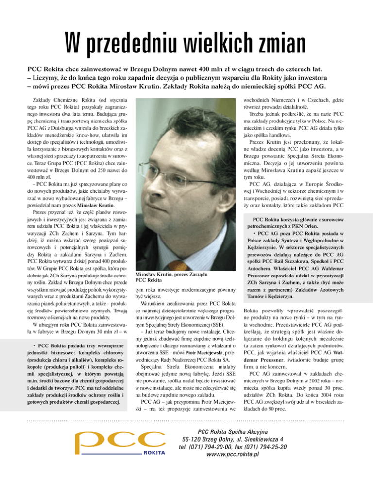 W przededniu wielkich zmian PCC Rokita chce zainwestować w Brzegu Dolnym nawet 400 mln zł w ciągu trzech do czterech lat. – Liczymy, że do końca tego roku zapadnie decyzja o publicznym wsparciu dla Rokity jako inwestora – mówi prezes PCC Rokita Mirosław Krutin. Zakłady Rokita należą do niemieckiej spółki PCC AG. Zakłady Chemiczne Rokita (od stycznia tego roku PCC Rokita) pozyskały zagranicznego inwestora dwa lata temu. Budująca grupę chemiczną i transportową niemiecka spółka PCC AG z Duisburga wniosła do brzeskich zakładów menedżerskie know-how, ułatwiła im dostęp do specjalistów i technologii, umożliwiła korzystanie z biznesowych kontaktów oraz z własnej sieci sprzedaży i zaopatrzenia w surowce. Teraz Grupa PCC (PCC Rokita) chce zainwestować w Brzegu Dolnym od 250 nawet do 400 mln zł. – PCC Rokita ma już sprecyzowane plany co do nowych produktów, jakie chciałaby wytwarzać w nowo wybudowanej fabryce w Brzegu – powiedział nam prezes Mirosław Krutin. Prezes przyznał też, że część planów rozwojowych i inwestycyjnych jest związana z zamiarem udziału PCC Rokita i jej właściciela w prywatyzacji ZCh Zachem i Sarzyna. Tym bardziej, iż można wskazać szereg powiązań surowcowych i potencjalnych synergii pomiędzy Rokitą a zakładami Sarzyna i Zachem. PCC Rokita wytwarza dzisiaj ponad 400 produktów. W Grupie PCC Rokita jest spółka, która podobnie jak ZCh Sarzyna produkuje środki ochrony roślin. Zakład w Brzegu Dolnym chce przede wszystkim rozwijać produkcję polioli, wykorzystywanych wraz z produktami Zachemu do wytwarzania pianek poliuretanowych, a także – produkcję środków powierzchniowo czynnych. Trwają rozmowy o licencjach na nowe produkty. W ubiegłym roku PCC Rokita zainwestowała w fabryce w Brzegu Dolnym 30 mln zł – w • PCC Rokita posiada trzy wewnętrzne jednostki biznesowe: kompleks chlorowy (produkcja chloru i alkaliów), kompleks rokopole (produkcja polioli) i kompleks chemii specjalistycznej, w którym powstają m.in. środki bazowe dla chemii gospodarczej i dodatki do tworzyw. PCC ma też oddzielne zakłady produkcji środków ochrony roślin i gotowych produktów chemii gospodarczej. wschodnich Niemczech i w Czechach, gdzie również prowadzi działalność. Trzeba jednak podkreślić, że na razie PCC ma zakłady produkcyjne tylko w Polsce. Na niemieckim i czeskim rynku PCC AG działa tylko jako spółka handlowa. Prezes Krutin jest przekonany, że lokalne władze docenią PCC jako inwestora, a w Brzegu powstanie Specjalna Strefa Ekonomiczna. Decyzja o jej utworzeniu powinna według Mirosława Krutina zapaść jeszcze w tym roku. PCC AG, działająca w Europie Środkowej i Wschodniej w sektorze chemicznym i w transporcie, posiada rozwiniętą sieć sprzedaży oraz kontakty, które także zakładom PCC Mirosław Krutin, prezes Zarządu PCC Rokita tym roku inwestycje modernizacyjne powinny być większe. Warunkiem zrealizowania przez PCC Rokita co najmniej dziesięciokrotnie większego programu inwestycyjnego jest utworzenie w Brzegu Dolnym Specjalnej Strefy Ekonomicznej (SSE). – Już teraz budujemy nowe instalacje. Chcemy jednak zbudować firmę zupełnie nową technologicznie i dlatego rozmawiamy z władzami o utworzeniu SSE – mówi Piotr Maciejewski, przewodniczący Rady Nadzorczej PCC Rokita SA. Specjalna Strefa Ekonomiczna miałaby obejmować jedynie nową fabrykę. Jeżeli SSE nie powstanie, spółka nadal będzie inwestować w nowe instalacje, ale może nie zdecydować się na budowę zupełnie nowego zakładu. PCC AG – jak przypomina Piotr Maciejewski – ma też propozycje zainwestowania we PCC Rokita korzysta głównie z surowców petrochemicznych z PKN Orlen. • PCC AG poza PCC Rokita posiada w Polsce zakłady Synteza i Węglopochodne w Kędzierzynie. W sektorze specjalistycznych przewozów działają należące do PCC AG spółki PCC Rail Szczakowa, Spedkol i PCC Autochem. Właściciel PCC AG Waldemar Preussner zapowiada udział w prywatyzacji ZCh Sarzyna i Zachem, a także (być może razem z partnerem) Zakładów Azotowych Tarnów i Kędzierzyn. Rokita pozwoliły wprowadzić poszczególne produkty na nowe rynki – w tym na rynki wschodnie. Przedstawiciele PCC AG podkreślają, że strategią spółki jest właśnie dołączanie do holdingu kolejnych niezależnie (a zatem rynkowo) działających podmiotów. PCC, jak wyjaśnia właściciel PCC AG Waldemar Preussner, świadomie buduje grupę firm, a nie koncern. PCC AG zainwestował w zakładach chemicznych w Brzegu Dolnym w 2002 roku – niemiecka spółka kupiła wtedy ponad 30 proc. udziałów ZCh Rokita. Do końca 2004 roku PCC AG zwiększył swój udział w brzeskich zakładach do 90 proc. PCC Rokita Spółka Akcyjna 56-120 Brzeg Dolny, ul. Sienkiewicza 4 tel. (071) 794-20-00, fax (071) 794-25-20 wwww.pcc.rokita.pl
