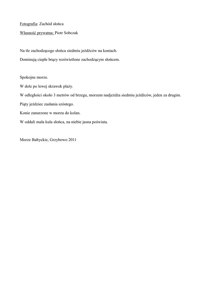Fotografia: Zachód słońca Własność prywatna: Piotr Sobczak Na tle zachodzącego słońca siedmiu jeźdźców na koniach. Dominują ciepłe brązy rozświetlone zachodzącym słońcem. Spokojne morze. W dole po lewej skrawek plaży. W odległości około 3 metrów od brzegu, morzem nadjeżdża siedmiu jeźdźców, jeden za drugim. Piąty jeździec zasłania szóstego. Konie zanurzone w morzu do kolan. W oddali mała kula słońca, na niebie jasna poświata. Morze Bałtyckie, Grzybowo 2011
