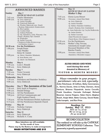 MAY 5, 2013 Sunday ANNOUNCED MASSES 7:45 a.m. 9:00 a.m. 10:30 a.m. 1:00 p.m. 5:00 p.m. Monday 7:30 a.m. 9:00 a.m. Tuesday 7:30 a.m. 9:00 a.m. Wednesday 7:30 a.m. 9:00 a.m. Thursday 7:30 a.m. 9:00 a.m. 12:00 p.m. 7:00 p.m. 7:30 p.m. 8:15 p.m. Friday 7:30 a.m. 9:00 a.m. Saturday 8:00 a.m. 5:00 p.m. Page 2 Our Lady of the Assumption May 5 SIXTH SUNDAY OF EASTER Charles Montanino -śp. Jerzy Zduńczyk -śp. Antoni Nieradko -śp. Franciszek Sadowski -śp. Wiesław Makowski oraz Zmarli z Rodziny Makowskich i Krukowskich -śp. Rita Lapitsky -śp. Czesław Elant -śp. Andrzej Piekarski -śp. Jan, Stanisława, Zofia, Wincenty i Jan -Zmarli z Rodziny Sęk i Jurskich -śp. Wladysław -śp. Stefan Ciszewski -Członkowie Kółka Różańcowego i ich Rodziny (żyjący) For the Parishioners Joseph Paone Anne Waidler Helen M. Gulotti -śp. Maria i Stanisław Składanek, śp. Irena Bonna, oraz śp. Jakub i Jan Składanek May 6 Louis J. Rinaldi Jerzy Zduńczyk May 7 Victor Cavasini Jerzy Zduńczyk May 8 Stanisława and Stanisław Stodulscy Jerzy Zduńczyk May 9 The Ascension of the Lord Holy Souls in Purgatory Donald Delargy All Our Parishioners All First Communicants and Eight Graders/Church All Our Parishioners/Polish-Auditorium All Our Parishioners/Spanish-Church May 10 Nicholas Cipriano Jerzy Zduńczyk May 11 Jerzy Zduńczyk Michelle A. Costa Mass Intentions are still available for the month of June. Please stop by the Rectory to make arrangements. MASS INTENTIONS ARE $15 Sunday 7:45 a.m. 9:00 a.m. 10:30 a.m. 1:00 p.m. 5:00 p.m. May 12 SIXTH SUNDAY OF EASTER Mother’s Day Gloria Lyons Ritzert -Nowenna z okazji Dnia Matki -śp. Jerzy Zduńczyk -śp. Antoni Nieradko -śp. Sabina i Stanislaw Grabińscy -Zmarli z Rodziny Żok i Grabińskich -śp. Anna Sadowska i śp. Cecylia Słodkowska -śp. Janina Solecka -śp. Stefan Ciszewski -Jakub Wesołowski (żyjący) -Patryk Broża i Eliot Simpson (żyjący) For the Parishioners Mother’s Day Novena Antoinetta & Joseph Calise Deceased Members of the Butcher Family -Nowenna z okazji Dnia Matki -Stanisława i Bronisław (żyjący) ALTAR BREAD AND WINE used during this week donated in Memory of VICTOR & BENITA MIOZZI Please remember in your prayers parishioners who are sick, especially: Anita Petschauer, Jill Zaffuto, Betty Cammarano, Jr., Norma Davies, Artie & Patty Clemens, Anna Ventura, Brianna Fitzpatrick, Jessica Coccollo, Frank Gaudioso, Carmela Hufnagel, Richard Besemer, Joanne Pagano, Helen Harris, Meghan Roach, Angie Misiti, Bette Conway, David Rader, Lidia Icangelo, and Ron Price. Readings for Sunday, May 12, 2013 Acts 15: 1-2, 22-29 Rv 21: 10-14, 22-23 Jn 14: 23-29 (57) SECOND COLLECTION This weekend we will take up the CATHOLIC ELEMENTARY SCHOOLS Collection. Your generosity is greatly appreciated. MAY 5, 2013 Our Lady of the Assumption RELIGIOUS EDUCATION CENTER Our next Family Mass is Sunday, May 19, 2013, at 10:30AM, in the Church Upcoming Events: Confirmation Rehearsal will be held on Tuesday, May 7th at 7:00pm in the Auditorium. First Communion Mass (Polish Language) will be celebrated on Saturday, May 11th at 10:00am in the Church. First Communion Mass (Spanish Language) will be celebrated on Saturday, May 11th at 12:30pm in the Church. The Confirmation Mass will be celebrated on Wednesday, May 15th at 4:00pm in the Auditorium. PROTECTING GOD’S CHILDREN VIRTUS TRAINING for OLA Volunteers, will be offered on May 22, 2013, in the Lower Church Hall from 6:45pm 9:45pm. Register on-line at www.drvc.org Virtus On-line. Please contact Pam Fitzgerald at (516) 551-2494 for more information. As a reminder, all NEW parish volunteers must have a background screening check. Forms are available in the Rectory Office. ALTAR SERVERS NEEDED Anyone 4th Grade and up who would like to become an Altar Server is asked to call the rectory and leave your name, grade and phone number for Deacon Phil, at extension 29. This is a great way to become more involved with your parish. PARISH OUTREACH Are you parishioners tired of hearing me rave about how good you are? Okay. I won’t do it this week. This week I will tell you what great children your have. Many of the National Honor Society students from Walter G. O’Connell High School, along with their co-advisors – Ms. Fuss and Mrs. Raimondi – gave up their Saturday last week (a beautiful day if you remember) to stand outside of Stop ‘n’ Shop in Amityville and collect food for the Outreach. Not only did they stand there for over four hours and collect the food and then load it in both advisors’ vehicles and deliver it to the Outreach, they accomplished this with a smile on their faces and in high spirits wanting to know if we needed them to do anything else while they were here. Thank you Copiague for the children you are raising. You cannot convince me that kids today are not every bit as good, if not better, than the kids of yesterday! The Outreach Family PS We can use cereal, powdered milk, evaporated milk, canned meats and tuna fish. Page 3 Rectory Office and other parish offices will be CLOSED on Thursday, May 9th ASCENSION OF THE LORD NURSERY SCHOOL CHINESE AUCTION Our Lady of the Assumption Nursery School will once again sponsor their Chinese Auction on Friday, May 17, 2013. Doors will open at 7:00PM. No smoking is permitted in the Auditorium. There will be light refresments available for purchase. Admission is $5. This admission charge also includes a sheet of auction tickets, a door prize ticket, a piece of cake and a cup of coffee or tea. There are many raffles in addition to the auction, such as 32” LG LCD/TV, a Brinkman 4 Burner Gas Grill, a Samsung Tablet, 50/50, $100 worth of scratch off tickets, etc. We have gift certificates from local merchants, knick knacks, books, framed prints, floral arrangements, and many other items. So come join us for a great time, and hopefully, take home goodies too! Please contact the Nursery School at (631) 789-5602, if you need further information. Thank you for y