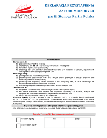 DEKLARACJA PRZYSTĄPIENIA do FORUM MŁODYCH partii Stonoga Partia Polska Oświadczenia Oświadczam, iż: 1) posiadam obywatelstwo polskie; 2) ukończyłem/-am 15 lat i nie ukończyłem/-am 25. roku życia; 3) korzystam z pełni praw publicznych; 4) akceptuję: cele SPP, strukturę oraz zasady działania SPP określone w Statucie, regulaminach wewnętrznych oraz decyzjach organów SPP. Deklaruję wolę: 1) przystąpienia do Forum Młodych SPP; 2) przestrzegania postanowień SPP oraz innych aktów prawnych i decyzji organów SPP dotyczących Forum Młodych SPP; 3) przestrzegania programu, zasad ideowych i linii politycznej SPP, a także aktywnego ich tworzenia oraz uczestniczenia w ich realizacji; 4) sumiennego wypełniania obowiązków członka Forum Młodych SPP. Oświadczam, iż: 1) nie jestem członkiem innej partii lub organizacji o celach politycznych; 2) nie jestem członkiem oraz czynnie nie wspieram organizacji lub ruchów, których cele są sprzeczne z zasadami ideowymi, programem lub interesem SPP; 3) nie podejmuję działań sprzecznych z celami SPP. Wyrażam zgodę, zgodnie z ustawą z dnia 29 sierpnia 1997 r. o ochronie danych osobowych (tj. Dz. U. z 2014, Nr 1182), na gromadzenie i przetwarzanie moich danych osobowych przez władze statutowe partii Stonoga Partia Polska, w zakresie wynikającym z prowadzenia działalności statutowej przez partię. Poparcie przystąpienia do SPP przez członków wprowadzających Jako członkowie wprowadzający popieramy powyższą deklarację przystąpienia do partii SPP. Decyzja Prezesa SPP lub osoby upoważnionej wyrażam zgodę nie wyrażam zgody data podpis