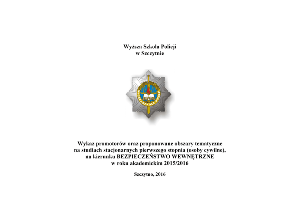 Wyższa Szkoła Policji w Szczytnie Wykaz promotorów oraz proponowane obszary tematyczne na studiach stacjonarnych pierwszego stopnia (osoby cywilne), na kierunku BEZPIECZEŃSTWO WEWNĘTRZNE w roku akademickim 2015/2016 Szczytno, 2016 Lp. PROMOTOR OBSZARY TEMATYCZNE 1. Zagrożenia małoletnich w cyberprzestrzeni; 2. Nowoczesne technologie w społeczeństwie informacyjnym; 3. Nowoczesne technologie w bezpieczeństwie. 1. Psychologia działań w zagrożeniu; 2. Psychologiczne mechanizmy warunkujące zachowania osób podczas zorganizowanych działań Policji; 3. Psychologiczne aspekty bezpieczeństwa osobistego. 1. Problematyka fizycznej i technicznej ochrony osób i mienia; 2. Służba konwojowa w Policji. 1. Bezpieczeństwo imprez masowych; 2. Problematyka przestępczości stadionowej; 3. Problematyka mowy i przestępstw z nienawiści. 1. Bezpieczeństwo państwa; 2. Bezpieczeństwo społeczne. 1. Techniki interwencji; 2. Promocja zdrowia; 3. Wychowanie fizyczne. 1. dr Tomasz Siemianowski 2. dr Anna Zubrzycka 3. dr Zenon Cisowski 4. dr Justyna Jurczak 5. dr Tomasz Łachacz 6. dr Jan Głąbowski 7. mgr Robert Głowacki 1. Prewencja kryminalna. 8. mgr Piotr Mikosza 1. Prewencja 9. dr Krzysztof Wiciak 1. Przestępczość zorganizowana 10. dr Aneta Łyżwa 1. Procedura karna; 2. Handel ludźmi. 11. dr Renata Włodarczyk 1. Wybrane zagadnienia techniki kryminalistycznej i medycyny sądowej. KOMÓRKA ORGANIZACYJNA Instytut Bezpieczeństwa i Porządku Publicznego Instytut Bezpieczeństwa i Porządku Publicznego Instytut Bezpieczeństwa i Porządku Publicznego Instytut Bezpieczeństwa i Porządku Publicznego Instytut Bezpieczeństwa i Porządku Publicznego Instytut Bezpieczeństwa i Porządku Publicznego Instytut Bezpieczeństwa i Porządku Publicznego Instytut Bezpieczeństwa i Porządku Publicznego Instytut Badań nad Przestępczością Kryminalną i Terroryzmem Instytut Badań nad Przestępczością Kryminalną i Terroryzmem Instytut Badań nad Przestępczością Kryminalną i Terroryzmem Lp. 12. PROMOTOR mgr Artur Winnicki OBSZARY TEMATYCZNE 1. Wybrane zagadnienia zwalczania przestępczości kryminalnej. 13. mgr Dariusz Potakowski 1. Przestępczość zorganizowana. 14. mgr Marek Błędowski 1. Kryminalistyka. 15. dr Grzegorz Gudzbeler 2. Technologie w zapewnieniu porządku publicznego i bezpieczeństwa obywateli. KOMÓRKA ORGANIZACYJNA Instytut Badań nad Przestępczością Kryminalną i Terroryzmem Instytut Badań nad Przestępczością Kryminalną i Terroryzmem Instytut Badań nad Przestępczością Kryminalną i Terroryzmem promotor zewnętrzny