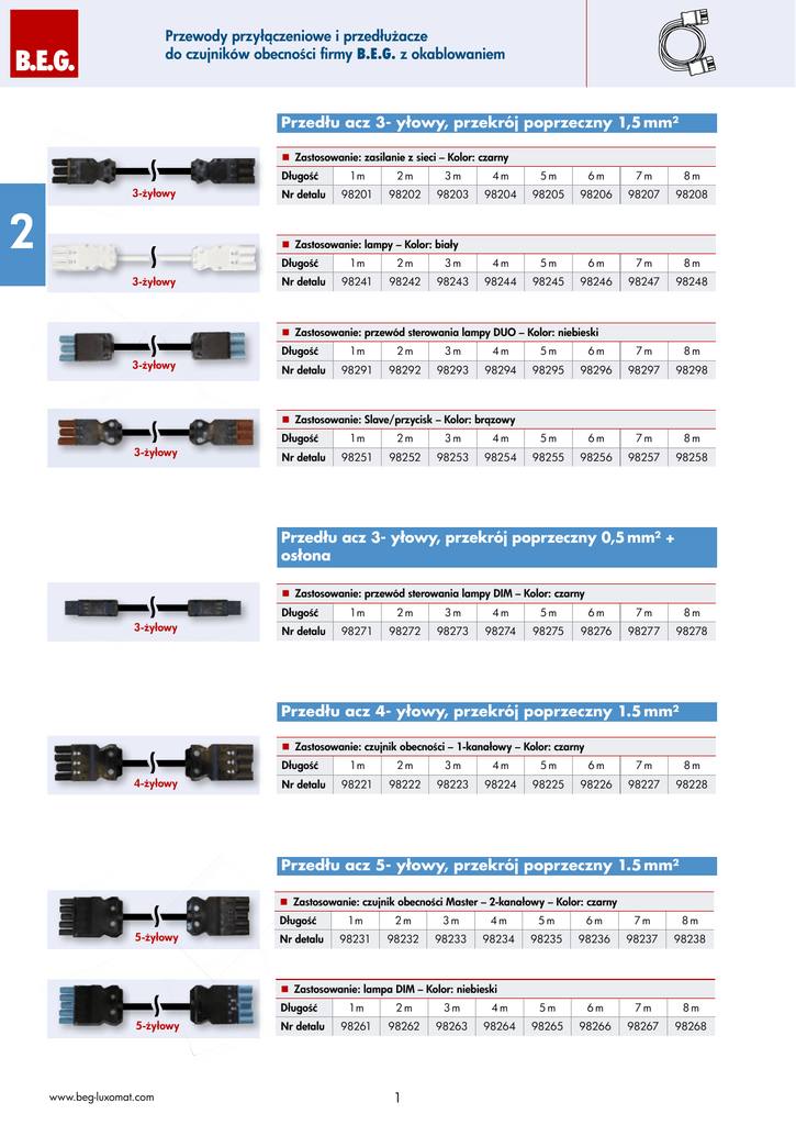 Przewody przyłączeniowe i przedłużacze do czujników obecności firmy B.E.G. z okablowaniem B.E.G. Przedłużacz 3-żyłowy, przekrój poprzeczny 1,5 mm² Z astosowanie: zasilanie z sieci – Kolor: czarny Długość 3-żyłowy 2 Nr detalu 1m 2m 3m 4m 5m 6m 7m 8m 98201 98202 98203 98204 98205 98206 98207 98208 Z astosowanie: lampy – Kolor: biały Długość 3-żyłowy Nr detalu 1m 2m 3m 4m 5m 6m 7m 8m 98241 98242 98243 98244 98245 98246 98247 98248 Z astosowanie: przewód sterowania lampy DUO – Kolor: niebieski Długość 3-żyłowy Nr detalu 1m 2m 3m 4m 5m 6m 7m 8m 98291 98292 98293 98294 98295 98296 98297 98298 Z astosowanie: Slave/przycisk – Kolor: brązowy 3-żyłowy Długość Nr detalu 1m 2m 3m 4m 5m 6m 7m 8m 98251 98252 98253 98254 98255 98256 98257 98258 Przedłużacz 3-żyłowy, przekrój poprzeczny 0,5 mm² + osłona Z astosowanie: przewód sterowania lampy DIM – Kolor: czarny Długość 3-żyłowy Nr detalu 1m 2m 3m 4m 5m 6m 7m 8m 98271 98272 98273 98274 98275 98276 98277 98278 Przedłużacz 4-żyłowy, przekrój poprzeczny 1.5 mm² Z astosowanie: czujnik obecności – 1-kanałowy – Kolor: czarny Długość 4-żyłowy Nr detalu 1m 2m 3m 4m 5m 6m 7m 8m 98221 98222 98223 98224 98225 98226 98227 98228 Przedłużacz 5-żyłowy, przekrój poprzeczny 1.5 mm² Z astosowanie: czujnik obecności Master – 2-kanałowy – Kolor: czarny Długość 5-żyłowy Nr detalu 1m 2m 3m 4m 5m 6m 7m 8m 98231 98232 98233 98234 98235 98236 98237 98238 Z astosowanie: lampa DIM – Kolor: niebieski Długość 5-żyłowy www.beg-luxomat.com Nr detalu 1m 2m 3m 4m 5m 6m 7m 8m 98261 98262 98263 98264 98265 98266 98267 98268 1 Przewody przyłączeniowe i przedłużacze do czujników obecności firmy B.E.G. z okablowaniem B.E.G. Przedłużacz 6-żyłowy, przekrój poprzeczny 1.5 mm² Z astosowanie: lampa DUO – Kolor: brązowo-czarny Długość Nr detalu 1m 2m 3m 4m 5m 6m 7m 8m 98281 98282 98283 98284 98285 98286 98287 98288 6-żyłowy 2 Przedłużacz 7-żyłowy, przekrój poprzeczny 1.5 mm² Z astosowanie: czujnik obecności-Master-DIM – Kolor: czarny Długość Nr detalu 1m 2m 3m 4m 5m 6m 7m 8m 98301 98302 98303 98304 98305 98306 98307 98308 Przewód o przekroju poprzecznym 2,5 mm² na zamówienie! 7-żyłowy ! Przewody przyłączeniowe z wtyczką lub gniazdem i wolną izolowaną końcówką, o długości jednego metra 3-żyłowy Przewód przyłączeniowy do zasilania (Nr detalu 98073) 5-żyłowy Przewód przyłączeniowy do czujnika obecności Master (Nr detalu 98076) Typ Kolor żyły x żyły Przekrój poprzeczny Nr detalu Przewód przyłączeniowy do zasilania, G czarny 3-żyłowy 1.5 mm² 98073 Przewód przyłączeniowy do lamp, W biały 3-żyłowy 1.5 mm² 98075 Przewód przyłączeniowy do sterownika lamp DUO, W niebieski 3-żyłowy 1.5 mm² 98079 Przewód przyłączeniowy do Slave / przycisku, W brązowy 3-żyłowy 1.5 mm² 98077 Przewód przyłączeniowy do sterownika lamp DIM, W czarny 3-żyłowy 1.5 mm² 98081 Przewód przyłączeniowy do czujnika obecności 1-kanałowego, W czarny 4-żyłowy 1.5 mm² 98074 Przewód przyłączeniowy do czujnika obecności Master, W czarny 5-żyłowy 1.5 mm² 98076 Przewód przyłączeniowy do lamp DIM lamp, W niebieski 5-żyłowy 1.5 mm² 98082 Przewód przyłączeniowy do lamp DUO, W brązowy-czarny 6-żyłowy 1.5 mm² 98078 Przewód przyłączeniowy do czujnika obecności Master-DIM, W czarny 7-żyłowy 1.5 mm² 98080 G = Gniazdo, W = Wtyczka 2 Moduły VBox i VLBox B.E.G. Akcesoria i kostki rozdzielcze do puszek przyłączeniowych (V) i rozgałęźnych (VL) Akcesoria do modułów VBox i VLBox Informacje o produkcie • Złącze mostkowe trzybiegunowe do czujników obecności DUO-DIM • Zastosowanie: praca 1/2-kanałowa 2 Złącze mostkowe – 3-biegunowe Informacje o produkcie • 3-biegunowa kostka zaciskowa z blokadą, jak również 3-biegunowa wtyczka (wejście) i dwa 2-biegunowe gniazda (wyjście) • Zastosowanie: lampy z kostkami rozdzielczymi Kostka rozdzielcza – 3-biegunowa do 2 wyjść Informacje o produkcie • 3-biegunowa kostka zaciskowa z blokadą, jak również 3-biegunowa wtyczka (wejście) i trzy 3-biegunowe gniazda (wyjście) • Zastosowanie: lampy z kostkami rozdzielczymi Kostka rozdzielcza – 3-biegunowa do 3 wyjść Informacje o produkcie • 5-biegunowa kostka zaciskowa z blokadą, jak również 5-biegunowa wtyczka (wejście) i dwa 3-biegunowe gniazda (wyjście) • Zastosowanie: lampy DIM z kostkami rozdzielczymi Kostka rozdzielcza – 5-biegunowa do 2 wyjść Informacje o produkcie • Puszka przyłączeniowa pomiędzy stałą instalacją (NYM) a ruchomym przyłączem do puszek VBox, zwłaszcza do zastosowania do przycisków i łączników Puszka przyłączeniowa, Typ Kolor Nr detalu Złącze mostkowe 3 bieguny niebieski/czarny 98064 Kostka rozdzielcza 3 bieguny na 2 wyjścia czarny 98070 Kostka rozdzielcza 3 bieguny na 3 wyjścia czarny 98071 Kostka rozdzielcza 5 bieguny na 2 wyjścia czarny 98072 Connecting Box szary 98083 www.beg-luxomat.com 3