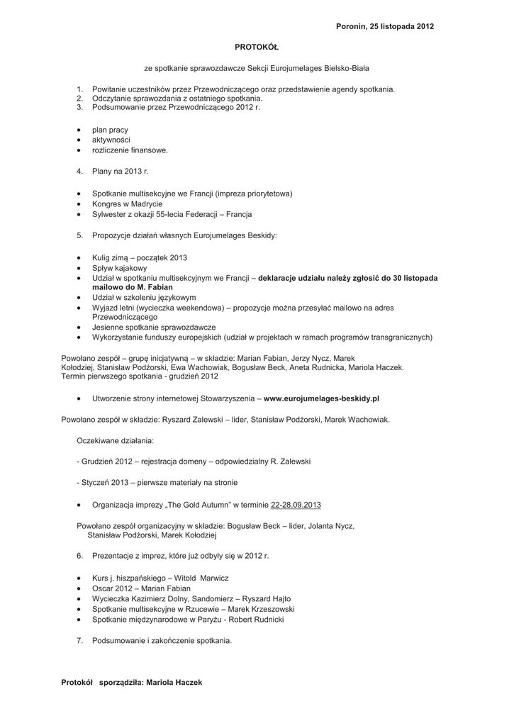 Poronin, 25 listopada 2012 PROTOKÓŁ ze spotkanie sprawozdawcze Sekcji Eurojumelages Bielsko-Biała 1. 2. 3. Powitanie uczestników przez Przewodniczącego oraz przedstawienie agendy spotkania. Odczytanie sprawozdania z ostatniego spotkania. Podsumowanie przez Przewodniczącego 2012 r. plan pracy aktywności rozliczenie finansowe. 4. Plany na 2013 r. Spotkanie multisekcyjne we Francji (impreza priorytetowa) Kongres w Madrycie Sylwester z okazji 55-lecia Federacji – Francja 5. Propozycje działań własnych Eurojumelages Beskidy: Kulig zimą – początek 2013 Spływ kajakowy Udział w spotkaniu multisekcyjnym we Francji – deklaracje udziału należy zgłosić do 30 listopada mailowo do M. Fabian Udział w szkoleniu językowym Wyjazd letni (wycieczka weekendowa) – propozycje można przesyłać mailowo na adres Przewodniczącego Jesienne spotkanie sprawozdawcze Wykorzystanie funduszy europejskich (udział w projektach w ramach programów transgranicznych) Powołano zespół – grupę inicjatywną – w składzie: Marian Fabian, Jerzy Nycz, Marek Kołodziej, Stanisław Podżorski, Ewa Wachowiak, Bogusław Beck, Aneta Rudnicka, Mariola Haczek. Termin pierwszego spotkania - grudzień 2012 Utworzenie strony internetowej Stowarzyszenia – www.eurojumelages-beskidy.pl Powołano zespół w składzie: Ryszard Zalewski – lider, Stanisław Podżorski, Marek Wachowiak. Oczekiwane działania: - Grudzień 2012 – rejestracja domeny – odpowiedzialny R. Zalewski - Styczeń 2013 – pierwsze materiały na stronie Organizacja imprezy „The Gold Autumn” w terminie 22-28.09.2013 Powołano zespół organizacyjny w składzie: Bogusław Beck – lider, Jolanta Nycz, Stanisław Podżorski, Marek Kołodziej 6. Prezentacje z imprez, które już odbyły się w 2012 r. Kurs j. hiszpańskiego – Witold Marwicz Oscar 2012 – Marian Fabian Wycieczka Kazimierz Dolny, Sandomierz – Ryszard Hajto Spotkanie multisekcyjne w Rzucewie – Marek Krzeszowski Spotkanie międzynarodowe w Paryżu - Robert Rudnicki 7. Podsumowanie i zakończenie spotkania. Protokół sporządziła: Mariola Haczek