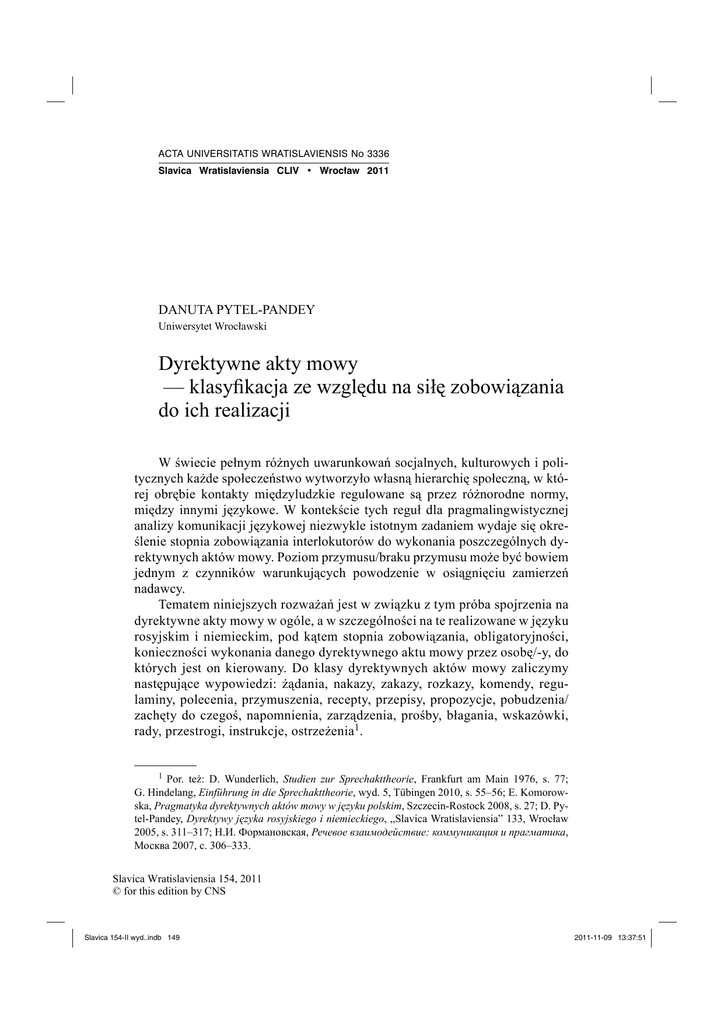 ACTA UNIVERSITATIS WRATISLAVIENSIS No 3336 Slavica Wratislaviensia CLIV • Wroc³aw 2011 DANUTA PYTEL-PANDEY Uniwersytet Wrocławski Dyrektywne akty mowy — klasyfikacja ze względu na siłę zobowiązania do ich realizacji W świecie pełnym różnych uwarunkowań socjalnych, kulturowych i politycznych każde społeczeństwo wytworzyło własną hierarchię społeczną, w której obrębie kontakty międzyludzkie regulowane są przez różnorodne normy, między innymi językowe. W kontekście tych reguł dla pragmalingwistycznej analizy komunikacji językowej niezwykle istotnym zadaniem wydaje się określenie stopnia zobowiązania interlokutorów do wykonania poszczególnych dyrektywnych aktów mowy. Poziom przymusu/braku przymusu może być bowiem jednym z czynników warunkujących powodzenie w osiągnięciu zamierzeń nadawcy. Tematem niniejszych rozważań jest w związku z tym próba spojrzenia na dyrektywne akty mowy w ogóle, a w szczególności na te realizowane w języku rosyjskim i niemieckim, pod kątem stopnia zobowiązania, obligatoryjności, konieczności wykonania danego dyrektywnego aktu mowy przez osobę/-y, do których jest on kierowany. Do klasy dyrektywnych aktów mowy zaliczymy następujące wypowiedzi: żądania, nakazy, zakazy, rozkazy, komendy, regulaminy, polecenia, przymuszenia, recepty, przepisy, propozycje, pobudzenia/ zachęty do czegoś, napomnienia, zarządzenia, prośby, błagania, wskazówki, rady, przestrogi, instrukcje, ostrzeżenia1. 1 Por. też: D. Wunderlich, Studien zur Sprechakttheorie, Frankfurt am Main 1976, s. 77; G. Hindelang, Einführung in die Sprechakttheorie, wyd. 5, Tübingen 2010, s. 55–56; E. Komorowska, Pragmatyka dyrektywnych aktów mowy w języku polskim, Szczecin-Rostock 2008, s. 27; D. Pytel-Pandey, Dyrektywy języka rosyjskiego i niemieckiego, „Slavica Wratislaviensia” 133, Wrocław 2005, s. 311–317; Н.И. Формановская, Речевое взаимодействие: коммуникация и прагматика, Москва 2007, с. 306–333. Slavica Wratislaviensia 154, 2011 © for this edition by CNS Slavica 154-II wyd..indb 149 2011-11-09 13:37:51 150 • Danuta Pytel-Pandey 1. Obligatoryjne i fakultatywne dyrektywne akty mowy Jak wskazuje sama nazwa, dyrektywne akty mowy będą pobudzać, stymulować, zachęcać lub obligować, nakazywać albo wręcz bezwzględnie zmuszać adresata do wykonania jakiegoś zadania2. Muszą jednak zostać spełnione pewne uwarunkowania, aby można było mówić o osiągnięciu sukcesu komunikacyjnego. Warunkiem wstępnym do podjęcia jakiegokolwiek działania przez osobę adresata jest zaistnienie poniższych okoliczności. Odbiorca powinien: — zrozumieć wypowiedź nadawcy (np. zwrócenie się do kogoś w języku, którego ta osoba nie zna, z góry skazuje na niepowodzenie realizację celu, jaki miał być osiągnięty — brak zrozumienia wypowiedzi); — uznać jej prawdziwość i potrzebę postępowania w o g ó l e według woli nadawcy (np. zdanie: Mach das Licht an! Es ist dunkel!/Включи свет, в комнате темно!/Zapal światło, jest ciemno!, wypowiedziane w pomieszczeniu, w którym już palą się wszystkie światła i jest jasno, podważa jego prawdziwość i zasadność); — odnaleźć u s i e b i e wystarczającą gotowość do realizacji zadania, do którego nawołuje nadawca wypowiedzi (tzn. wykazać chociaż minimalne zainteresowanie problemem, z jakim zwraca się do niego nadawca, i zaakceptować zasadność podjęcia działania mającego doprowadzić do pomyślnego zakończenia); — być w stanie wykonać działanie, którego domaga się nadawca (realizacja celu nie może przekraczać możliwości adresata lub być całkowicie poza zasięgiem tych możliwości, np. żądanie, by ktoś pojechał samochodem na zakupy, jeśli ta osoba nie ma prawa jazdy i nie potrafi prowadzić samochodu, jest absurdalne). Dopiero wówczas, kiedy te podstawowe czynniki, nazywane też warunkami wstępnymi, zostaną spełnione, można będzie mówić o sile zobowiązania nakładanego na osobę współrozmówcy, gdyż w przeciwnym razie nie dojdzie do jego realizacji. Stopień kategoryczności wykonania danego dyrektywnego aktu mowy — aktu mającego pobudzić adresata do podjęcia jakiegoś działania — uzależniony będzie od kilku istotnych czynników. Zaliczymy do nich: — miejsce w hierarchii społecznej zajmowane przez nadawcę i odbiorcę, tzn. poziom wykształcenia, status zawodowy, wiek, płeć; — układ ról, w jakim się oni względem siebie znajdują, np. podwładny– przełożony, dziecko–rodzice, uczeń–nauczyciel; — możliwość wyciągnięcia konsekwencji przez nadawcę w wypadku odmowy wykonania danego aktu; — rodzaj konsekwencji, jakie wyciągnie nadawca względem adresata w wypadku odmowy wykonania danego aktu, np. kara od rodziców względem dzieci, 2 Słownik wyrazów obcych (opr. L. Wiśniakowska, Warszawa 2005, s. 223) podaje: „dyre kt y w a — wskazówka, zalecenie lub zarządzenie dotyczące postępowania; wytyczna <fr. directive>”; „d y rek ty w n y — stanowiący dyrektywę lub oparty na dyrektywach <fr. directif>”. Slavica Wratislaviensia 154, 2011 © for this edition by CNS Slavica 154-II wyd..indb 150 2011-11-09 13:37:51 Dyrektywne akty mowy • 151 nagana w pracy lub utrata pracy, aż do kary pozbawienia wolności, a nawet kary śmierci (w wypadku odmowy wykonania rozkazów przez żołnierzy); — rodzaj czynności, jakie muszą zostać podjęte, aby doprowadzić do realizacji owego aktu; — siła determinacji, z jaką działają uczestnicy aktu komunikacji. Nadrzędne pytanie pozwalające określić, czy dany dyrektywny akt mowy ma charakter obligatoryjny dla osoby adresata, czy też nie, powinno brzmieć: czy adresat musi bezwzględnie wykonać to, z czym zwraca się do niego nadawca? — Jeśli padnie odpowiedź TAK, to możemy mówić o obligatoryjnym dyrektywnym akcie mowy, niedającym możliw