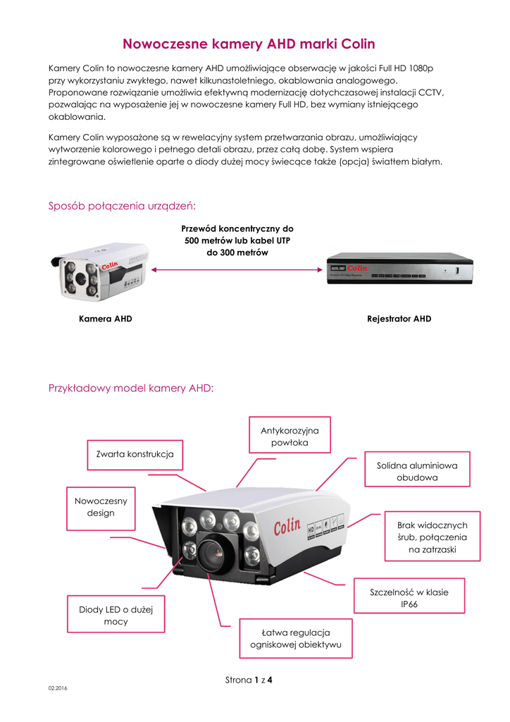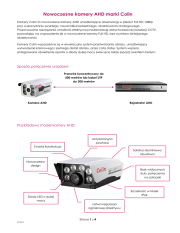 Nowoczesne kamery AHD marki Colin Kamery Colin to nowoczesne kamery AHD umożliwiające obserwację w jakości Full HD 1080p przy wykorzystaniu zwykłego, nawet kilkunastoletniego, okablowania analogowego. Proponowane rozwiązanie umożliwia efektywną modernizację dotychczasowej instalacji CCTV, pozwalając na wyposażenie jej w nowoczesne kamery Full HD, bez wymiany istniejącego okablowania. Kamery Colin wyposażone są w rewelacyjny system przetwarzania obrazu, umożliwiający wytworzenie kolorowego i pełnego detali obrazu, przez całą dobę. System wspiera zintegrowane oświetlenie oparte o diody dużej mocy świecące także (opcja) światłem białym. Sposób połączenia urządzeń: Przewód koncentryczny do 500 metrów lub kabel UTP do 300 metrów Kamera AHD Rejestrator AHD Przykładowy model kamery AHD: Antykorozyjna powłoka Zwarta konstrukcja Solidna aluminiowa obudowa Nowoczesny design Brak widocznych śrub, połączenia na zatrzaski Szczelność w klasie IP66 Diody LED o dużej mocy Łatwa regulacja ogniskowej obiektywu Strona 1 z 4 02.2016 Główne zalety: • • • • • • • • • Opatentowany wzór szczelnej obudowy, o klasie szczelności IP66 Czujnik oświetlenia wyprowadzony na zewnątrz Moduły obudowy łączone bez widocznych śrub Opatentowany prosty sposób dostępu do obiektywu i lamp led Bardzo łatwa instalacja Całkowicie aluminiowa obudowa z osadzonymi w niej dodami LED – rozwiązanie ułatwiające chłodzenie i zwiększające stabilność działania 6 sztuk wysokiej jakości i mocy diod led, umożliwiających obserwację w nocy, w pełnym kolorze aż do 80 metrów Łatwa, beznarzędziowa regulacja ogniskowej obiektywu Zasilanie DC 12V 2A Oferowane wybrane modele CL-866AH2SD/CW CL-F60AH2SD/CW 1/2.8" SONY IMX322+Nextchip2441, 1920x1080P@25-30 Frame AHD-H 1/2.8" SONY IMX322+Nextchip2441, 1920x1080P@25-30 Frame AHD-H Unikalny kształt obudowy (własny projekt) Kolorowy obraz w nocy z odległości 40-80m 6 wbudowanych diod LED mocy świecących światłem białym Stopień ochrony (klasa szczelności) IP66 Duży megapixelowy obiektyw o ogniskowej: 4/6/8/12/16mm Zasilanie: DC12V 2A Kolor obudowy: biały Strona 2 z 4 02.2016 Obudowa otwierana, najczęściej kupowana Kolorowy obraz w nocy z odległości: 40-80m 6 wbudowanych diod mocy LED świecących światłem białym Stopień ochrony (klasa szczelności) IP66 Duży megapixelowy obiektyw o ogniskowej: 4/6/8/12 Zasilanie: DC12V 2A Kolor obudowy: biały CL-J21AH2SD/CW CL-746AH2SD/CW 1/2.8" SONY IMX322+Nextchip2441, 1920x1080P@25-30 Frame AHD-H 1/2.8" SONY IMX322+Nextchip2441, 1920x1080P@25-30 Frame AHD-H Unikalny kształt obudowy (własny projekt) Kolorowy obraz w nocy z odległości: 30-60m Wbudowane 4 diody mocy LED świecące światłem białym Stopień ochrony (klasa szczelności) IP66 Megapixelowy obiektyw o ogniskowej: 4/6/8/12mm Zasilanie: DC12V 2A Kolor obudowy: biały, czarny Strona 3 z 4 02.2016 Prosta w instalacji, metalowa obudowa wewnętrzna Kolorowy obraz w nocy z odległości: 5-30m Wbudowane 2 diody mocy LED świecące światłem białym. Megapixelowy mały obiektyw o ogniskowej 3.6/6/8/12mm lub duży o ogniskowej: 4/6/8/12mm Zasilanie: DC12V 2A CL-861AH2SD/CD 1/2.8" SONY IMX322+Nextchip2441, 1920x1080P@25-30 Frame AHD-H Kolorowy obraz w nocy z odległości: 20-40-60m Wbudowane 3 diody LED dużej mocy świecące światłem białym oraz 2 świecące w podczerwieni Wbudowany czujnik ruchu, działający z odległości 10 m, przełaczający po wykryciu ruchu na 15 sek. doświetlenie z podczerwieni na światło białe Stopień ochrony (klasa szczelności) IP66 Megapixelowy obiektyw o ogniskowej: 4/6/8/12 mm Indywidualna konfiguracja parametrów OSD Zasilanie: DC12V 2A Kolor obudowy: biały Eurometer Poland Sp. z o.o. Wadowicka 12/70 30-415 Kraków [email protected] NIP: 6793094972 | REGON: 122943968 | KRS: 00000476464 Sąd Rejonowy dla Krakowa-Śródmieścia | XI Wydział Gospodarczy KRS Wysokość kapitału zakładowego i wpłaconego: 5 000 zł Konto bankowe: Deutche Bank PL 58 1910 1048 2116 3945 5364 0001 Strona 4 z 4 02.2016