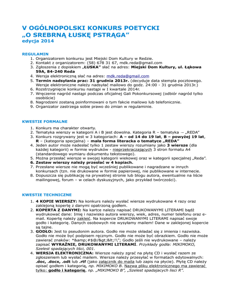 V OGÓLNOPOLSKI KONKURS POETYCKI „O SREBRNĄ ŁUSKĘ PSTRĄGA” edycja 2014 REGULAMIN 1. Organizatorem konkursu jest Miejski Dom Kultury w Redzie. 2. Kontakt z organizatorem: (58) 678 31 67, [email protected] 3. Zgłoszenia z dopiskiem „ŁUSKA” słać na adres: Miejski Dom Kultury, ul. Łąkowa 59A, 84-240 Reda 4. Wersja elektroniczną słać na adres: [email protected] 5. Termin nadsyłania prac: 31 grudnia 2013r. (decyduje data stempla pocztowego. Wersje elektroniczne należy nadsyłać mailowo do godz. 24:00 - 31 grudnia 2013r.) 6. Rozstrzygnięcie konkursu nastąpi w I kwartale 2014r. 7. Wręczenie nagród nastąpi podczas oficjalnej Gali Pokonkursowej (odbiór nagród tylko osobiście) 8. Nagrodzeni zostaną poinformowani o tym fakcie mailowo lub telefonicznie. 9. Organizator zastrzega sobie prawo do zmian w regulaminie. KWESTIE FORMALNE 1. Konkurs ma charakter otwarty. 2. Tematyka wierszy w kategorii A i B jest dowolna. Kategoria R – tematyka → „REDA” 3. Konkurs rozgrywany jest w 3 kategoriach: A – od 14 do 19 lat, B – powyżej 19 lat, R – (kategoria specjalna) – mała forma literacka o tematyce „REDA” 4. Jeden autor może nadesłać tylko 1 zestaw wierszy rozumiany jako 3 wiersze (dla każdej kategorii) w formie wydruków - nieprzekraczających 3 stron formatu A4 (standardowego wymiaru dokumentu tekstowego). 5. Można przesłać wiersze w swojej kategorii wiekowej oraz w kategorii specjalnej „Reda”. 6. Zestaw wierszy należy przesłać w 4 kopiach. 7. Przesłane wiersze nie mogą być wcześniej publikowane i nagradzane w innych konkursach (tzn. nie drukowane w formie papierowej, nie publikowane w internecie. 8. Dopuszcza się publikację na prywatnej stronie lub blogu autora, ewentualnie na liście mailingowej, forum – w celach dyskusyjnych, jako przykład twórczości). KWESTIE TECHNICZNE 1. 4 KOPIE WIERSZY: Na konkurs należy wysłać wiersze wydrukowane 4 razy oraz zaklejoną kopertę z danymi opatrzoną godłem. 2. KOPERTA Z DANYMI: Na kartce należy napisać DRUKOWANYMI LITERAMI bądź wydrukować dane: Imię i nazwisko autora wierszy, wiek, adres, numer telefonu oraz email. Kopertę należy zakleić. Na kopercie DRUKOWANYMI LITERAMI napisać swoje godło i kategorię. Danych osobowych nie wysyłamy mailem! Dane w zaklejonej kopercie są tajne. 3. GODŁO: Jest to pseudonim autora. Godło nie może składać się z imienia i nazwiska. Godło nie może być podpisem ręcznym. Godło nie może być obrazkiem. Godło nie może zawierać znaków: *&#$@/><!\”; Godło jeśli nie wydrukowane – należy zapisać WYRAŹNIE, DRUKOWANYMI LITERAMI. Przykłady godła: MIKIMOKO, Szelest spadających liści, 001. 4. WERSJA ELEKTRONICZNA: Wiersze należy zgrać na płytę CD i wysłać razem ze zgłoszeniem lub wysłać mailem. Wiersze należy przesyłać w formatach edytowalnych: .doc, .docx, .odt lub .rtf (jako załącznik do maila lub zapis na płycie). Płytę CD należy opisać godłem i kategorią, np. MIKIMOKO B. Nazwa pliku elektronicznego ma zawierać tylko: godło i kategorię, np. „MIKIMOKO B”, „Szelest spadajacych lisci R”. NAGRODY 1. W kategorii B przewiduje się nagrody: I miejsce – 1000 PLN i „Srebrną Łuskę Pstrąga”, II miejsce – 700 PLN, III miejsce – 400 PLN 2. W kategorii A przewidziane są nagrody rzeczowe za: I, II oraz III miejsce. 3. W kategorii R przewiduje się nagrodę specjalną Burmistrza Redy. 4. Prace nagrodzone zostaną wydane w zbiorczym Almanachu Pokonkursowym. 5. Nagrody należy odebrać osobiście w dniu oficjalnej Gali Pokonkursowej. Organizator nagród nie wysyła pocztą, ani też nie przekazuje na konto laureatów. 6. Laureaci na wręczenie nagród przyjeżdżają na koszt Organizatora (wyłącznie zwrot kosztu przejazdu osoby nagrodzonej – bilet II klasy PKP). 7. Istnieje możliwość odpłatnego noclegu w hotelu MOSIR. 8. Organizator zastrzega sobie prawo nieodpłatnej publikacji nagrodzonych i wyróżnionych prac w Almanachu Pokonkursowym. 9. Organizator zastrzega sobie prawo nieprzyznania niektórych nagród. 10.Oceny nadesłanych prac dokona jury w trzyosobowym składzie: Zbigniew Szymański, Aleksander Jurewicz, Tadeusz Buraczewski. Zapraszamy do udziału!