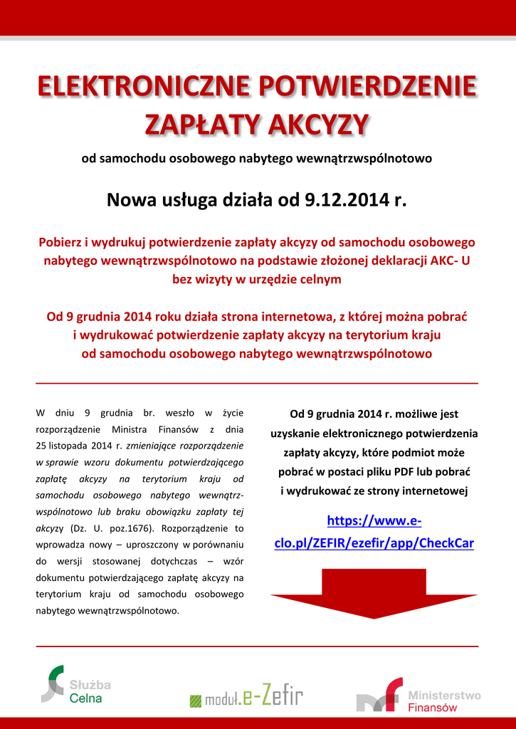 ELEKTRONICZNE POTWIERDZENIE ZAPŁATY AKCYZY od samochodu osobowego nabytego wewnątrzwspólnotowo Nowa usługa działa od 9.12.2014 r. Pobierz i wydrukuj potwierdzenie zapłaty akcyzy od samochodu osobowego nabytego wewnątrzwspólnotowo na podstawie złożonej deklaracji AKC- U bez wizyty w urzędzie celnym Od 9 grudnia 2014 roku działa strona internetowa, z której można pobrać i wydrukować potwierdzenie zapłaty akcyzy na terytorium kraju od samochodu osobowego nabytego wewnątrzwspólnotowo W dniu 9 grudnia br. weszło Ministra Finansów rozporządzenie w życie Od 9 grudnia 2014 r. możliwe jest z dnia uzyskanie elektronicznego potwierdzenia 25 listopada 2014 r. zmieniające rozporządzenie w sprawie wzoru dokumentu potwierdzającego zapłatę akcyzy na terytorium kraju od samochodu osobowego nabytego wewnątrzwspólnotowo lub braku obowiązku zapłaty tej akcyzy (Dz. U. poz.1676). Rozporządzenie to wprowadza nowy – uproszczony w porównaniu do wersji stosowanej dotychczas – wzór dokumentu potwierdzającego zapłatę akcyzy na terytorium kraju od samochodu osobowego nabytego wewnątrzwspólnotowo. zapłaty akcyzy, które podmiot może pobrać w postaci pliku PDF lub pobrać i wydrukować ze strony internetowej https://www.eclo.pl/ZEFIR/ezefir/app/CheckCar elektronicznej mogą dokonać wszelkich formalności związanych ze złożeniem deklaracji, dokonaniem przelewu oraz pobraniem potwierdzenia zapłaty akcyzy bez konieczności wizyty w urzędzie celnym. Wchodząc na tę stronę zainteresowana osoba może w prosty sposób wygenerować plik potwierdzenia w formacie PDF, a następnie – w zależności od potrzeby – plik ten pobrać lub dodatkowo wydrukować. Wystarczy jedynie wpisać numer VIN pojazdu lub numer Urzędowego Potwierdzenia Odbioru (tzw. UPO) złożonej elektronicznie deklaracji AKC-U. Potwierdzenie zapłaty akcyzy na wspomnianej stronie internetowej po dokonaniu zapłaty będzie podatku dostępne akcyzowego w pełnej kwocie wynikającej z deklaracji AKC-U. Strona jest aktualizowana jeden raz na dobę. Jednocześnie nadal możliwe jest uzyskanie potwierdzenia zapłaty akcyzy w formie papierowej w urzędzie celnym, jak miało to miejsce dotychczas. Tak pobrane i wydrukowane ze strony internetowej potwierdzenie stanowi podstawę do zarejestrowania samochodu osobowego na terytorium kraju zgodnie z przepisami o ruchu drogowym wyczerpując tym samym wymogi w zakresie akcyzy. Wprowadzone rozwiązanie jest dla podatnika znacznym ułatwieniem, gdyż ogranicza ilość wizyt w urzędzie celnym. Ci podatnicy, którzy składają deklarację AKC-U w formie