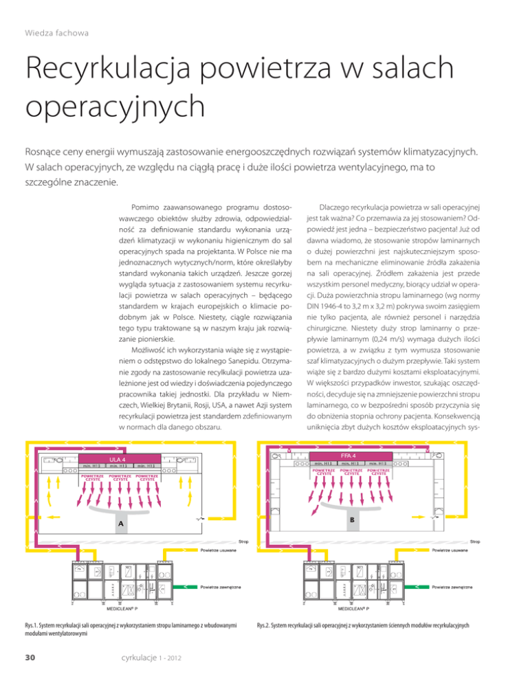 Wiedza fachowa Recyrkulacja powietrza w salach operacyjnych Rosnące ceny energii wymuszają zastosowanie energooszczędnych rozwiązań systemów klimatyzacyjnych. W salach operacyjnych, ze względu na ciągłą pracę i duże ilości powietrza wentylacyjnego, ma to szczególne znaczenie. Pomimo zaawansowanego programu dostosowawczego obiektów służby zdrowia, odpowiedzialność za definiowanie standardu wykonania urządzeń klimatyzacji w wykonaniu higienicznym do sal operacyjnych spada na projektanta. W Polsce nie ma jednoznacznych wytycznych/norm, które określałyby standard wykonania takich urządzeń. Jeszcze gorzej wygląda sytuacja z zastosowaniem systemu recyrkulacji powietrza w salach operacyjnych – będącego standardem w krajach europejskich o klimacie podobnym jak w Polsce. Niestety, ciągle rozwiązania tego typu traktowane są w naszym kraju jak rozwiązanie pionierskie. Możliwość ich wykorzystania wiąże się z wystąpieniem o odstępstwo do lokalnego Sanepidu. Otrzymanie zgody na zastosowanie recylkulacji powietrza uzależnione jest od wiedzy i doświadczenia pojedynczego pracownika takiej jednostki. Dla przykładu w Niemczech, Wielkiej Brytanii, Rosji, USA, a nawet Azji system recyrkulacji powietrza jest standardem zdefiniowanym w normach dla danego obszaru. Rys.1. System recyrkulacji sali operacyjnej z wykorzystaniem stropu laminarnego z wbudowanymi modułami wentylatorowymi 30 cyrkulacje 1 - 2012 Dlaczego recyrkulacja powietrza w sali operacyjnej jest tak ważna? Co przemawia za jej stosowaniem? Odpowiedź jest jedna – bezpieczeństwo pacjenta! Już od dawna wiadomo, że stosowanie stropów laminarnych o dużej powierzchni jest najskuteczniejszym sposobem na mechaniczne eliminowanie źródła zakażenia na sali operacyjnej. Źródłem zakażenia jest przede wszystkim personel medyczny, biorący udział w operacji. Duża powierzchnia stropu laminarnego (wg normy DIN 1946-4 to 3,2 m x 3,2 m) pokrywa swoim zasięgiem nie tylko pacjenta, ale również personel i narzędzia chirurgiczne. Niestety duży strop laminarny o przepływie laminarnym (0,24 m/s) wymaga dużych ilości powietrza, a w związku z tym wymusza stosowanie szaf klimatyzacyjnych o dużym przepływie. Taki system wiąże się z bardzo dużymi kosztami eksploatacyjnymi. W większości przypadków inwestor, szukając oszczędności, decyduje się na zmniejszenie powierzchni stropu laminarnego, co w bezpośredni sposób przyczynia się do obniżenia stopnia ochrony pacjenta. Konsekwencją uniknięcia zbyt dużych kosztów eksploatacyjnych sys- Rys.2. System recyrkulacji sali operacyjnej z wykorzystaniem ściennych modułów recyrkulacyjnych Wiedza fachowa temu klimatyzacji wykorzystującego 100% świeżego powietrza jest obniżenie bezpieczeństwa pacjenta! Zapomina się, że zainfekowany pacjent to dodatkowe koszty wynikające z jego hospitalizacji. Według badań przeprowadzonych w Niemczech (1998 r.) średni pobyt zainfekowanego pacjenta po przebytej operacji to dodatkowe 15 dni w szpitalu. Koszty z tym związane to 718 mln euro w skali roku. Te same badania wykazały, że na 100% wszystkich infekcji na bloku operacyjnym aż 95 % ma miejsce w trakcie trwania operacji. Obecnie na rynku ogólnoświatowym dostępne są trzy systemy rozwiązań recyrkulacji powietrza dla sal operacyjnych. Pierwszym rozwiązaniem jest zastosowanie stropów laminarnych wraz z wbudowanymi sekcjami wentylatorów po obu stronach stropu, które stanowią integralną jego część. W tym przypadku powietrze świeże dostarczane jest przez szafę klimatyzacyjną nawiewno-wywiewną i doprowadzone kanałami do sali operacyjnej poprzez strop laminarny. Pozostała część powietrza jest recyrkulowana w obrębie sali operacyjnej przez sam strop laminarny poprzez wykorzystanie sekcji z wbudowanymi wentylatorami. Drugim rozwiązaniem jest system składający się z szafy klimatyzacyjnej nawiewno-wywiewnej, stropu laminarnego oraz recyrkulacyjnych modułów ściennych (instalowanych na/w ścianie sali operacyjnej lub bezpośrednio za ścianą). Część powietrza (świeżego) dostarczana jest przez szafę klimatyzacyjną i doprowadzana kanałami do sali operacyjnej poprzez strop laminarny. Pozostała część powietrza jest recyrkulowa- na w obrębie sali operacyjnej przez recyrkulacyjne moduły ścienne. Moduły te stanowią wyposażenie stropu laminarnego, mają filtry i mogą być wyposażone (na życzenie) w chłodnicę suchą. Trzecim rozwiązaniem jest system składający się z szafy klimatyzacyjnej nawiewno-wywiewnej, stropu laminarnego oraz jednomodułowych szaf recyrkulacyjnych (instalowanych w maszynowni) mających nagrzewnicę, chłodnicę i nawilżacz. Mieszanina powietrza świeżego (z szafy nawiewno-wywiewnej) i zawracanego (z sali operacyjnej) obrabiana jest w szafie recyrkulacyjnej i odpowiednio uzdatnione powietrze jest doprowadzanie kanałem do klimatyzowanych pomieszczeń. Takie rozwiązanie pozwala klimatyzować kilka sal operacyjnych jedną szafą nawiewno-wywiewną przy zapewnieniu precyzyjnej regulacji temperatury i wilgotności niezależnie w każdej sali. Ponadto, dla każdej sali operacyjnej ilość świeżego powietrza może być regulowana niezależnie. Zaletą wszystkich powyższych rozwiązań jest możliwość zastosowania szafy klimatyzacyjnej nawiewno-wywiewnej o mniejszej wydajności, a co za tym idzie, obniżenie kosztów eksploatacji przy jednoczesnym wykorzystaniu stropów laminarnych o dużej powierzchni. Powyższe rozwiązanie jest najbardziej optymalne zarówno ze względu na bezpieczeństwo pacjenta, jak i koszty eksploatacyjne systemu klimatyzacji sal operacyjnych. ❚ Rys.3. System recyrkulacji trzech sal operacyjnych z wykorzystaniem jednomodułowych szaf klimatyzacyjnych regulujących indywidualnie parametry powietrza na poszczególnych salach Krzysztof Sitko MED Technik Polska www.cyrkulacje.pl 31