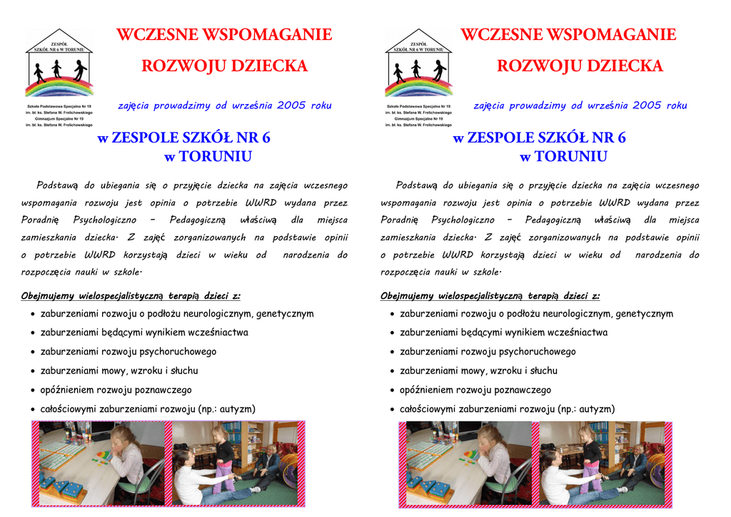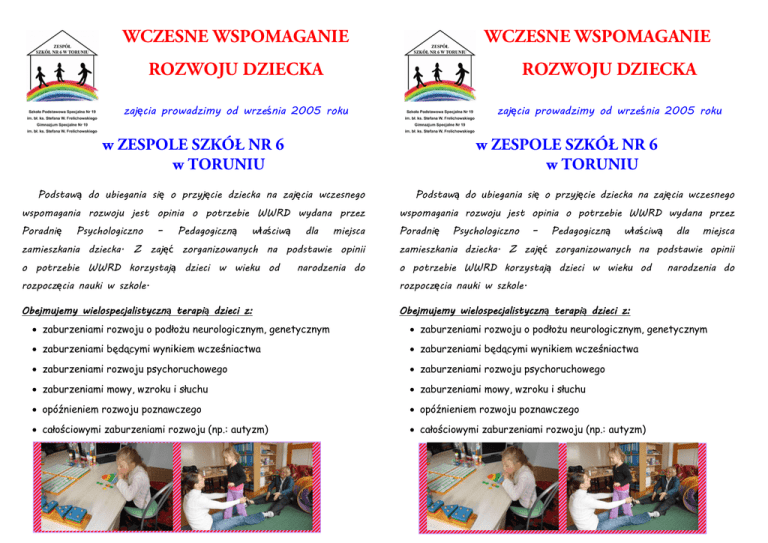 WCZESNE WSPOMAGANIE WCZESNE WSPOMAGANIE ROZWOJU DZIECKA ROZWOJU DZIECKA zajęcia prowadzimy od września 2005 roku zajęcia prowadzimy od września 2005 roku w ZESPOLE SZKÓŁ NR 6 w TORUNIU w ZESPOLE SZKÓŁ NR 6 w TORUNIU Podstawą do ubiegania się o przyjęcie dziecka na zajęcia wczesnego Podstawą do ubiegania się o przyjęcie dziecka na zajęcia wczesnego wspomagania rozwoju jest opinia o potrzebie WWRD wydana przez wspomagania rozwoju jest opinia o potrzebie WWRD wydana przez Poradnię Poradnię Psychologiczno – Pedagogiczną właściwą dla miejsca Psychologiczno – Pedagogiczną właściwą dla miejsca zamieszkania dziecka. Z zajęć zorganizowanych na podstawie opinii zamieszkania dziecka. Z zajęć zorganizowanych na podstawie opinii o potrzebie WWRD korzystają dzieci w wieku od o potrzebie WWRD korzystają dzieci w wieku od narodzenia do rozpoczęcia nauki w szkole. rozpoczęcia nauki w szkole. Obejmujemy wielospecjalistyczną terapią dzieci z: Obejmujemy wielospecjalistyczną terapią dzieci z: narodzenia do • zaburzeniami rozwoju o podłożu neurologicznym, genetycznym • zaburzeniami rozwoju o podłożu neurologicznym, genetycznym • zaburzeniami będącymi wynikiem wcześniactwa • zaburzeniami będącymi wynikiem wcześniactwa • zaburzeniami rozwoju psychoruchowego • zaburzeniami rozwoju psychoruchowego • zaburzeniami mowy, wzroku i słuchu • zaburzeniami mowy, wzroku i słuchu • opóźnieniem rozwoju poznawczego • opóźnieniem rozwoju poznawczego • całościowymi zaburzeniami rozwoju (np.: autyzm) • całościowymi zaburzeniami rozwoju (np.: autyzm) Ważnym elementem terapii w Zespole WWRD jest współpraca Ważnym elementem terapii w Zespole WWRD jest współpraca z rodzicami i rodziną dziecka z rodzicami i rodziną dziecka Pomoc w stosunku do rodziców dziecka dotyczy m.in.: • wspierania rodziców w roli świadomego partnera komunikacji dziecka • rozpoznawania zachowań dziecka, ich prawidłowej interpretacji i reakcji na nie • instruktażu i poradnictwa w zakresie działań rewalidacyjnych Pomoc w stosunku do rodziców dziecka dotyczy m.in.: • wspierania rodziców w roli świadomego partnera komunikacji dziecka • rozpoznawania zachowań dziecka, ich prawidłowej interpretacji i reakcji na nie • instruktażu i poradnictwa w zakresie działań rewalidacyjnych W skład Zespołu WWRD obok rodziców/ opiekunów prawnych dziecka W skład Zespołu WWRD obok rodziców/ opiekunów prawnych dziecka wchodzą: wchodzą: • • • • psycholog pedagog specjalny logopeda/neurologopedia/surdologopeda fizjoterapeuta/rehabilitant • • • • psycholog pedagog specjalny logopeda/neurologopedia/surdologopeda fizjoterapeuta/rehabilitant Metody stosowane przez Zespół WWRD: Metody stosowane przez Zespół WWRD: • AAC - Alternatywne i wspomagające metody komunikacji (Makaton, Bliss,Piktogramy). Metody te mają na celu umożliwienie komunikowania się osobom, które nie posiadają umiejętności mowy. U małych dzieci z zaburzeniami rozwoju, których mowa nie rozwija się o czasie używa się komunikacji wspomagającej, aby utorować rozwój języka i mowy, jeśli tylko warunki neurobiologiczne u dziecka na to pozwalają. • Trening uwagi sł uchowej A. Tomatisa – Polega na usprawnianiu funkcji słuchowej, dzięki czemu dochodzi do poprawy koncentracji uwagi, jakości uczenia się, wspierania funkcji językowych i komunikacyjnych. • SI – Integracja Sensoryczna Celem SI są ćwiczenia stymulujące układ nerwowy do prawidłowego odbierania, przetwarzania oraz odpowiedzi na bodźce ze środowiska i własnego ciała. • Metoda Ruchu Rozwijającego Weroniki Sherborne Metoda prowadzi do wyrównywania opóźnień w sferze emocjonalnej, społecznej, uczy współdziałania z partnerem. • Metoda Marii Montessori Ćwiczenia wspierające spontaniczność i twórczość dziecka oraz umożliwiające wszechstronny rozwój fizyczny i społeczny. • AAC - Alternatywne i wspomagające metody komunikacji (Makaton, Bliss,Piktogramy). Metody te mają na celu umożliwienie komunikowania się osobom, które nie posiadają umiejętności mowy. U małych dzieci z zaburzeniami rozwoju, których mowa nie rozwija się o czasie używa się komunikacji wspomagającej, aby utorować rozwój języka i mowy, jeśli tylko warunki neurobiologiczne u dziecka na to pozwalają. • Trening uwagi sł uchowej A. Tomatisa – Polega na usprawnianiu funkcji słuchowej, dzięki czemu dochodzi do poprawy koncentracji uwagi, jakości uczenia się, wspierania funkcji językowych i komunikacyjnych. • SI – Integracja Sensoryczna Celem SI są ćwiczenia stymulujące układ nerwowy do prawidłowego odbierania, przetwarzania oraz odpowiedzi na bodźce ze środowiska i własnego ciała. • Metoda Ruchu Rozwijającego Weroniki Sherborne Metoda prowadzi do wyrównywania opóźnień w sferze emocjonalnej, społecznej, uczy współdziałania z partnerem. • Metoda Marii Montessori Ćwiczenia wspierające spontaniczność i twórczość dziecka oraz umożliwiające wszechstronny rozwój fizyczny i społeczny. Kontakt: Zespół Szkół Nr 6 w Toruniu, ul. Dziewulskiego 41c tel./fax 056 650 80 30; 650 80 17 strona: WWW.zs6torun.com Kontakt: Zespół Szkół Nr 6 w Toruniu, ul. Dziewulskiego 41c tel./fax 056 650 80 30; 650 80 17 strona: WWW.zs6torun.com