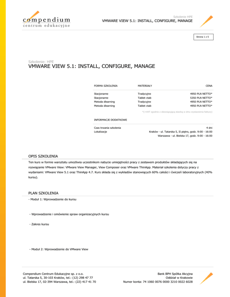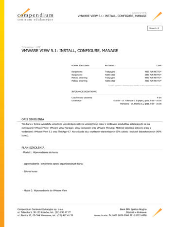 Szkolenie HPE VMWARE VIEW 5.1: INSTALL, CONFIGURE, MANAGE Strona 1 z 5 Szkolenie: HPE VMWARE VIEW 5.1: INSTALL, CONFIGURE, MANAGE FORMA SZKOLENIA MATERIAŁY CENA Stacjonarne Tradycyjne 4950 PLN NETTO* Stacjonarne Tablet ctab 5350 PLN NETTO* Metoda dlearning Tradycyjne 4950 PLN NETTO* Metoda dlearning Tablet ctab 4950 PLN NETTO* *(+VAT zgodnie z obowiązującą stawką w dniu wystawienia faktury) INFORMACJE DODATKOWE Czas trwania szkolenia Lokalizacje 4 dni Kraków - ul. Tatarska 5, II piętro, godz. 9:00 - 16:00 Warszawa - ul. Bielska 17, godz. 9:00 - 16:00 OPIS SZKOLENIA Ten kurs w formie warsztatu umożliwia uczestnikom nabycie umiejętności pracy z zestawem produktów składających się na rozwiązanie VMware View: VMware View Manager, View Composer oraz VMware ThinApp. Materiał szkolenia dotyczy pracy z wydaniami: VMware View 5.1 oraz ThinApp 4.7. Kurs składa się z wykładów stanowiących 60% całości i ćwiczeń laboratoryjnych (40% kursu). PLAN SZKOLENIA - Moduł 1: Wprowadzenie do kursu - Wprowadzenie i omówienie spraw organizacyjnych kursu - Zakres kursu - Moduł 2: Wprowadzenie do VMware View Compendium Centrum Edukacyjne sp. z o.o. ul. Tatarska 5, 30-103 Kraków, tel.: (12) 298 47 77 ul. Bielska 17, 02-394 Warszawa, tel.: (22) 417 41 70 Bank BPH Spółka Akcyjna Oddział w Krakowie Numer konta: 74 1060 0076 0000 3210 0022 6028 Szkolenie HPE VMWARE VIEW 5.1: INSTALL, CONFIGURE, MANAGE Strona 2 z 5 - Cechy i składniki wchodzące w skład rozwiązania View - Moduł 3: View Connection Server - Instalacja i konfiguracja - Moduł 4: Wirtualne desktopy w VMware View - View Agent - PCoIP oraz RDP jako protokoły zdalnego dostępu (wyświetlania) - Przekierowania USB i przekierowania multimediów - Moduł 5: Warianty klienckie w View - View Client - Tryb lokalny w View Client - Thin clients oraz Zero clients - Drukowanie w środowisku wirtualnym z użyciem View Client - Moduł 6: View Administrator - Konfigurowanie środowiska View Compendium Centrum Edukacyjne sp. z o.o. ul. Tatarska 5, 30-103 Kraków, tel.: (12) 298 47 77 ul. Bielska 17, 02-394 Warszawa, tel.: (22) 417 41 70 Bank BPH Spółka Akcyjna Oddział w Krakowie Numer konta: 74 1060 0076 0000 3210 0022 6028 Szkolenie HPE VMWARE VIEW 5.1: INSTALL, CONFIGURE, MANAGE Strona 3 z 5 - Zarządzanie użytkownikami, sesjami oraz ustawieniami konfiguracyjnymi - Konfigurowanie i wdrażanie automatycznych pól desktopów - Delegowana administracja oparta na wykorzystaniu ról - Monitorowanie środowiska View - Moduł 7: Konfigurowanie i zarządzanie dowiązanymi klonami - Czynności wykonywane przez View Composer - Konfigurowanie i wdrażanie desktopów korzystających z mechanizmu dowiązanych klonów - Zarządzanie dowiązanymi klonami desktopów - Zarządzanie dyskami trwałymi (persistent) - Moduł 8: Desktopy w trybie lokalnym - Konfigurowanie desktopów w trybie lokalnym - View Transfer Server oraz jego repozytoria - Operacje możliwe do wykonania w trybie lokalnym - Moduł 9: Zarządzanie bezpieczeństwem VMware View - Opcje konfigurowania połączeń i uwierzytelniania w sieci - Konfigurowanie serwera zabezpieczeń View (View Security Server) Compendium Centrum Edukacyjne sp. z o.o. ul. Tatarska 5, 30-103 Kraków, tel.: (12) 298 47 77 ul. Bielska 17, 02-394 Warszawa, tel.: (22) 417 41 70 Bank BPH Spółka Akcyjna Oddział w Krakowie Numer konta: 74 1060 0076 0000 3210 0022 6028 Szkolenie HPE VMWARE VIEW 5.1: INSTALL, CONFIGURE, MANAGE Strona 4 z 5 - Moduł 10: View Persona Management - Konfigurowanie profili użytkownika przy wykorzystaniu View Persona Management - View Persona Management oraz profile wędrujące (roaming) Windows - Konfigurowanie wdrażania View Persona Management - Najlepsze praktyki dla wdrażania View Persona Management - Moduł 11: Narzędzia wiersza polecenia i wykonywanie kopii zapasowej - Narzędzie vdmadmin - Klienci pracujący w trybie kiosku - Przygotowywanie kopii zapasowej bazy danych View - Odtwarzanie bazy danych View (z wykorzystaniem utworzonego backupu) - Moduł 12: Wydajność i skalowalność rozwiązania View Connection Server - Serwery replikujące obsługi połączeń - Rozważania odnośnie metod poprawy wydajności i rozkładania obciążenia - Moduł 13: VMware ThinApp Compendium Centrum Edukacyjne sp. z o.o. ul. Tatarska 5, 30-103 Kraków, tel.: (12) 298 47 77 ul. Bielska 17, 02-394 Warszawa, tel.: (22) 417 41 70 Bank BPH Spółka Akcyjna Oddział w Krakowie Numer konta: 74 1060 0076 0000 3210 0022 6028 Szkolenie HPE VMWARE VIEW 5.1: INSTALL, CONFIGURE, MANAGE Strona 5 z 5 - Użycie ThinApp do przechwycenia aplikacji - Wdrażanie i aktualizacja paczek aplikacji w ThinApp - Zarządzanie aplikacjami ThinApp w View WYMAGANIA DLA UCZESTNIKA - Doświadczenie w administrowaniu Microsoft Windows Active Directory - Doświadczenie w pracy z rozwiązaniami VMware vSphere CERTYFIKATY Uczestnicy otrzymują po zakończeniu szkolenia zaświadczenie o ukończeniu autoryzowanego kursu VMware, sygnowane przez HPE. PROWADZĄCY Autoryzowany wykładowca firmy VMware (VCI). Compendium Centrum Edukacyjne sp. z o.o. ul. Tatarska 5, 30-103 Kraków, tel.: (12) 298 47 77 ul. Bielska 17, 02-394 Warszawa, tel.: (22) 417 41 70 Bank BPH Spółka Akcyjna Oddział w Krakowie Numer konta: 74 1060 0076 0000 3210 0022 6028