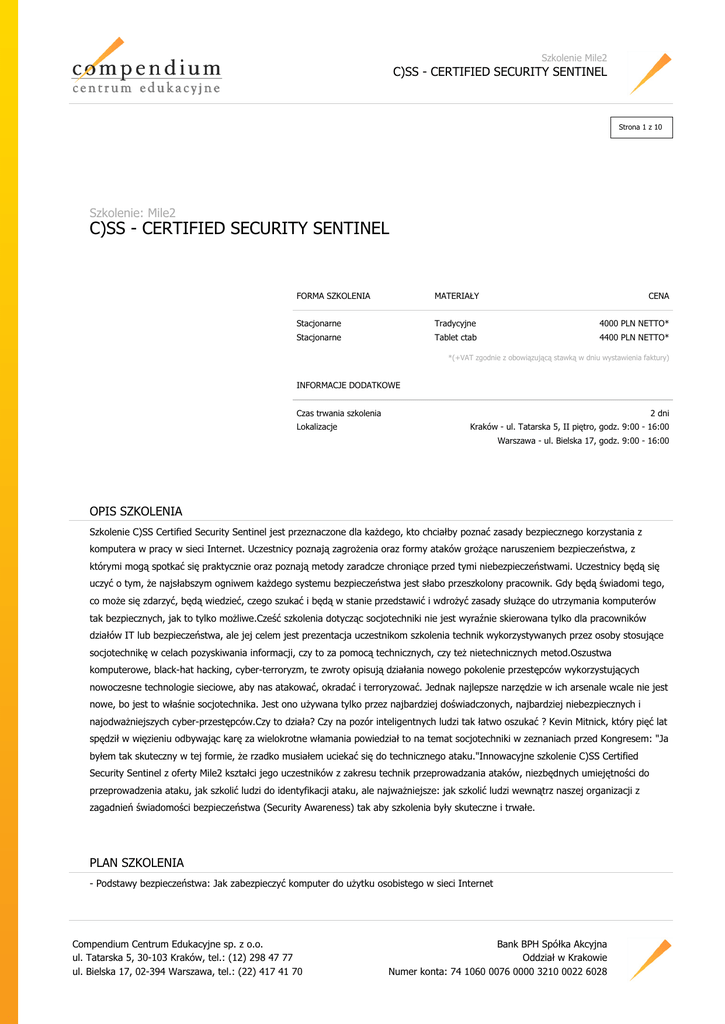 Szkolenie Mile2 C)SS - CERTIFIED SECURITY SENTINEL Strona 1 z 10 Szkolenie: Mile2 C)SS - CERTIFIED SECURITY SENTINEL FORMA SZKOLENIA MATERIAŁY CENA Stacjonarne Tradycyjne 4000 PLN NETTO* Stacjonarne Tablet ctab 4400 PLN NETTO* *(+VAT zgodnie z obowiązującą stawką w dniu wystawienia faktury) INFORMACJE DODATKOWE Czas trwania szkolenia Lokalizacje 2 dni Kraków - ul. Tatarska 5, II piętro, godz. 9:00 - 16:00 Warszawa - ul. Bielska 17, godz. 9:00 - 16:00 OPIS SZKOLENIA Szkolenie C)SS Certified Security Sentinel jest przeznaczone dla każdego, kto chciałby poznać zasady bezpiecznego korzystania z komputera w pracy w sieci Internet. Uczestnicy poznają zagrożenia oraz formy ataków grożące naruszeniem bezpieczeństwa, z którymi mogą spotkać się praktycznie oraz poznają metody zaradcze chroniące przed tymi niebezpieczeństwami. Uczestnicy będą się uczyć o tym, że najsłabszym ogniwem każdego systemu bezpieczeństwa jest słabo przeszkolony pracownik. Gdy będą świadomi tego, co może się zdarzyć, będą wiedzieć, czego szukać i będą w stanie przedstawić i wdrożyć zasady służące do utrzymania komputerów tak bezpiecznych, jak to tylko możliwe.Cześć szkolenia dotycząc socjotechniki nie jest wyraźnie skierowana tylko dla pracowników działów IT lub bezpieczeństwa, ale jej celem jest prezentacja uczestnikom szkolenia technik wykorzystywanych przez osoby stosujące socjotechnikę w celach pozyskiwania informacji, czy to za pomocą technicznych, czy też nietechnicznych metod.Oszustwa komputerowe, black-hat hacking, cyber-terroryzm, te zwroty opisują działania nowego pokolenie przestępców wykorzystujących nowoczesne technologie sieciowe, aby nas atakować, okradać i terroryzować. Jednak najlepsze narzędzie w ich arsenale wcale nie jest nowe, bo jest to właśnie socjotechnika. Jest ono używana tylko przez najbardziej doświadczonych, najbardziej niebezpiecznych i najodważniejszych cyber-przestępców.Czy to działa? Czy na pozór inteligentnych ludzi tak łatwo oszukać ? Kevin Mitnick, który pięć lat spędził w więzieniu odbywając karę za wielokrotne włamania powiedział to na temat socjotechniki w zeznaniach przed Kongresem: "Ja byłem tak skuteczny w tej formie, że rzadko musiałem uciekać się do technicznego ataku."Innowacyjne szkolenie C)SS Certified Security Sentinel z oferty Mile2 kształci jego uczestników z zakresu technik przeprowadzania ataków, niezbędnych umiejętności do przeprowadzenia ataku, jak szkolić ludzi do identyfikacji ataku, ale najważniejsze: jak szkolić ludzi wewnątrz naszej organizacji z zagadnień świadomości bezpieczeństwa (Security Awareness) tak aby szkolenia były skuteczne i trwałe. PLAN SZKOLENIA - Podstawy bezpieczeństwa: Jak zabezpieczyć komputer do użytku osobistego w sieci Internet Compendium Centrum Edukacyjne sp. z o.o. ul. Tatarska 5, 30-103 Kraków, tel.: (12) 298 47 77 ul. Bielska 17, 02-394 Warszawa, tel.: (22) 417 41 70 Bank BPH Spółka Akcyjna Oddział w Krakowie Numer konta: 74 1060 0076 0000 3210 0022 6028 Szkolenie Mile2 C)SS - CERTIFIED SECURITY SENTINEL Strona 2 z 10 - Jakie są zagrożenia? - Znane zagrożenia - Czy wiesz, że? - Co trzeba wiedzieć! - "Hacker" - cyber-przestępca - Co to jest kradzież tożsamości? - Walka z kradzieżą tożsamości - Praktyka - Demo - Nie panikuj! - Świadomość użytkownika (User Awareness) - Wprowadzenie - Ataki skierowane na użytkownika - Świadomość użytkownika - Hasła - Generowanie haseł - Śledzenie haseł - eWallet - Narzędzia szyfrujące Compendium Centrum Edukacyjne sp. z o.o. ul. Tatarska 5, 30-103 Kraków, tel.: (12) 298 47 77 ul. Bielska 17, 02-394 Warszawa, tel.: (22) 417 41 70 Bank BPH Spółka Akcyjna Oddział w Krakowie Numer konta: 74 1060 0076 0000 3210 0022 6028 Szkolenie Mile2 C)SS - CERTIFIED SECURITY SENTINEL Strona 3 z 10 - Inne opcje niż hasło - Konto administratora systemu Windows - Demo - Procesy systemu Windows - Menedżer zadań - Karta procesów - Wyszukiwanie procesów - Poszukiwanie w sieci Web - Informacje o procesach - Zły proces - Usuwanie podejrzanych procesów - Start-up Tuners - Pobieranie - Użytkownik - Linki w wiadomościach E-mail - Demo - Wdrażanie środków zaradczych - Wprowadzenie - Rozwiązania do ochrony połączenia z Internetem - Wybór pakietu Compendium Centrum Edukacyjne sp. z o.o. ul. Tatarska 5, 30-103 Kraków, tel.: (12) 298 47 77 ul. Bielska 17, 02-394 Warszawa, tel.: (22) 417 41 70 Bank BPH Spółka Akcyjna Oddział w Krakowie Numer konta: 74 1060 0076 0000 3210 0022 6028 Szkolenie Mile2 C)SS - CERTIFIED SECURITY SENTINEL Strona 4 z 10 - Free Anti-Virus & Spyware - Free Anti-Malware & Anti Spyware - Aktualizacja - Planowanie skanowania - Demo - Zarzadzanie aktualizacjami - Demo - Internetowe anonimizery - W jaki sposób one działają - Demo - Niezbędna świadomość bezpieczeństwo dla każdego - Dlaczego tu jesteś? - Odpowiedzialności pracodawcy - Kroki do skutecznego programu bezpieczeństwa - Zaczynając od góry - Dlaczego to wszystko ma znaczenie - Obszary zainteresowania - Co jest w tym wszystkim jest dla mnie? - Format szkoleń Compendium Centrum Edukacyjne sp. z o.o. ul. Tatarska 5, 30-103 Kraków, tel.: (12) 298 47 77 ul. Bielska 17, 02-394 Warszawa, tel.: (22) 417 41 70 Bank BPH Spółka Akcyjna Oddział w Krakowie Numer konta: 74 1060 0076 0000 3210 0022 6028 Szkolenie Mile2 C)SS - CERTIFIED SECURITY SENTINEL Strona 5 z 10 - Korzystanie z sieci Internet w pracy - Omawiane zagadnienia - Dlaczego nie mogę po prostu robić tego co chcę? - Zasady dopuszczalnego użytkowania Internetu - Internet w Pracy - Podstawy Internetu - Zagrożenia internetowe - Dostęp do Internetu - Twoje przeglądarki - ActiveX i Java - Pliki multimedialne - E-Mail - Chat - Sklepy Web - Proxy Web - Sieci P2P - Spyware - Środki zaradcze - Demo - Dostęp do sieci firmowej poprzez przypisany służbowy komputer Compendium Centrum Edukacyjne sp. z o.o. ul. Tatarska 5, 30-103 Krak