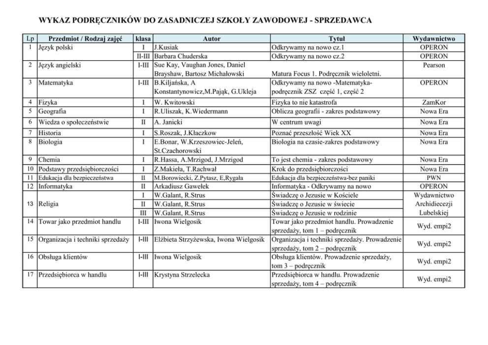 WYKAZ PODRĘCZNIKÓW DO ZASADNICZEJ SZKOŁY ZAWODOWEJ - SPRZEDAWCA Przedmiot / Rodzaj zajęć 1 Język polski Lp 2 Język angielski klasa Autor I J.Kusiak II-III Barbara Chuderska I-III Sue Kay, Vaughan Jones, Daniel Brayshaw, Bartosz Michałowski I-III B.Kiljańska, A Konstantynowicz,M.Pająk, G.Ukleja Tytuł Odkrywamy na nowo cz.1 Odkrywamy na nowo cz.2 Wydawnictwo OPERON OPERON Pearson Matura Focus 1. Podręcznik wieloletni. Odkrywamy na nowo -Matematykapodręcznik ZSZ część 1, część 2 OPERON 3 Matematyka 4 5 Fizyka Geografia I I W. Kwitowski R.Uliszak, K.Wiedermann Fizyka to nie katastrofa Oblicza geografii - zakres podstawowy ZamKor Nowa Era 6 Wiedza o społeczeństwie II A. Janicki W centrum uwagi Nowa Era 7 8 Historia Biologia I I Poznać przeszłość Wiek XX Biologia na czasie-zakres podstawowy Nowa Era Nowa Era To jest chemia - zakres podstawowy Krok do przedsiębiorczości Nowa Era Nowa Era PWN 9 Chemia 10 Podstawy przedsiębiorczości I I S.Roszak, J.Kłaczkow E.Bonar, W.Krzeszowiec-Jeleń, St.Czachorowski R.Hassa, A.Mrzigod, J.Mrzigod Z.Makieła, T.Rachwał 11 Edukacja dla bezpieczeństwa II M.Borowiecki, Z.Pytasz, E,Rygała Edukacja dla bezpieczeństwa-bez paniki Arkadiusz Gawełek W.Galant, R.Strus W.Galant, R.Strus W.Galant, R.Strus Iwona Wielgosik Informatyka - Odkrywamy na nowo Świadczę o Jezusie w Kościele Świadczę o Jezusie w świecie Świadczę o Jezusie w rodzinie Towar jako przedmiot handlu. Prowadzenie sprzedaży, tom 1 – podręcznik Organizacja i techniki sprzedaży. Prowadzenie sprzedaży, tom 2 – podręcznik Obsługa klientów. Prowadzenie sprzedaży, tom 3 – podręcznik Przedsiębiorca w handlu. Prowadzenie sprzedaży, tom 4 – podręcznik 12 Informatyka 14 Towar jako przedmiot handlu II I II III I-III 15 Organizacja i techniki sprzedaży I-III Elżbieta Strzyżewska, Iwona Wielgosik 16 Obsługa klientów I-III Iwona Wielgosik 17 Przedsiębiorca w handlu I-III Krystyna Strzelecka 13 Religia OPERON Wydawnictwo Archidiecezji Lubelskiej Wyd. empi2 Wyd. empi2 Wyd. empi2 Wyd. empi2