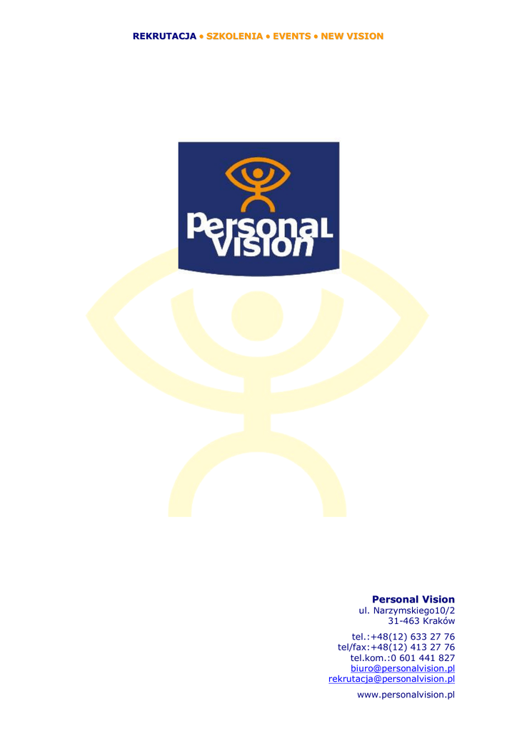 REKRUTACJA • SZKOLENIA • EVENTS • NEW VISION Personal Vision ul. Narzymskiego10/2 31-463 Kraków tel.:+48(12) 633 27 76 tel/fax:+48(12) 413 27 76 tel.kom.:0 601 441 827 [email protected] [email protected] www.personalvision.pl REKRUTACJA • SZKOLENIA • • EVENTS • NEW VISION Szanowni Państwo, Jest nam niezmiernie miło przedstawić Państwu ofertę usług naszej firmy. Mamy nadzieję, że niniejsza oferta zainteresuje Państwa i stanie się początkiem długotrwałej i owocnej współpracy. Firma Personal Vision powstała bowiem, aby wspierać swoich Klientów w zakresie doboru oraz rozwoju kadry kierowniczej, zarządzającej i specjalistycznej, podnosząc tym samym wydajność i efektywność pracy. Wspierając Państwa w zakresie zarządzania kapitałem ludzkim, pomagamy minimalizować koszty związane z zarządzaniem tym najcenniejszym z zasobów firmy oraz przyczyniamy się do wzrostu efektywności działania naszych Klientów. Aby zapewnić najwyższą jakość świadczonych usług, zespół naszych pracowników stanowią najwyższej klasy specjaliści w dziedzinie organizacji i zarządzania przedsiębiorstwem. Działając w zgodzie z zasadami etyki biznesu, chronimy dobre imię naszej firmy oraz firm naszych Klientów. Jesteśmy przekonani, że współpraca z naszą firmą, nie tylko zaspokoi Państwa potrzeby operacyjne, ale również przełoży się na wymierne efekty osiągane przez Państwa firmę w dłuższej perspektywie czasu. Zapraszamy do współpracy! Zespół Personal Vision PERSONAL VISION • NOWE PERSPEKTYWY W DORADZTWIE PERSONALNYM 2 REKRUTACJA • SZKOLENIA • • EVENTS • NEW VISION Komu pomagamy Czym się zajmujemy Rekrutacja klasyczna • Opracowanie i emisja ogłoszeń • Opracowanie i emisja ogłoszeń + preselekcja • Pełny proces rekrutacyjny • Direct search • Rekrutacja wewnętrzna • Przeprowadzenie i analiza testów psychologicznych • Testy specjalistyczne • Rozmowa oceniająca z konsultantem Rekrutacje niekonwencjonalne – projekty łączone Realizowanie projektów rekrutacyjnych Raportowanie Gwarancja Zasady współpracy Warunki płatności Ponadto oferujemy… PERSONAL VISION • NOWE PERSPEKTYWY W DORADZTWIE PERSONALNYM 3 REKRUTACJA • SZKOLENIA • • EVENTS • NEW VISION Komu pomagamy Kierujemy naszą ofertę zarówno do dużych przedsiębiorstw jak i do małych i średnich firm. Każdy Klient jest dla nas ważny, każdego traktujemy indywidualnie, dostosowujemy nasze usługi do specyficznych potrzeb, wymagań i oczekiwań. Jesteśmy elastyczni i otwarci na niekonwencjonalne pomysły, nasze projekty tworzymy z pasją. Czym się zajmujemy Rekrutujemy, szkolimy, budujemy i pracujemy nad rozwojem wewnętrznych struktur firmy. Do projektów wprowadzamy innowacje, niestandardowe techniki, łączymy tradycję z nowoczesną formą. Stosujemy klasyczne metody pozyskiwania pracowników oraz wprowadzamy usługi HR w nowej perspektywie. Rekrutacja klasyczna Podstawowym celem i oczekiwanym rezultatem procesu rekrutacji i selekcji jest wybranie właściwej osoby na określone stanowisko. Stawiamy na osobowość Kandydata, na precyzyjne dopasowanie człowieka do charakteru pracy, wymagań współpracowników i przełożonych jak również do atmosfery i relacji panujących w firmie Klienta. Każdy projekt rekrutacyjny rozpoczynamy od poznania kultury organizacyjnej firmy Klienta oraz wymagań obsadzanego stanowiska pracy. Na wszystkich etapach rekrutacji ściśle współpracujemy z Klientem, co pozwala niemalże wyeliminować ryzyko dokonania niewłaściwego wyboru. Specjalizujemy się w realizacji projektów z zakresu rekrutacji oraz selekcji pracowników na stanowiska specjalistyczne i kierownicze wszystkich szczebli zarządzania. W skład oferty wchodzą: • Opracowanie i emisja ogłoszeń • Prowadzicie Państwo procesy rekrutacyjne we własnym zakresie, ale nie chcecie poświęcać czasu na formalności związane z opracowaniem i emisją ogłoszenia? Jest to usługa przeznaczona dla firm, które zamierzają przeprowadzić proces rekrutacyjny we własnym zakresie. Oferujemy naszą pomoc w przygotowaniu treści oferty (w oparciu o opracowany profil idealnego kandydata), w wizualnym opracowaniu modułów do druku oraz korzystne rabaty w zakresie emisji ogłoszeń. Ogłoszenie emitowane będzie w Państwa szacie graficznej lub, w celu ukrycia tożsamości Klienta, w naszym formacie. Państwa oferta ukaże się w prasie oraz w wybranych portalach tematycznych poświęconych pracy. Korzyści jakie odniosą Państwo korzystając z tej usługi to przede wszystkim: wykorzystanie doświadczenia naszych konsultantów w zakresie najkorzystniejszej lokalizacji ogłoszenia na określone stanowisko pracy • PERSONAL VISION • NOWE PERSPEKTYWY W DORADZTWIE PERSONALNYM 4 REKRUTACJA • SZKOLENIA • • EVENTS • NEW VISION wykorzystanie doświadczenia naszych konsultantów w zakresie redakcji ogłoszeń zwiększających skuteczność ich oddziaływania • wykorzystanie opracowanej przez naszych konsultantów formuły ogłoszenia, zawierającej najważniejsze informacje ujęte w logicznym i czytelnym układzie • oszczędność czasu wynikająca z przejęcia obowiązku redakcji oraz emisji ogłoszeń przez naszych konsultantów • oszczędność finansowa wynikająca z wykorzystania rabatów jakie nasza firma otrzymuje od gazet z uwagi na stałą współpracę • Każde ogłoszenie może ukazać się zarówno w prasie, jak i na stronach internetowych naszej firmy oraz wybranych portali tematycznych poświęconych pracy. Wszystkie aplikacje w odpowiedzi na ogłoszenie spływać będą bezpośrednio na adres naszej firmy • Opracowanie i emisja ogłoszeń + preselekcja • Prowadzicie Państwo proces rekrutacji we własnym zakresie ale nie chcecie zajmować się emisją ogłoszenia, przyjmowaniem i wstępną selekcją napływających aplikacji? Jest to usługa skierowana do firm, które w przeważającej części samodzielnie realizują