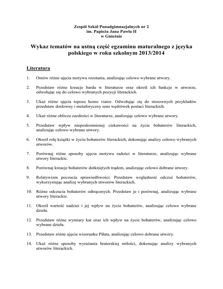 Zespół Szkół Ponadgimnazjalnych nr 2 im. Papieża Jana Pawła II w Gnieźnie Wykaz tematów na ustną część egzaminu maturalnego z języka polskiego w roku szkolnym 2013/2014 Literatura 1. Omów różne ujęcia motywu rozstania, analizując celowo wybrane utwory. 2. Przedstaw różne kreacje barda w literaturze oraz określ ich funkcje w utworze, odwołując się do celowo wybranych pozycji literackich. 3. Ukaż różne ujęcia toposu homo viator. Odwołując się do stosownych przykładów przedstaw dosłowny i metaforyczny sens wędrówek postaci literackich. 4. Ukaż różne oblicza zazdrości w literaturze, analizując celowo wybrane utwory. 5. Przedstaw wpływ nieposkromionej ciekawości na życie bohaterów literackich, analizując celowo wybrane utwory. 6. Określ rolę książki w życiu bohaterów literackich, dokonując analizy celowo wybranych utworów. 7. Porównaj różne sposoby ujęcia motywu radości w literaturze, analizując wybrane utwory literackie. 8. Porównaj kreacje bohaterów dotkniętych trądem, analizując celowo dobrane utwory. 9. Relatywizm poczucia sprawiedliwości. Przedstaw względność odczuć bohaterów, wykorzystując analizę wybranych utworów literackich. 10. Różne odczucia bohaterów odtrąconych. Przedstaw je i porównaj, analizując wybrane utwory literackie. 11. Określ wartość nadziei i jej wpływ na życie bohaterów, analizując celowo wybrane dzieła. 12. Przedstaw różne wymiary kar oraz ich wpływ na życie bohaterów, analizując celowo wybrane dzieła. 13. Przedstaw różne ujęcia wizerunku Piłata, analizując celowo dobrane utwory. 14. Ukaż różne sposoby wyrażania braterskiej miłości, dokonując analizy wybranych utworów literackich. 15. Scharakteryzuj bohaterów będących ofiarami przemocy psychicznej, analizując celowo dobrane pozycje literackie. 16. Omów ksenofobiczny stosunek polskich bohaterów literackich do określonych grup społecznych, narodowych, etnicznych, czy religijnych, analizując wybrane utwory. 17. Przedstaw różne sposoby ukazania zmierzchu. Analizując wybrane dzieła, porównaj zastosowane do ich opisu środki wyrazu. 18. Określ źródła, przejawy i skutki antagonizmów społecznych, analizując celowo wybrane utwory. 19. Gdańsk i jego okolice we współczesnej prozie. Przedstaw i porównaj miejsca ukazane w utworach Grassa, Chwina, Huellego. 20. Kamienica jako przestrzeń życia człowieka. Omów, analizując wybrane utwory z literatury polskiej i obcej. 21. Grzech i pokuta w literaturze polskiej. Dokonaj analizy celowo wybranych utworów. 22. Doświadczenie ciała i cielesności. Dokonaj analizy celowo wybranych utworów. 23. Dandyzm i jego literackie wcielenia. Dokonaj analizy celowo wybranych utworów. 24. Dzienniki jako literatura faktu. Dokonaj analizy celowo wybranych utworów. 25. Szkoła jako przestrzeń kontestacji. Dokonaj analizy celowo wybranych utworów. 26. Praca uszlachetnia czy ogranicza człowieka? Odpowiadając na pytanie, zanalizuj celowo dobrane utwory literatury pozytywizmu i współczesności. 27. Refleksje na temat codzienności. Przedstaw ich funkcje w literaturze polskiej i obcej, analizując wybrane dzieła. 28. Literatura – wzorzec dobrych manier. Omów zagadnienie, analizując wybrane utwory. 29. Mieszczaństwo w literaturze. Scharakteryzuj tę grupę społeczną, analizując utwory z XIX i XX wieku. 30. Cywilizacja miejska jako źródło inspiracji działań bohatera literackiego i jego destrukcji. Omów, analizując utwory z dwóch różnych epok. 31. Zatajenie, półprawda, kłamstwo. Charakteryzując bohaterów wybranych utworów literackich, przedstaw konsekwencje, jakie miało dla nich ukrywanie prawdy. 32. Głos sumienia i rozsądku. Scharakteryzuj wybory życiowe bohaterów, analizując celowo dobrane teksty. 33. Obraz ojca w literaturze różnych epok literackich. Porównaj sposoby kreowania bohaterów, analizując wybrane przykłady. 34. Szkoła jako miejsce obserwacji relacji międzyludzkich. Omów przeżycia uczniów i nauczycieli, analizując wybrane teksty literackie. 35. Choroba jako jedno z ludzkich doświadczeń. Omów kreacje bohaterów, analizując celowo dobrane utwory. 36. Córka, żona, matka, kochanka - obrazy kobiet w literaturze XX wieku. Przedstaw sposoby kreowania bohaterek, analizując wybrane utwory. 37. Postawa buntowników. Określ źródła i sens buntu wybranych bohaterów, analizując i interpretując utwory literackie. 38. Portret szlachcica w literaturze polskiej. Przedstaw sposoby kreowania bohaterów, analizując celowo wybrane utwory. 39. Dramaty małżeńskie w literaturze. Omów, analizując wybrane teksty literackie. 40. Wpływ doświadczeń z dzieciństwa na dalsze losy bohaterów literackich. Omów, analizując celowo wybrane dzieła różnych epok. 41. Eksperymenty z czasem i przestrzenią. Omów, analizując wybrane utwory literatury XX wieku. 42. Dwudziestowieczne totalitaryzmy jako sposób zniewolenia człowieka. Omów, analizując i interpretując wybrane dzieła literackie. 43. Holocaust jako tragiczne doświadczenie czasów II wojny światowej. Omów, analizując wybrane teksty należące do różnych rodzajów literackich. 44. Pory roku jako temat literacki. Przedstaw, dokonując analizy porównawczej różnych dzieł. 45. Sąd, proces i śledztwo w literaturze. Określ funkcje tego motywu oraz środki artystycznego wyrazu w wybranych utworach. 46. Baśnie i podania. Porównaj wybrane opowieści ludowe z różnych krajów i kontynentów, dokonując analizy i interpretacji celowo dobranych utworów. 47. Młodzi walczący o wolność. Przedstaw sposoby kreowania bohaterów, analizując wybrane utwory romantyzmu i współczesności. 48. Parabola jako sposób wyrażania refleksji o świecie i człowieku. Omów, analizując wybrane przypowieści biblijne oraz nawiązujące do nich utwory z późniejszych epok. 49. Szatan — uosobienie zła czy naturalny składnik świata? Przedstaw sposoby kreowania postaci, 