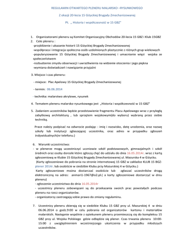 REGULAMIN OTWARTEGO PLENERU MALARSKO –RYSUNKOWEGO Z okazji 20-lecia 15 Giżyckiej Brygady Zmechanizowanej Pt. „ Historia i współczesność w 15 GBZ” 1. Organizatorami pleneru są Komitet Organizacyjny Obchodów 20-lecia 15 GBZ i Klub 15GBZ 2. Cele pleneru : -przybliżenie i ukazanie historii 15 Giżyckiej Brygady Zmechanizowanej -współpraca i integracja społeczna osób uzdolnionych plastycznie z różnych grup wiekowych -popularyzowanie 15 Giżyckiej Brygady Zmechanizowanej i umacnianie więzi wojska ze społeczeństwem -rozbudzenie zmysłu obserwacji i uwrażliwienia na widzenie otoczenia i jego piękna -wymiana doświadczeń i nawiązanie przyjaźni 3. Miejsce i czas pleneru: - miejsce: Plac Apelowy 15 Giżyckiej Brygady Zmechanizowanej - termin: 06.06.2014 - technika: malarstwo akrylowe, rysunek 4. Tematem pleneru malarsko-rysunkowego jest „Historia i współczesność w 15 GBZ” 5. Zadaniem uczestników będzie przedstawienie fragmentu Placu Apelowego wraz z przyległą zabytkową architekturą , lub sprzętem wojskowym(do wyboru) wybraną przez siebie techniką. Prace należy podpisać na odwrocie podając : imię i nazwisko, datę urodzenia, oraz nazwę szkoły lub instytucji zgłaszającej uczestnika, oraz adres w przypadku zgłoszeń indywidualnych(nr telefonu.) 6. Warunki uczestnictwa: - w plenerze mogą uczestniczyć uczniowie szkół podstawowych, gimnazjalnych i szkół średnich oraz osoby dorosłe które zgłoszą chęć do udziału do dnia 16.05.2014r. wraz z kartą zgłoszeniową w Klubie 15 Giżyckiej Brygady Zmechanizowanej ul. Mazurska 4 w Giżycku. (Karty zgłoszeniowe do pobrania na stronie internetowej 15 GBZ w zakładce KLUB 15 BGZplener 2014r. lub osobiście w siedzibie Klubu przy Mazurskiej 4 w Giżycku.) Karty zgłoszeniowe można dostarczać osobiście lub zgłaszać uczestników drogą elektroniczną na adres: [email protected].( a karty zgłoszeniowe dostarczyć w dniu pleneru) - zgłoszenie uczestnictwa do dnia 16.05.2014r - uczestnicy pleneru zobowiązani są do przekazania swoich prac powstałych podczas pleneru na rzecz organizatorów. - organizatorzy zastrzegają sobie prawo do zmiany regulaminu. 7. Uczestnicy pleneru zbierają się w siedzibie Klubu 15 GBZ przy ul. Mazurskiej 4 w dniu 06.06.2014 o godz.9:00 w celu pobrania od organizatorów kartonu i materiałów malarskich. Następnie wspólnie z opiekunem pleneru przemieszczą się do kompleksu 15 GBZ przy ul. Wojska Polskiego gdzie odbędzie się plener. Czas trwania pleneru 10:0015:00 z uwzględnieniem wcześniejszego ukończenia w przypadku młodszych uczestników. 8. Pozostałe warunki: - wszyscy uczestnicy pleneru otrzymają pamiątkowe dyplomy uczestnictwa - 3 najpiękniejsze prace plenerowe zostaną nagrodzone nagrodami rzeczowym -oceny prac dokona powołana przez organizatorów komisja , która oceni prace w kategoriach grup wiekowych, biorąc pod uwagę wykonanie, ogólny wyraz plastyczny prac, nie stosując podziału na technikę. - wykonane prace plastyczne zostaną wystawione i wyeksponowane podczas wystawy zorganizowanej w trakcie obchodów 20-lecia 15 Giżyckiej Brygady Zmechanizowanej na terenie miasta Giżycko. - wykonane w trakcie pleneru prace plastyczne stanowić będą własność organizatorów i nie będą zwracane uczestnikom. - organizatorzy zastrzegają sobie prawo do nieodpłatnego przeniesienia praw autorskich do prac plastycznych uczestników oraz do wykorzystania ich na wszystkich polach eksploatacji jak również do reprodukowania i publikowania prac według uznania organizatorów. - uczestnicy pleneru winni posiadać aktualne ubezpieczenie, organizator nie ponosi żadnej odpowiedzialności za wypadki i zdarzenia losowe w trakcie trwania pleneru. - organizator nie ponosi odpowiedzialności z tytułu utraty, zniszczenia albo uszkodzenia mienia uczestników pleneru. W przypadku niesprzyjających warunków atmosferycznych organizator zastrzega sobie prawo zmiany terminu pleneru na inny.
