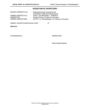 URZĄD GMINY W CZARNYM DUNAJCU 34-470 Czarny Dunajec ul. Piłsudskiego 2 KOSZTORYS OFERTOWY NAZWA INWESTYCJI : ADRES INWESTYCJI INWESTOR ADRES INWESTORA : : : Zabezpieczenie drogi gminnej budowlami siatkowo-kamiennymi Ciche " Do Macioska " K360010 Urząd Gminy w Czarnym Dunajcu 34-470 ul. Piłsudskiego 2 w Czarnym Dunajcu Ogółem wartość kosztorysowa robót : zł Słownie: WYKONAWCA : INWESTOR : Data zatwierdzenia Dokument został opracowany przy pomocy programu NORMA PRO KSIĄŻKA PRZEDMIARÓW Lp. Podstawa 1 1 KNNR 1 d.1 0111-02 2 2.1 2 KNNR 1 d.2. 0213-02 1 z.sz.2.2.4. 9909-04 Opis i wyliczenia D-01.00.00 Roboty przygotowawcze Roboty pomiarowe przy liniowych robotach ziemnych - trasa dróg w terenie pagórkowatym lub górskim. 0.07 j.m. km km m3 3 KNNR 1 Przemieszczanie spycharkami mas ziemnych kat. IV uprzednio m3 d.2. 0215-02 odspojonych na odl.do 10 m - grunty oblepiające gąsienice 1 z.sz.2.2.4. 9909-04 100 m3 5 KNNR 1 d.2. 0215-06 1 z.sz.2.2.4. 9909-04 2.2 6 KNNR 1 d.2. 0210-03 2 z.sz.2.1.1. 9906-04/ 02 Przemieszczanie spycharkami mas ziemnych kat. IV uprzednio m3 odspojonych - za każde rozp. 10 m przem.w zakresie pow. 10 do 30 m - grunty oblepiające gąsienice Krotność = 2 70 m3 Przemieszczanie spycharkami mas ziemnych kat. IV uprzednio m3 odspojonych - za każde rozp. 10 m przem.w zakresie pow. 30 do 60 m - grunty oblepiające gąsienice Krotność = 3 50 m3 m3 3 D-06.00.00 Roboty wykończeniowe 3.1 Narzut kamienny 7 KNNR 10 Wykonanie koszy z siatki stalowej bez wyprawy d.3. 0408-01 1 25*1.0*1.5+25*1.0*1.0*5 0.070 168.000 RAZEM 168.000 100.000 RAZEM 100.000 70.000 RAZEM 70.000 50.000 RAZEM 50.000 60.000 RAZEM 60.000 162.500 RAZEM 162.500 180.000 RAZEM 180.000 m3 m3 Wykonanie nasypu z pospółki rzecznej Roboty ziemne wykonywane koparkami podsiębiernymi o m3 poj.łyżki 0.60 m3 w gr.kat. III-IV z transp.urobku na odl.do 1 km sam.samowyład. 30*1.5*8.0*0.5 m3 -2- Norma PRO Wersja 4.16 0.070 RAZEM Wykopy fundamentowe po narzut kamienny Wykopy oraz przekopy o głęb.do 3.0 m wyk.na odkład koparka- m3 mi podsiębiernymi o poj.łyżki 0.25 - 0.60 m3 w gr.kat. III-IV praca w gruncie oblepiającym 30*2.0*1.0 3.2 8 KNNR 1 d.3. 0202-08 2 Razem D-02.00.00 Roboty ziemne Regulacja potoku Wykopy wykonywane spycharkami w gr.kat. IV - grunty oblepia- m3 jące gąsienice 70*4.0*0.6 4 KNNR 1 d.2. 0215-04 1 z.sz.2.2.4. 9909-04 Poszcz KOSZTORYS OFERTOWY Lp. Podstawa Opis Jedn.obm. 1 1 KNNR 1 d.1 0111-02 D-01.00.00 Roboty przygotowawcze Roboty pomiarowe przy liniowych robotach km ziemnych - trasa dróg w terenie pagórkowatym lub górskim. Razem dział: D-01.00.00 Roboty przygotowawcze 2 D-02.00.00 Roboty ziemne 2.1 Regulacja potoku 2 KNNR 1 Wykopy wykonywane spycharkami w gr.kat. m3 d.2. 0213-02 IV - grunty oblepiające gąsienice 1 z.sz.2.2.4. 9909-04 3 KNNR 1 Przemieszczanie spycharkami mas ziemnych m3 d.2. 0215-02 kat. IV uprzednio odspojonych na odl.do 10 m 1 z.sz.2.2.4. - grunty oblepiające gąsienice 9909-04 4 KNNR 1 Przemieszczanie spycharkami mas ziemnych m3 d.2. 0215-04 kat. IV uprzednio odspojonych - za każde 1 z.sz.2.2.4. rozp. 10 m przem.w zakresie pow. 10 do 30 m - grunty oblepiające gąsienice 9909-04 Krotność = 2 5 KNNR 1 Przemieszczanie spycharkami mas ziemnych m3 d.2. 0215-06 kat. IV uprzednio odspojonych - za każde 1 z.sz.2.2.4. rozp. 10 m przem.w zakresie pow. 30 do 60 m - grunty oblepiające gąsienice 9909-04 Krotność = 3 2.2 Wykopy fundamentowe po narzut kamienny 6 KNNR 1 Wykopy oraz przekopy o głęb.do 3.0 m m3 d.2. 0210-03 wyk.na odkład koparkami podsiębiernymi o 2 z.sz.2.1.1. poj.łyżki 0.25 - 0.60 m3 w gr.kat. III-IV - praca 9906-04/02 w gruncie oblepiającym Razem dział: D-02.00.00 Roboty ziemne 3 D-06.00.00 Roboty wykończeniowe 3.1 Narzut kamienny 7 KNNR 10 Wykonanie koszy z siatki stalowej bez wypra- m3 d.3. 0408-01 wy 1 3.2 8 KNNR 1 d.3. 0202-08 2 Wykonanie nasypu z pospółki rzecznej Roboty ziemne wykonywane koparkami pod- m3 siębiernymi o poj.łyżki 0.60 m3 w gr.kat. III-IV z transp.urobku na odl.do 1 km sam.samowyład. Razem dział: D-06.00.00 Roboty wykończeniowe Wartość kosztorysowa robót bez podatku VAT Podatek VAT Ogółem wartość kosztorysowa robót Słownie: -3- Norma PRO Wersja 4.16 Ilość 0.07 70*4.0*0.6 = 168.000 100 70 50 30*2.0*1.0 = 60.000 25*1.0* 1.5+25* 1.0*1.0*5 = 162.500 30*1.5* 8.0*0.5 = 180.000 Cena jedn. Wartość