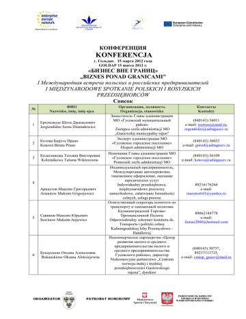 КОНФЕРЕНЦИЯ KONFERENCJA г. Гольдап 15 марта 2012 года GOŁDAP 15 marca 2012 r. «БИЗНЕС ВНЕ ГРАНИЦ» „BIZNES PONAD GRANICAMI” I Международная встреча польских и российских предпринимателей I MIĘDZYNARODOWE SPOTKANIE POLSKICH I ROSYJSKICH PRZEDSIĘBIORCÓW Список № ФИО Nazwisko, imię, imię ojca 1 Ергемлидзе Шота Джамалович Jergiemlidze Szota Dżamałowicz 2 Котова Бирута Прано Kotowa Biruta Prano 3 Колесникова Татьяна Викторовна Koleśnikowa Tatiana Wiktorowna 4 Арнаутов Максим Григорьевич Arnautow Maksim Grigorjewicz 5 Савинов Максим Юрьевич Sawinow Maksim Jurjewicz 6 Букаускене Оксана Алексеевна Bukauskiene Oksana Aleksiejewna Организация, должность Organizacja, stanowisko Заместитель Главы администрации МО «Гусевский муниципальный район» Zastępca szefa administracji MO „Gusiewskij municypalny rajon” Эксперт администрации МО «Гусевское городское поселение» Ekspert administracji MO Помощник Главы администрации МО «Гусевское городское поселение» Pomocnik szefa administracji MO Индивидуальный предприниматель, Международные автоперевозки, таможенное оформление, оказание юридических услуг Indywidualny przedsiębiorca, międzynarodowe przewozy samochodowe, załatwianie formalności celnych, usługi prawne Ответственный секретарь комитета по транспорту и таможенной политике Калининградской ТорговоПромышленной Палаты Odpowiedzialny sekretarz komitetu ds. Transportu i polityki celnej Kaliningradzkiej Izby Przemysłowo Handlowej Некоммерческое партнерство «Центр развития малого и среднего предпринимательства малого и среднего предпринимательства Гусевского района», директор Niekomercyjne partnerstwo „Centrum rozwoju małej i średniej przedsiębiorczości Gusiewskiego rajona”, dyrektor Контакты Kontakty (840143) 36011 e-mail: [email protected], [email protected] (840143) 36052 e-mail: [email protected] (840143) 36109 e-mail: [email protected] 89216176266 e-mail: [email protected] 89062184778 e-mail: [email protected] (840143) 30757, 89217113725, e-mail: [email protected] 7 Перепон Юлия Игоревна Pierepon Julia Igoriewna 8 Елефтериади Дмитрий Ильич Jeleftieriadi Dmitrij Ilicz 9 10 Думов Михаил Николаевич Dumow Michaił Nikołajewicz Курилович Екатерина Николаевна Kuriłowicz Jekatierina Nikołajewna 11 Покотило Кирилл Игоревич Pokotiło Kiriłł Igoriewicz 12 Збиняков Александр Сергеевич Zbiniakow Aleksandr Siergiejewicz 13 Бутырская Ольга Владимировна Butyrskaja Olga Władimirowna 14 Кондаков Денис Андреевич Kondakow Dienis Andriejewicz Индивидуальный предприниматель, Гостиничный бизнес Indywidualny przedsiębiorca, Biznes hotelowy Индивидуальный предприниматель, Международные автоперевозки, таможенное оформление, оказание юридических услуг ГК «ИЛЛИОН» Indywidualny przedsiębiorca, Międzynarodowe przewozy samochodowe, załatwianie formalności celnych, usługi prawne GK „ ILLION” индивидуальный предприниматель, программное обеспечение, реализация и обслуживание компьютерной техники, создание интернет-сайтов Indywidualny przedsiębiorca, oprogramowanie, realizacja i obsługa techniki komputerowej, tworzenie stron internetowych ГБОУ СПО КО «Гусевский политехнический техникум», директор GBOU SPO KO «Gusiewskie politechniczne technikum”, dyrektor Государственное автономное учреждение Калининградской области «Фонд поддержки предпринимательства» Экономист Państwowy urząd autonomiczny Kaliningradskiej obłasti „ Fundusz wspierania przedsiębiorczości”, ekonomista Производство и реализация корпусной мебели, Генеральный директор Produkcja i realizacja mebli skrzyniowych, Dyrektor generalny Производство и реализация корпусной мебели Магазин «Мир мебели», управляющая Produkcja i realizacja mebli skrzyniowych, Sklep „Mir miebieli”, kierowniczka Заместитель генерального директора ООО «ДЕЗ АВТО» Мойка грузового автомобильного транспорта Zastępca dyrektora generalnego OOO „DEZ AWTO” , Myjnia samochodów ciężarowych 89211020424 89062157668,84014135686 e-mail: [email protected] www.gcillion.ru 89114559930 e-mail: [email protected] 89212645992 e-mail : [email protected] 89114514444 e-mail: [email protected] 89212657014 e-mail: [email protected] 89217118921 e-mail: [email protected] 89118681946 e-mail: [email protected] 15 Валенко Даниил Владимирович Walienko Daniił Władimirowicz 16 Моторова Юлия Андреевна Motorowa Julia Andriejewna 17 Светлейцих Игорь 