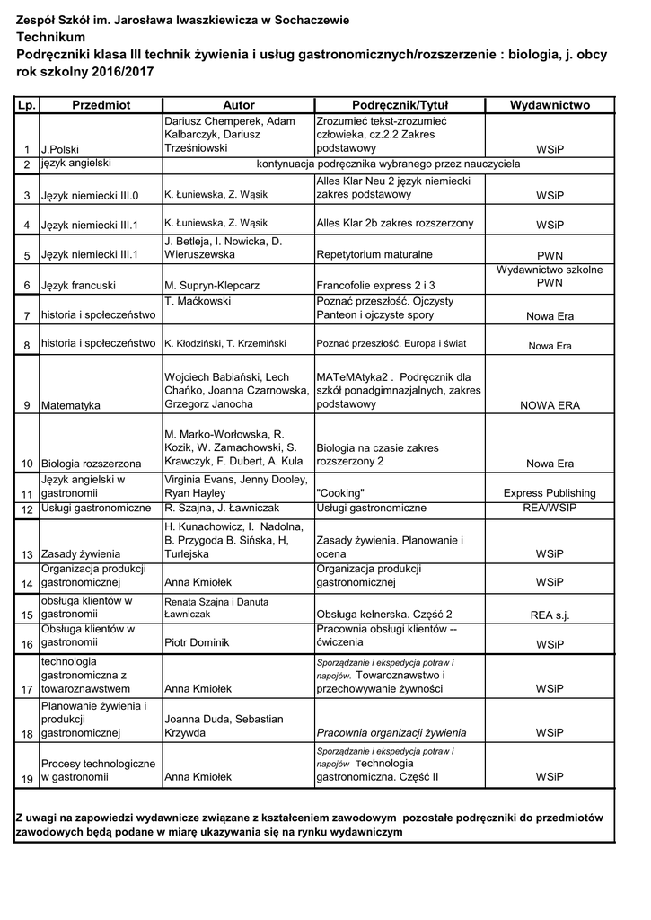 Lista podręczników 2016 - klasa3 technik żywienia i usług