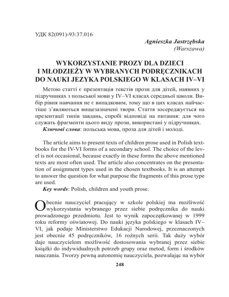 УДК 82(091)-93:37.016 Agnieszka Jastrzębska (Warszawa) WYKORZYSTANIE PROZY DLA DZIECI I MŁODZIEŻY W WYBRANYCH PODRĘCZNIKACH DO NAUKI JEZYKA POLSKIEGO W KLASACH IV–VI Метою статті є презентація текстів прози для дітей, наявних у підручниках з польської мови у IV–VI класах середньої школи. Вибір рівня навчання не є випадковим, тому що в цих класах найчастіше з’являються вищезазначені твори. Стаття зосереджується на презентації типів завдань, спробі відповіді на питання: для чого служать фрагменти цього виду прози, використані у підручниках. Ключові слова: польська мова, проза для дітей і молоді. The article aims to present texts of children prose used in Polish textbooks for the IV-VI forms of a secondary school. The choice of the level is not occasional, because exactly in these forms the above mentioned texts are most often used. The article also concentrates on the presentation of assignment types used in the chosen textbooks. It is an attempt to answer the question for what purpose the fragments of this prose type are used. Key words: Polish, children and youth prose. O becnie nauczyciel pracujący w szkole polskiej ma możliwość wykorzystania wybranego przez siebie podręcznika do nauki prowadzonego przedmiotu. Jest to wynik zapoczątkowanej w 1999 roku reformy oświatowej. Do nauki języka polskiego w klasach IV– VI, jak podaje Ministerstwo Edukacji Narodowej, przeznaczonych jest obecnie 45 podręczników, 16 rożnych serii. Tak duży wybór daje nauczycielom możliwość dostosowania wybranej przez siebie książki do indywidualnych potrzeb grupy oraz metod, form i środków nauczania. Tworzy pewną autonomię nauczyciela, pozwalając na wybór 248 programu i podręcznika do nauki, jednocześnie zwiększając przy tym odpowiedzialność za efekty nauczania. Celem niniejszego artykułu jest zaprezentowanie tekstów prozy dla dzieci, występujących w podręcznikach do nauki języka polskiego w klasach IV–VI szkoły podstawowej. Należy jednak podkreślić, że w podręcznikach oprócz prozy dla dzieci występują również inne utwory, min.: fragmenty literatury klasycznej, poezja, rzadziej artykuły z gazet młodzieżowych, legendy, baśnie, fragmenty dramatów, komiksy, teksty piosenek, teksty z internetu, reklamy, instrukcje, audycje radiowe. Są, to teksty zarówno literatury polskiej, jak i światowej. W artykule skupiono się również na zaprezentowaniu typów zadań występujących w wybranych podręcznikach. Jest to próba odpowiedzi na pytanie czemu służą zawarte w książce fragmenty tego rodzaju prozy. Prezentowane ćwiczenia podzielono, biorąc pod uwagę rozwój kolejnych kompetencji jezykowych, nie zaś poziom zaawansowania i podział na klasy. Analizie zostały poddane trzy serie podręczników: Słowa na start. Podręcznik do kształcenia literackiego i kulturowego dla klasy czwartej /piątej /szóstej szkoły podstawowej Marleny Derlukiewicz; Między nami. Podręcznik dla klasy czwartej /piątej / szóstej szkoły podstawowej Agnieszki Łuczak i Anny Murdzek; Jutro pójdę w świat. Podręcznik do kształcenia literackiego, kulturowego i językowego dla klasy czwartej / szóstej szkoły podstawowej Hanny Dobrowolskiej, Jutro pójdę w świat. Podręcznik do kształcenia literackiego, kulturowego i językowego dla klasy piątej szkoły podstawowej Hanny Dobrowolskiej i Urszuli Dobrowolskiej. Wybór poziomu nauczania nie jest przypadkowy, ponieważ w tych klasach najczęściej w podręcznikach pojawiają się interesujące autora teksty, warto, bowiem zauważyć, że ilość prozy dla dzieci i młodzieży zmniejsza się kosztem innych tekstów wraz z przejściem do wyższej klasy, a pod koniec gimnazjum praktycznie zostaje przez nie wyparta. Jakimi kryteriami kierują się autorzy podręczników wybierający teksty literatury dla dzieci i młodzieży do swoich podręczników? Zależy to oczywiście od typu i układu podręcznika. Jednakże w dużej mierze jest wynikiem spisu lektur szkolnych zaproponowanych przez Ministerstwo Edukacji Narodowej dla klas IV–VI. W Podstawie programowej czytamy, ze uczeń klas IV–VI powinien przeczytać w roku szkolnym w całości – 249 nie mniej niż 4 pozycje książkowe oraz wybrane przez nauczyciela teksty o mniejszej objętości: Jan Brzechwa Akademia Pana Kleksa; Carlo Collodi Pinokio; Antonina Domańska Historia żółtej ciżemki; Irena Jurgielewiczowa Ten obcy; Stanisław Lem Bajki robotów; Clive Staples Lewis Lew, Czarownica i stara szafa; Kornel Makuszyński Szatan z siódmej klasy; Aleksander Minkowski Dolina Światła; Ferenc Molnár Chłopcy Placu Broni; Lucy Maud Montgomery Ania z Zielonego Wzgórza; Edmund Niziurski – wybrana powieść (np. Niewiarygodne przygody Marka Piegusa, Sposób na Alcybiadesa); Joanna Onichimowska – wybrana powieść (np. Duch starej kamienicy, Daleki rejs); René Gościnny, Jean-Jacques Sempé Mikołajek (wybór opowiadań z dowolnego tomu); Henryk Sienkiewicz W pustyni i w puszczy; Alfred Szklarski – wybrana powieść (np. Tomek w krainie kangurów); Dorota Terakowska Władca Lewawu i inne; wybór mitów greckich, baśni i legend; wybór kolęd; wybór pieśni patriotycznych; wybór poezji, w tym utwory dla dzieci i młodzieży; film i widowisko teatralne z repertuaru dziecięcego; wybrane programy telewizyjne [12, 24]. Analizując podręczniki do nauki języka polskiego zauważymy, że we wszystkich pojawiają się fragmenty wymienionych powyżej lektur szkolnych i praktycznie tylko na nich bazują. W artykule skupimy się jednak wyłącznie na prozie dla dzieci i młodzieży. Odrębna literatura dla dzieci i m