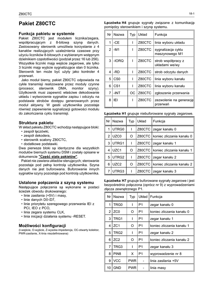 18-1 Z80CTC Pakiet Z80CTC Funkcja pakietu w systemie Pakiet Z80CTC jest modułem licznika/zegara, współpracuja˛cym z 8-bitowa˛ szyna˛ danych. Zastosowany sterownik umożliwia korzystanie z 4 kanałów realizuja˛cych uzależnienia czasowe przy użyciu liczników 8-bitowych z wybieranym wste˛pnym dzielnikiem cze˛stotliwości (podział przez 16 lub 256). Wszystkie liczniki maja˛ wejście zegarowe, ale tylko 3 liczniki maja˛ wyjście sygnalizuja˛ce stan 0 licznika. Sterownik ten może być użyty jako kontroler 4 przerwań. Jako moduł bierny, pakiet Z80CTC odpowiada na cykle transmisji realizowane przez moduły czynne (procesor, sterownik DMA, monitor szyny). Użytkownik musi zapewnić właściwe dekodowanie układu i wytworzenie sygnałów zapisu i odczytu na podstawie strobów doste˛pu generowanych przez moduł aktywny. W gestii użytkownika pozostaje również zapewnienie sygnalizacji gotowości modułu do zakończenia cyklu transmisji. Struktura pakietu W skład pakietu Z80CTC wchodza˛ naste˛puja˛ce bloki: • zespół ła˛czówki, • zespół dekodera, • sterownik scalony Z80CTC, • dodatkowe podstawki. Dwa pierwsze bloki sa˛ identyczne dla wszystkich modułów biernych systemu DSM i zostały opisane w dokumencie "Cze˛ść stała pakietów". Pakiet nie zawiera układów steruja˛cych; sterowanie pozostaje pod pełna˛ kontrola˛ użytkownika. Szyna danych nie jest buforowana. Buforowanie innych sygnałów szyny pozostaje pod kontrola˛ użytkownika. Ustalone poła˛czenia z szyna˛ systemu Naste˛puja˛ce poła˛czenia sa˛ wykonane w postaci ścieżek obwodu drukowanego: • linie zasilania (+5V) i masy, • linie danych D0÷D7, • linie priorytetu szeregowego przerwania IEI z PCI, IEO z PCO, • linia zegara systemu CLK, • linia inicjacji działania systemu -RESET. Ła˛czówka H4 grupuje sygnały zwia˛zane z komunikacja˛ pomie˛dzy sterownikiem i szyna˛ systemu. Nr Nazwa Typ Układ Funkcja 1 -CE I Z80CTC linia wyboru układu 2 -M1 I Z80CTC sygnalizacja cyklu maszynowego M1 3 -IORQ I Z80CTC strob współpracy z układami we/wy 4 -RD I Z80CTC strob odczytu danych 5 CS0 I Z80CTC linia wyboru kanału 6 CS1 I Z80CTC linia wyboru kanału 7 -INT OC Z80CTC 8 IEI I Z80CTC zgłoszenie przerwania zezwolenie na generacje˛ przerwań Ła˛czówka H1 grupuje niebuforowane sygnały zegarowe. Nr Nazwa Typ Układ Funkcja 1 UTRG0 I Z80CTC zegar kanału 0 2 UZC0 O Z80CTC koniec zliczania kanału 0 3 UTRG1 I Z80CTC zegar kanału 1 4 UZC1 O Z80CTC koniec zliczania kanału 1 5 UTRG2 I Z80CTC zegar kanału 2 6 UZC2 O Z80CTC koniec zliczania kanału 2 7 UTRG3 I Z80CTC zegar kanału 3 Ła˛czówka H7 grupuje buforowane sygnały zegarowe i jest bezpośrednio poła˛czona (oprócz nr 9) z wyprowadzeniami zła˛cza zewne˛trznego P1. Nr Nazwa Typ Układ Funkcja 1 TRG0 I P1 zegar kanału 0 2 ZC0 O P1 koniec zliczania kanału 0 3 TRG1 I P1 zegar kanału 1 Możliwości konfiguracji 4 ZC1 O P1 koniec zliczania kanału 1 (I-wejście, O-wyjście, Z-wysoka impedancja, OC-otwarty kolektor, PWR-zasilanie, X-linia niezdefiniowana) 5 TRG2 I P1 zegar kanału 2 6 ZC2 O P1 koniec zliczania kanału 2 7 TRG3 I P1 zegar kanału 3 8 PIN8 X P1 wyprowadzenie nr 8 9 VCC PWR - linia zasilania +5V 10 GND PWR - linia masy 18-2 Pozostałe ła˛ czówki wchodza˛ w skład cze˛ ści stałej pakietu. Dodatkowo na pakiecie sa˛ zainstalowane 2 podstawki DIL20 (U9, U10) z podła˛ czonym zasilaniem i masa˛ . Wszystkie wyprowadzenia podstawek sa˛ zaopatrzone w gniazda do prowadzenia poła˛ czeń. Podstawki te moga˛ być wykorzystane do budowy układów steruja˛ cych lub buforuja˛ cych. W typowej konfiguracji (bez buforowania sygnałów doprowadzonych do zła˛ cza zewne˛ trznego) wyprowadzenia 1÷7 ła˛ czówki H1 powinny być poła˛ czone z odpowiadaja˛ cymi im wyprowadzeniami ła˛ czówki H7. Zła˛ cza zewne˛ trzne Na zewna˛ trz pakietu jest doste˛ pne gniazdo szufladowe ELTRA-9 (typ 88100901). Zła˛ cze jest doła˛ czone Rys. 18-1. Rozłożenie elementów na module DSM Z80CTC. DSM bezpośrednio do ła˛ czówki H7. Rozmieszczenie linii sygnałowych jest przedstawione w tabeli. Nazwa Nr Nr Nazwa TRG0 1 6 ZC2 ZC0 2 7 TRG3 TRG1 3 8 PIN8 ZC1 4 9 GND TRG2 5 zła˛ cze P1 Z80CTC Rys. 18-2. Schemat ideowy modułu DSM Z80CTC. a3 a4 a5 a6 a7 a8 a9 a10 H4 PCO PCI 1 2 3 4 5 6 7 8 a29 c28 c27 c29 D0 D1 D2 D3 D4 D5 D6 D7 25 26 27 28 1 2 3 4 U8 D0 D1 D2 D3 D4 D5 D6 D7 -CE -M1 -IORQ -RD CS0 CS1 -INT IEI 16 14 10 6 18 19 CE M1 IORQ RD CS0 CS1 IEO -RESET CLK H2 1 2 3 4 5 6 7 8 9 10 C1 C2 C3 47n 47n 47n VCC GND 12 13 11 17 15 H5 1 2 3 4 5 6 7 8 9 10 GND GND CLK/TRG0 ZC/TO0 23 7 CLK/TRG1 ZC/TO1 22 8 CLK/TRG2 ZC/TO2 21 9 CLK/TRG3 20 UTRG0 UZC0 UTRG1 UZC1 UTRG2 UZC2 UTRG3 U10 1 20 2 19 3 18 4 17 5 16 6 15 7 14 8 13 9 12 10 11 DIL20 H7 1 2 3 4 5 6 7 8 9 10 VCC VCC TRG0 ZC0 TRG1 ZC1 TRG2 ZC2 TRG3 PIN8 VCC GND P1 TRG0 ZC2 ZC0 TRG3 TRG1 PIN8 ZC1 GND TRG2 INT IEI IEO RESET CLK Z80-CTC U9 1 20 2 19 3 18 4 17 5 16 6 15 7 14 8 13 9 12 10 11 DIL20 H1 1 2 3 4 5 6 7 88100901 Eltra (gniazdo 9) H3 1 2 3 4 5 6 7 8 9 10 H6 1 2 3 4 5 6 7 8 9 10 1 6 2 7 3 8 4 9 5 Instytut Informatyki PW | spr. H.Jez Title REV 2.0 1 18-3 Programowany uklad czasowy Size Document Number A DSM / Z80CTC.SCH Date: June 29, 1999 Sheet 1 of