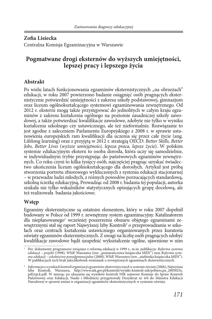 Zastosowania diagnozy edukacyjnej Zofia Lisiecka Centralna Komisja Egzaminacyjna w Warszawie Pogmatwane drogi eksternów do wyższych umiejętności, lepszej pracy i lepszego życia Abstrakt Po wielu latach funkcjonowania egzaminów eksternistycznych „na obrzeżach” edukacji, w roku 2007 powierzono badanie osiągnięć osób pragnących eksternistycznie potwierdzić umiejętności z zakresu szkoły podstawowej, gimnazjum oraz liceum ogólnokształcącego systemowi egzaminowania zewnętrznego. Od 2012 r. eksterni mogą także przystępować do jednolitych w całym kraju egzaminów z zakresu kształcenia ogólnego na poziomie zasadniczej szkoły zawodowej, a także potwierdzać kwalifikacje zawodowe, zdobyte nie tylko w wyniku kształcenia szkolnego czy ustawicznego, ale też nieformalnie. Rozwiązanie to jest zgodne z zaleceniem Parlamentu Europejskiego z 2008 r. w sprawie ustanowienia europejskich ram kwalifikacji dla uczenia się przez całe życie (ang. Lifelong learning) oraz z przyjętą w 2012 r. strategią OECD: Better Skills, Better Jobs, Better Lives (wyższe umiejętności, lepsza praca, lepsze życie). W polskim systemie edukacyjnym ekstern to osoba dorosła, która uczy się samodzielnie, w indywidualnym trybie przystępując do państwowych egzaminów zewnętrznych. Co roku czyni to kilka tysięcy osób, najczęściej pragnąc uzyskać świadectwo ukończenia liceum ogólnokształcącego dla dorosłych. Artykuł jest próbą stworzenia portretu zbiorowego wykluczonych z systemu edukacji stacjonarnej – w przewadze ludzi młodych, z różnych powodów porzucających standardową, szkolną ścieżkę edukacyjną, Prowadząc od 2008 r. badania tej populacji, autorka szukała nie tylko wskaźników statystycznych opisujących grupę docelową, ale też realizowała badania jakościowe. Wstęp Egzaminy eksternistyczne są ostatnim elementem, który w roku 2007 dopełnił budowany w Polsce od 1999 r. zewnętrzny system egzaminacyjny. Katalizatorem dla nieplanowanego1 wcześniej poszerzenia obszaru objętego egzaminami zewnętrznymi stał się raport Najwyższej Izby Kontroli2 o przeprowadzaniu w szkołach oraz centrach kształcenia ustawicznego organizowanych przez kuratoria oświaty egzaminów eksternistycznych. Z uwagi na liczbę osób pragnących zdobyć kwalifikacje zawodowe bądź uzupełnić wykształcenie ogólne, ujawnione w nim Por. dokumenty programowe związane z reformą edukacji w 1999 r., m.in. publikacje: Reforma systemu edukacji – projekt (1998), WSiP, Warszawa (tzw. „pomarańczowa książeczka MEN”) oraz Reforma systemu edukacji – szkolnictwo ponadgimnazjalne (2000), WSiP, Warszawa (tzw. „niebieska książeczka MEN”). W publikacjach tych brak jakichkolwiek wzmianek o zewnętrznych egzaminach eksternistycznych. 1 Informacja o wynikach kontroli organizacji egzaminów eksternistycznych w systemie oświaty (2006), Najwyższa Izba Kontroli, Warszawa, http://www.nik.gov.pl/kontrole/wyniki-kontroli-nik/pobierz,px_2005025x. pdf,typ.k.pdf. W miesiąc po ukazaniu się wyników kontroli NIK sejmowe Komisje do Spraw Kontroli Państwowej oraz Edukacji, Nauki i Młodzieży przygotowały Dezyderat nr 4/6 do Ministra Edukacji Narodowej w sprawie zmian w organizacji egzaminów eksternistycznych w systemie oświaty. 2 171 XXI Konferencja Diagnostyki Edukacyjnej, Bydgoszcz 2015 nieprawidłowości, niektóre o charakterze korupcyjnym, a nawet przestępczym, stanowiły wówczas problem o dużym znaczeniu społecznym i gospodarczym. W analizowanym ���������������������������������������������������������������������� przez NIK okresie (lata 2002-2004) do egzaminów eksternistycznych przystąpiło bowiem łącznie ponad 300 tys. osób. W tym samym czasie powszechna stała się opinia, iż zdanie egzaminu w trybie eksternistycznym w większym stopniu zależy od przychylności szkolnej komisji niż od umiejętności zdającego. Może o tym świadczyć zarówno odsetek osób, które na egzaminach uzyskiwały oceny pozytywne (najwyższy wskaźnik procentowy, tj. 98,1%, odnotowano w szkołach policealnych, najniższy w szkołach podstawowych – 75%3), jak i nagminna praktyka organizowania w placówkach, które egzaminy przeprowadzały, kursów przygotowujących do tych egzaminów, z zajęciami realizowanymi przez późniejszych egzaminatorów. Tym samym eksternistyczny sposób zdawania egzaminów w owym czasie z jednej strony stał się praktyką masową, bo łatwo dostępną, z drugiej zaś deprecjonował osiągnięte ��������������������������������� przez zdających rezultaty, w opinii społecznej skażone nagannymi, a nawet nielegalnymi praktykami egzaminatorów i egzaminowanych, takimi jak kupowanie przychylności komisji, ujawnianie pytań egzaminacyjnych, stwarzanie pozorowanej sytuacji egzaminacyjnej, ściąganie itp. Wprowadzone w roku 2007 unormowania prawne nakazały badanie osiągnięć osób pragnących potwierdzić wykształcenie ogólne w zakresie szkoły podstawowej, gimnazjum oraz liceum ogólnokształcącego dla dorosłych przez system egzaminowania zewnętrznego4. Od 2012 r. eksterni mogą także przystępować do identycznych����������������������������������������������������������������� w całym kraju �������������������������������������������������� egzaminów z zakresu kształcenia ogólnego na poziomie zasadniczej szkoły zawodowej, a także potwierdzać kwalifikacje zawodowe, zdobyte nie tylko w wyniku kształcenia szkolnego czy ustawicznego, ale też nieformalnie5. Rozwiązanie to jest zgodne ze strategicznymi celami U