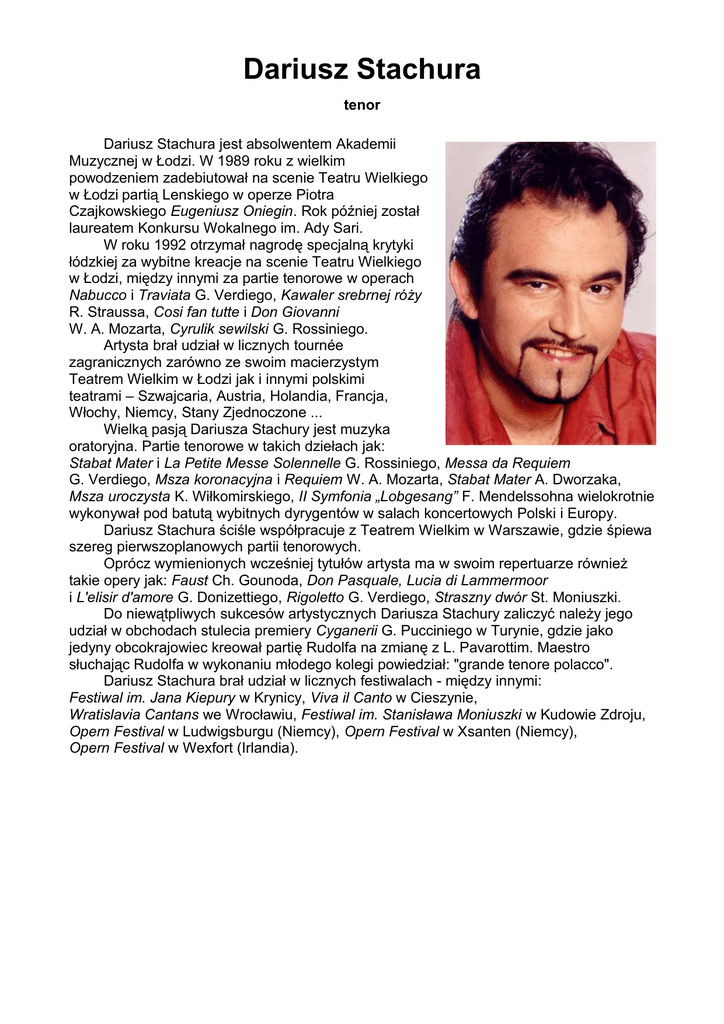 Dariusz Stachura tenor Dariusz Stachura jest absolwentem Akademii Muzycznej w Łodzi. W 1989 roku z wielkim powodzeniem zadebiutował na scenie Teatru Wielkiego w Łodzi partią Lenskiego w operze Piotra Czajkowskiego Eugeniusz Oniegin. Rok później został laureatem Konkursu Wokalnego im. Ady Sari. W roku 1992 otrzymał nagrodę specjalną krytyki łódzkiej za wybitne kreacje na scenie Teatru Wielkiego w Łodzi, między innymi za partie tenorowe w operach Nabucco i Traviata G. Verdiego, Kawaler srebrnej róży R. Straussa, Cosi fan tutte i Don Giovanni W. A. Mozarta, Cyrulik sewilski G. Rossiniego. Artysta brał udział w licznych tournée zagranicznych zarówno ze swoim macierzystym Teatrem Wielkim w Łodzi jak i innymi polskimi teatrami – Szwajcaria, Austria, Holandia, Francja, Włochy, Niemcy, Stany Zjednoczone ... Wielką pasją Dariusza Stachury jest muzyka oratoryjna. Partie tenorowe w takich dziełach jak: Stabat Mater i La Petite Messe Solennelle G. Rossiniego, Messa da Requiem G. Verdiego, Msza koronacyjna i Requiem W. A. Mozarta, Stabat Mater A. Dworzaka, Msza uroczysta K. Wiłkomirskiego, II Symfonia „Lobgesang” F. Mendelssohna wielokrotnie wykonywał pod batutą wybitnych dyrygentów w salach koncertowych Polski i Europy. Dariusz Stachura ściśle współpracuje z Teatrem Wielkim w Warszawie, gdzie śpiewa szereg pierwszoplanowych partii tenorowych. Oprócz wymienionych wcześniej tytułów artysta ma w swoim repertuarze również takie opery jak: Faust Ch. Gounoda, Don Pasquale, Lucia di Lammermoor i L'elisir d'amore G. Donizettiego, Rigoletto G. Verdiego, Straszny dwór St. Moniuszki. Do niewątpliwych sukcesów artystycznych Dariusza Stachury zaliczyć należy jego udział w obchodach stulecia premiery Cyganerii G. Pucciniego w Turynie, gdzie jako jedyny obcokrajowiec kreował partię Rudolfa na zmianę z L. Pavarottim. Maestro słuchając Rudolfa w wykonaniu młodego kolegi powiedział: "grande tenore polacco". Dariusz Stachura brał udział w licznych festiwalach - między innymi: Festiwal im. Jana Kiepury w Krynicy, Viva il Canto w Cieszynie, Wratislavia Cantans we Wrocławiu, Festiwal im. Stanisława Moniuszki w Kudowie Zdroju, Opern Festival w Ludwigsburgu (Niemcy), Opern Festival w Xsanten (Niemcy), Opern Festival w Wexfort (Irlandia).