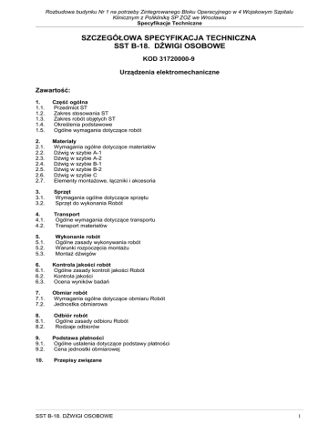 Rozbudowa budynku Nr 1 na potrzeby Zintegrowanego Bloku Operacyjnego w 4 Wojskowym Szpitalu Klinicznym z Polikliniką SP ZOZ we Wrocławiu Specyfikacje Techniczne SZCZEGÓŁOWA SPECYFIKACJA TECHNICZNA SST B-18. DŹWIGI OSOBOWE KOD 31720000-9 Urządzenia elektromechaniczne Zawartość: 1. 1.1. 1.2. 1.3. 1.4. 1.5. Część ogólna Przedmiot ST Zakres stosowania ST Zakres robót objętych ST Określenia podstawowe Ogólne wymagania dotyczące robót 2. 2.1. 2.2. 2.3. 2.4. 2.5. 2.6. 2.7. Materiały Wymagania ogólne dotyczące materiałów Dźwig w szybie A-1 Dźwig w szybie A-2 Dźwig w szybie B-1 Dźwig w szybie B-2 Dźwig w szybie C Elementy montażowe, łączniki i akcesoria 3. 3.1. 3.2. Sprzęt Wymagania ogólne dotyczące sprzętu Sprzęt do wykonania Robót 4. 4.1. 4.2. Transport Ogólne wymagania dotyczące transportu Transport materiałów 5. 5.1. 5.2. 5.3. Wykonanie robót Ogólne zasady wykonywania robót Warunki rozpoczęcia montażu Montaż dźwigów 6. 6.1. 6.2. 6.3. Kontrola jakości robót Ogólne zasady kontroli jakości Robót Kontrola jakości Ocena wyników badań 7. 7.1. 7.2. Obmiar robót Wymagania ogólne dotyczące obmiaru Robót Jednostka obmiarowa 8. 8.1. 8.2. Odbiór robót Ogólne zasady odbioru Robót Rodzaje odbiorów 9. 9.1. 9.2. Podstawa płatności Ogólne ustalenia dotyczące podstawy płatności Cena jednostki obmiarowej 10. Przepisy związane SST B-18. DŹWIGI OSOBOWE 1 Rozbudowa budynku Nr 1 na potrzeby Zintegrowanego Bloku Operacyjnego w 4 Wojskowym Szpitalu Klinicznym z Polikliniką SP ZOZ we Wrocławiu Specyfikacje Techniczne 1. Wstęp 1.1. Przedmiot specyfikacji technicznej (ST) Przedmiotem niniejszej specyfikacji są wymagania prace dotyczące dostawy, montażu i odbioru dźwigów osobowych i towarowych, wchodzących w zakres rozbudowy Budynku Nr 1 na potrzeby Zintegrowanego Bloku Operacyjnego w 4. Wojskowym Szpitalu Klinicznym z Polikliniką SP ZOZ, we Wrocławiu, K-2857, 50981 Wrocław ul. R. Weigla 5 1.2. Zakres stosowania ST Niniejsza Specyfikacja Techniczna jest stosowana jako dokument przetargowy i kontraktowy przy zlecaniu i realizacji robót wymienionych w pkt. 1.1., zgodnie ze Specyfikacją OST 00. - „Wymagania Ogólne” 1.3. Zakres robót objętych ST Robotą podstawową wchodzącą w zakres wykonania prac jest: - dostawa i montaż dźwigów osobowych, szpitalnych - dostawa i montaż dźwigu sobowo-towarowego Robotami towarzyszącymi i pomocniczymi przy montażu dźwigu są: - zamontowanie kotew i wsporników w szybach windowych - ustawienie i rozebranie niezbędnych rusztowań i pomostów 1.4. Określenia podstawowe Określenia podane w niniejszej Specyfikacji są zgodne z obowiązującymi odpowiednimi normami oraz określeniami podanymi w Specyfikacji OST 00. „Wymagania ogólne” Dźwig osobowy - jest to urządzenie mechaniczne służące do pionowego transportu osób. 1.5. Ogólne wymagania dotyczące robót Wykonawca Robót jest odpowiedzialny za jakość ich wykonania oraz zgodność z Dokumentacją Projektową, Specyfikacjami Technicznymi i poleceniami Inspektora. Ogólne wymagania dotyczące robót podano w OST 00. „Wymagania ogólne" 2. Materiały 2.1. Wymagania ogólne dotyczące materiałów Wymagania ogólne dotyczące materiałów podano w OST 00. „Wymagania ogólne" poz. 2.1 2.2. Dźwig w szybie A-1 2.2.1. Dane ogólne Dźwig: towarowo-osobowy, elektryczny, bez maszynowni Udźwig nominalny: Q=1 600kg lub 21 osób. Prędkość: 1 m/s Ilość przystanków: 5. Dojścia od strony przystanku podstawowego: 3, od przeciwnej strony: 2 Wysokość podnoszenia: 16,35m Przepisy: Dyrektywa dźwigowa 958/16/WE 2.2.2. Kabina Kabina przelotowa: 1400x2400x2100mm. Konstrukcja: wsparta na ramie z profili stalowych, z chwytaczami i prowadnikami ślizgowymi, ściany kabiny panelowe, pokryte materiałem tłumiącym drgania. Rama podparta na krążkach linowych mocowanych pod kabiną. Wentylacja kabiny poprzez otwory w dolnej części ścian. Dodatkowo zastosowany jest wentylator. Wystrój kabiny: - sufit kabiny: typu LF51 ze stali nierdzewnej szczotkowanej z oświetleniem fluorescencyjnym T5 - ściany kabiny: stal nierdzewna szczotkowana - podłoga kabiny: wykładzina gumowa - lustro: na pełną szerokość i częściową wysokość, umieszczone na ścianie lewej SST B-18. DŹWIGI OSOBOWE 2 Rozbudowa budynku Nr 1 na potrzeby Zintegrowanego Bloku Operacyjnego w 4 Wojskowym Szpitalu Klinicznym z Polikliniką SP ZOZ we Wrocławiu Specyfikacje Techniczne - poręcz: okrągła z zaokrąglonymi zakończeniami, ze stali nierdzewnej szczotkowanej, umieszczona na ścianie lewej Sygnalizacja w kabinie: - panel dyspozycji: wyświetlacz matrycowy - obudowa: stal nierdzewna szczotkowana - przyciski: okrągłe - oznaczenia: wypukłe - przycisk przystanku podstawowego oznakowany zielonym pierścieniem - przyciski: zamykania i otwierania drzwi 2.2.3. Drzwi Wymiary: 1200x2000mm. Typ: dwupanelowe, teleskopowe Drzwi kabinowe: ze stali nierdzewnej szczotkowanej, z ogranicznikiem siły domykania, wyposażone w 2 fotokomórki, z progiem z listwy aluminiowej, bez maskowania Drzwi szybowe: z ramą, bez odporności ogniowej, ze stali nierdzewnej szczotkowanej, z progiem z listwy aluminiowej, bez maskowania Sygnalizacja przystankowa: - kasety wezwań: montowane na tynku, na każdym przystanku kaseta z jednym przyciskiem. - obudowa: stal nierdzewna szczotkowana. - przyciski: z podświetleniem bursztynowym, asety montowane w ościeżnicy. - piętrowskazywacze z wyświetlaczem graficznym, bursztynowym, piętrowskazywacz na przystanku podstawowym, a strzałki kierunku na pozostałych. Drzwi przystankowe: ze stali nierdzewnej szczotkowanej, bez odporności ogniowej. 2.2.4. Układ sterowania Dzwonek alarmowy na przystanku podstawowym. Automatyczne poziomowanie kabiny. Układ odzysku energii przy hamowaniu. Piętrowskazywacz w kabinie z wyświetlaczem graficznym. Zjazd pożarowy na przystanek podstawowy (wg EN81:73 lub 72). Zjazd pożarowy wymaga doprowadzenia sygnału po