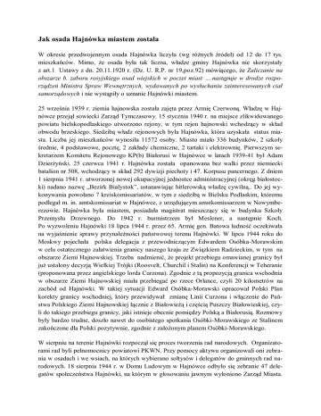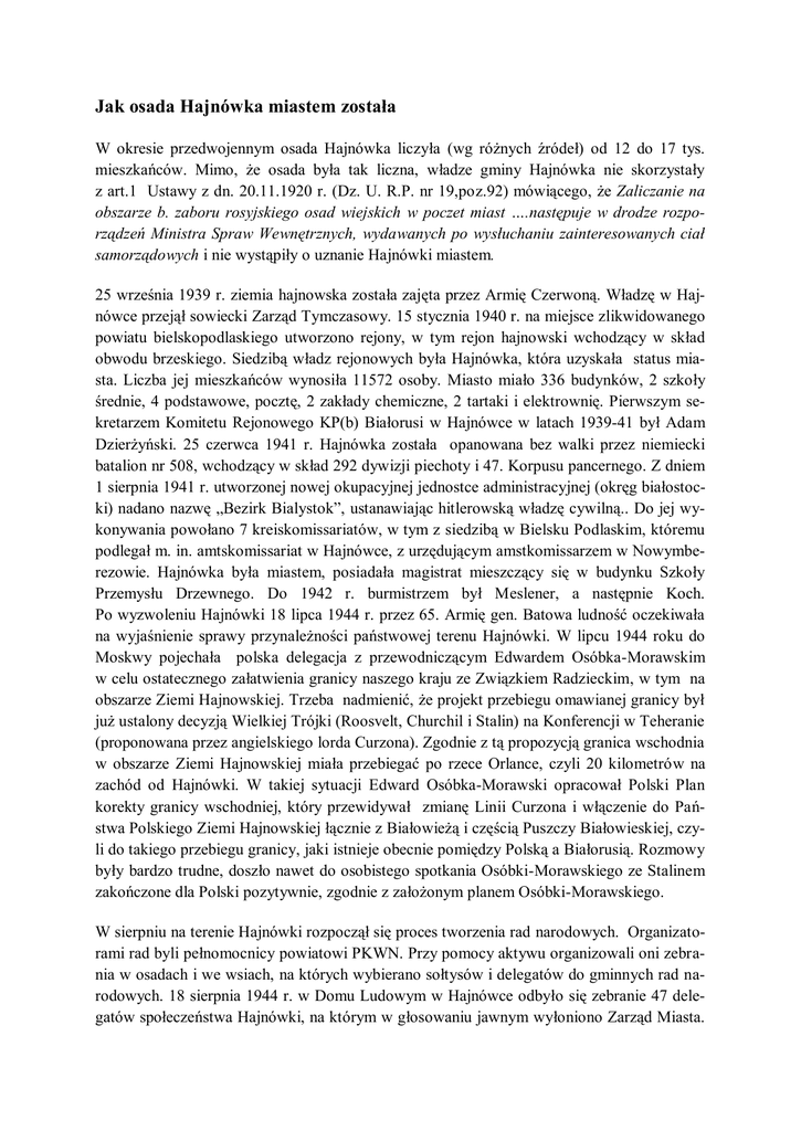 Jak osada Hajnówka miastem została W okresie przedwojennym osada Hajnówka liczyła (wg różnych źródeł) od 12 do 17 tys. mieszkańców. Mimo, że osada była tak liczna, władze gminy Hajnówka nie skorzystały z art.1 Ustawy z dn. 20.11.1920 r. (Dz. U. R.P. nr 19,poz.92) mówiącego, że Zaliczanie na obszarze b. zaboru rosyjskiego osad wiejskich w poczet miast ….następuje w drodze rozporządzeń Ministra Spraw Wewnętrznych, wydawanych po wysłuchaniu zainteresowanych ciał samorządowych i nie wystąpiły o uznanie Hajnówki miastem. 25 września 1939 r. ziemia hajnowska została zajęta przez Armię Czerwoną. Władzę w Hajnówce przejął sowiecki Zarząd Tymczasowy. 15 stycznia 1940 r. na miejsce zlikwidowanego powiatu bielskopodlaskiego utworzono rejony, w tym rejon hajnowski wchodzący w skład obwodu brzeskiego. Siedzibą władz rejonowych była Hajnówka, która uzyskała status miasta. Liczba jej mieszkańców wynosiła 11572 osoby. Miasto miało 336 budynków, 2 szkoły średnie, 4 podstawowe, pocztę, 2 zakłady chemiczne, 2 tartaki i elektrownię. Pierwszym sekretarzem Komitetu Rejonowego KP(b) Białorusi w Hajnówce w latach 1939-41 był Adam Dzierżyński. 25 czerwca 1941 r. Hajnówka została opanowana bez walki przez niemiecki batalion nr 508, wchodzący w skład 292 dywizji piechoty i 47. Korpusu pancernego. Z dniem 1 sierpnia 1941 r. utworzonej nowej okupacyjnej jednostce administracyjnej (okręg białostocki) nadano nazwę „Bezirk Bialystok”, ustanawiając hitlerowską władzę cywilną.. Do jej wykonywania powołano 7 kreiskomissariatów, w tym z siedzibą w Bielsku Podlaskim, któremu podlegał m. in. amtskomissariat w Hajnówce, z urzędującym amstkomissarzem w Nowymberezowie. Hajnówka była miastem, posiadała magistrat mieszczący się w budynku Szkoły Przemysłu Drzewnego. Do 1942 r. burmistrzem był Meslener, a następnie Koch. Po wyzwoleniu Hajnówki 18 lipca 1944 r. przez 65. Armię gen. Batowa ludność oczekiwała na wyjaśnienie sprawy przynależności państwowej terenu Hajnówki. W lipcu 1944 roku do Moskwy pojechała polska delegacja z przewodniczącym Edwardem Osóbka-Morawskim w celu ostatecznego załatwienia granicy naszego kraju ze Związkiem Radzieckim, w tym na obszarze Ziemi Hajnowskiej. Trzeba nadmienić, że projekt przebiegu omawianej granicy był już ustalony decyzją Wielkiej Trójki (Roosvelt, Churchil i Stalin) na Konferencji w Teheranie (proponowana przez angielskiego lorda Curzona). Zgodnie z tą propozycją granica wschodnia w obszarze Ziemi Hajnowskiej miała przebiegać po rzece Orlance, czyli 20 kilometrów na zachód od Hajnówki. W takiej sytuacji Edward Osóbka-Morawski opracował Polski Plan korekty granicy wschodniej, który przewidywał zmianę Linii Curzona i włączenie do Państwa Polskiego Ziemi Hajnowskiej łącznie z Białowieżą i częścią Puszczy Białowieskiej, czyli do takiego przebiegu granicy, jaki istnieje obecnie pomiędzy Polską a Białorusią. Rozmowy były bardzo trudne, doszło nawet do osobistego spotkania Osóbki-Morawskiego ze Stalinem zakończone dla Polski pozytywnie, zgodnie z założonym planem Osóbki-Morawskiego. W sierpniu na terenie Hajnówki rozpoczął się proces tworzenia rad narodowych. Organizatorami rad byli pełnomocnicy powiatowi PKWN. Przy pomocy aktywu organizowali oni zebrania w osadach i we wsiach, na których wybierano sołtysów i delegatów do gminnych rad narodowych. 18 sierpnia 1944 r. w Domu Ludowym w Hajnówce odbyło się zebranie 47 delegatów społeczeństwa Hajnówki, na którym w głosowaniu jawnym wyłoniono Zarząd Miasta. W jego skład weszli: lekarz Antoni Jędruszek, inż. Paweł Fabicki, ks. prob. Józef Moniuszko, Antoni Bachowski, Władysław Krzewski, Jerzy Lipnicki, Kazimierz Wnętrzycki, Aleksander Panasiuk i Kazimierz Niciejowski. Ponieważ Dekretem Polskiego Komitetu Wyzwolenia Narodowego z dnia 21 sierpnia 1944 r. wszelkie zmiany administracyjne wprowadzone przez okupanta zostały zrewertowane (Dz.U. 1944 nr 2 poz. 8), w tym zniesiono nadanie praw miejskich przez ZSRR, na następnym zebraniu w dniu 27 sierpnia 1944 roku delegat PKWN w Białymstoku-Antoni Roszko wyjaśnił, że Hajnówka nie jest miastem i należy przeprowadzić wybory Rady Gminnej. Przewodniczącym Gminnej Rady Narodowej został Antoni Jędruszek, zaś wójtem Kazimierz Nieciejewski. Rada Gminna mieściła się w lokalu Zarządu Gminnego, na parterze Szkoły Przemysłowej. 14 listopada 1944 r. wójt Kazimierz Nieciejowski zrzekł się urzędu i wyjechał z Hajnówki. Zastąpił go Michał Borowik, a w 1948 r. Władysław Pikulski. Prezydium Wojewódzkiej Rady Narodowej w Białymstoku uchwałą z dnia 31 marca 1948 r. wskazało na konieczność jak najrychlejszego wyłączenia osady, liczącej wg spisu na dzień 31 grudnia 1947 r. 9.285 mieszkańców, gminy wiejskiej Hajnówka. Prezydium Powiatowej Rady Narodowej w Bielsku Podlaskim poparło wniosek uzasadniając go następująco: Jak powszechnie wiadomo Hajnówka jest osiedlem wybitnie robotniczym i jednym z największych w Polsce ośrodków przemysłu drzewnego. W tym osiedlu znajdują się trzy duże zakłady przemysłowe oraz baza kolejek wąskotorowych Puszczy Białowieskiej zatrudniające łącznie 2000 robotników przemysłowych. Osada Hajnówka jest węzłową stacją kolei szerokotorowych, posiada silnie rozwiniętą sieć Spółdzielni Samopomocy Chłopskiej i Spożywców. Hajnówka jest typowym osiedlem przemysłowym, w którym robotnicy przemysłowi i ich rodziny stanowią 80% ogólnej liczby mieszkańców tej osady. Wszelkie względy administracyjne, gospodarcze i społeczno-polityczne przemawiają za utworzeniem w tej osadzie ustroju miejskiego. W okresie władzy radzieckiej (1939-41) Hajnówka była siedzibą rejonu (powiatu)i posiadała ustrój miejski. Należy również podkreślić, że Hajnówka była ośrodkiem walki klasowej proletariatu z reżimem rodzinnego faszyzmu. W protokóle nr 92 posiedzenia P