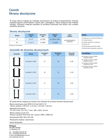 Cennik Ekranyakustyczne W naszej ofercie znajdują się materiały przeznaczone do budowy transparentnych ekranów zabezpieczającychprzedhałasem.Opróczpłytzpoliwęglanuiakrylusłużącychjakomateriał izolujący, oferujemy materiały potrzebne do produkcji konstrukcji pod ekrany oraz wszelkie potrzebneakcesoria. Ekranyakustyczne Grubość mm Szerokość mm Długość mm XT 15;20 do2500 od1500do4000 PC 8;10;12 do2000 do3000 Rodzaj Cena PLN/m² wgindywidualnych zamówień Realizacjanazamówienie Uszczelkidoekranówakustycznych Uszczelka Nazwa Szerokość mm Zalety • • • • • • Odpornośćnaczynnikiatmosferyczne Trwałośćkolorów Wysokaodpornośćnauderzenia OchronaUV Wysokaprzepuszczalnośćświatła Bardzodobraizolacyjnośćakustyczna Wysokość mm Cenahurt PLN/mb Certyfikaty • AprobataTechnicznaIBDiM AT/2005-03-0802 UszczelkaS-1399 22 39 11,00 • AprobataTechnicznaIBDiM AT/2007-03-2247 • AprobataTechnicznaIBDiM AT/2004-04-1748 • AprobataTechnicznaIBDiM AT/2006-03-1206 UszczelkaS-1400 18 33 11,50 UszczelkaS-1426 15 29 8,00 UszczelkaS-525 8 26 6,00 Wnaszejofercieznajdująsięrównieżinnemateriałydomontażuekranówakustycznych: Blachaaluminiowastop3005H22lub3103H22 Taśma:grubość1,00mm,1,15mm,1,25mm,1,50mm Kątownikialuminiowe 75x504mm,70x70x7mm,100x100x10mm Blachastalowaocynk275 Arkusze:grubość0,50-0,55mm,wymiar1000x2000mm DwuteownikiHEB,HEA,IPE160 Płaskownikistaloweialuminiowe Koszezbrojarskie Plekspol 80-299 Gdansk Gdańsk 80-522 ul. Plater ul. Emilii Woźnicy 19 22/13 tel.: +48 (058) 350-82-28 fax: +48 (058) 350-92-05 e-mail: [email protected] www.plekspol.com.pl