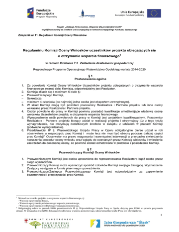 Projekt „Dotacja-Firma-Sukces. Wsparcie dla przedsiębiorczych!” współfinansowany ze środków Unii Europejskiej w ramach Europejskiego Funduszu Społecznego Załącznik nr 11. Regulamin Komisji Oceny Wniosków Regulaminu Komisji Oceny Wniosków uczestników projektu ubiegających się o otrzymanie wsparcia finansowego1 w ramach Działania 7.3 Zakładanie działalności gospodarczej Regionalnego Programu Operacyjnego Województwa Opolskiego na lata 2014-2020 §1 Postanowienia ogólne 1. Za powołanie Komisji Oceny Wniosków Uczestników projektu ubiegających o otrzymanie wsparcia finansowego zwanej dalej Komisją, odpowiedzialny jest Realizator. 2. Komisja składa się z minimum 6 osób tj.: Przewodniczącego Komisji, Sekretarza minimum 4 członków (co najmniej jedna osoba jest ekspertem zewnętrznym). 3. W skład Komisji mogą być powołani pracownicy Realizatora i Partnera projektu lub inne osoby wskazane przez Realizatora i Partnera projektu. 4. Osoby powołane do pracy w Komisji powinny posiadać kwalifikacje umożliwiające właściwą ocenę wniosków Uczestników projektu o otrzymanie wsparcia finansowego. 5. Wynagrodzenie osób powołanych do pracy w Komisji jest wydatkiem kwalifikowalnym. Pracownicy Realizatora i Partnera projektu biorący udział w realizacji projektu i otrzymujący już z tego tytułu wynagrodzenie, nie otrzymują dodatkowych środków w związku z udziałem w pracach Komisji (podwójne wynagradzanie). 6. Przedstawiciel IP tj. Wojewódzkiego Urzędu Pracy w Opolu obligatoryjnie bierze udział w roli obserwatora w rozpoczęciu prac Komisji i może lecz nie musi być obecny podczas dalszej części 2. prac Komisji Obserwator ma prawo reagowania i ewentualnej interwencji w przypadku stwierdzenia naruszenia procedur oceny wniosku oraz wglądu do ocenianych przez Komisję wniosków i wniesienia zastrzeżeń do dokonanej oceny, co powinno zostać odnotowane w protokole z posiedzenia Komisji. §2 Przewodniczący Komisji Oceny Wniosków 1. Przewodniczącym Komisji jest osoba uprawniona do reprezentowania Realizatora bądź osoba przez niego wyznaczona. 2. Przewodniczący Komisji może wyznaczyć spośród członków Komisji swojego Zastępcę. Wyznaczenie Zastępcy następuje w formie pisemnego upoważnienia. 3. Przewodniczący/Zastępca Przewodniczącego Komisji jest odpowiedzialny za zapewnienie bezstronności i przejrzystości prac Komisji. 1 Wniosek uczestnika projektu o otrzymanie wsparcia finansowego, tj.: - Wniosek o przyznanie dotacji, - Wniosek o przyznanie podstawowego wsparcia pomostowego, - Wniosek o przyznanie przedłużonego wsparcia pomostowego. 2 Obligatoryjny udział w pracach KOW przedstawiciela IP tj. Wojewódzkiego Urzędu Pracy w Opolu, dotyczy prac KOW w sprawie przyznania dotacji. W przypadku prac KOW dotyczących udzielenia wsparcia pomostowego, udział przedstawiciela IP nie jest obowiązkowy. 1 Projekt „Dotacja-Firma-Sukces. Wsparcie dla przedsiębiorczych!” współfinansowany ze środków Unii Europejskiej w ramach Europejskiego Funduszu Społecznego §3 Zadania Komisji Oceny Wniosków 1. Komisja jest odpowiedzialna za: a) przeprowadzenie oceny merytorycznej wniosków o otrzymanie wsparcia finansowego złożonych przez Uczestników projektu, b) zweryfikowanie biznesplanów i pozostałych załączników do wniosku, c) sporządzenie podstawowej listy rankingowej wniosków uszeregowanych w kolejności od największej liczby uzyskanych punktów, d) przeprowadzenie powtórnej oceny wniosku w przypadku złożenia przez Beneficjenta pomocy odwołania od negatywnej oceny Komisji, e) sporządzenie listy rankingowej po odwołaniach wniosków uszeregowanych w kolejności od największej liczby uzyskanych punktów, uwzględniającej ewentualne zmiany w kolejności spowodowane pozytywnym rozpatrzeniem wniosków, które otrzymały pozytywną ocenę w wyniku procedury odwoławczej, przy czym wynik powtórnej oceny merytorycznej co do zasady nie powinien być gorszy od wyniku oceny pierwszej, chyba że oceniający stwierdzą występowanie istotnych przyczyn obniżenia punktacji. §4 Posiedzenia Komisji Oceny Wniosków 1. Posiedzenia Komisji są ważne, gdy uczestniczy w nich minimum 6 członków Komisji (w tym Przewodniczący/Zastępca Przewodniczącego). 2. Członkowie Komisji dokonują oceny merytorycznej wniosków podczas posiedzenia Komisji, które odbywa się w siedzibie Realizatora lub innym wskazanym miejscu. §5 Zasada bezstronności prac Komisji Oceny Wniosków 1. Członkowie Komisji oraz obserwator z ramienia IP tj. Wojewódzkiego Urzędu Pracy w Opolu nie mogą być powiązani z Wnioskodawcami stosunkiem osobistym lub służbowym, takiego rodzaju, który mógłby wywołać wątpliwości, co do bezstronności przeprowadzonych czynności. 2. Członkowie Komisji oraz obserwator z ramienia Instytucji Pośredniczącej tj. Wojewódzkiego Urzędu Pracy w Opolu zobowiązani są do podpisania Deklaracji bezstronności i poufności, której wzór stanowi załącznik do niniejszego regulaminu. 3. Każdy członek Komisji przed przystąpieniem do oceny wniosku, zobowiązany jest także podpisać Deklarację bezstronności i poufności znajdującą się na Karcie oceny merytorycznej wniosku w odniesieniu do wszystkich wniosków ocenianych w ramach danego naboru przez danego oceniającego. Nie podpisanie deklaracji bezstronności i poufności wyklucza członka Komisji z udziału w jej pracach. 4. W przypadku, określonym w ust. 3, wniosek jest kierowany do oceny innego członka Komisji wskazanego przez Przewodniczącego/Zastępcę Przewodniczącego. §6 Ocena jakości merytorycznej i finansowej wniosków 1. Przedmiotem oceny Komisji są wyłącznie wnioski ocenione przez Realizatora, jako kompletne i spełniające kryteria formalne. W przypadku, gdy oceniający dostrzeże, że wniosek nie spełnia kryteriów formalnych, ponieważ uchybienia te nie zostały zauważone na etapie oceny formalnej, wniosek, jako niepodlegający ocenie merytorycznej, tra