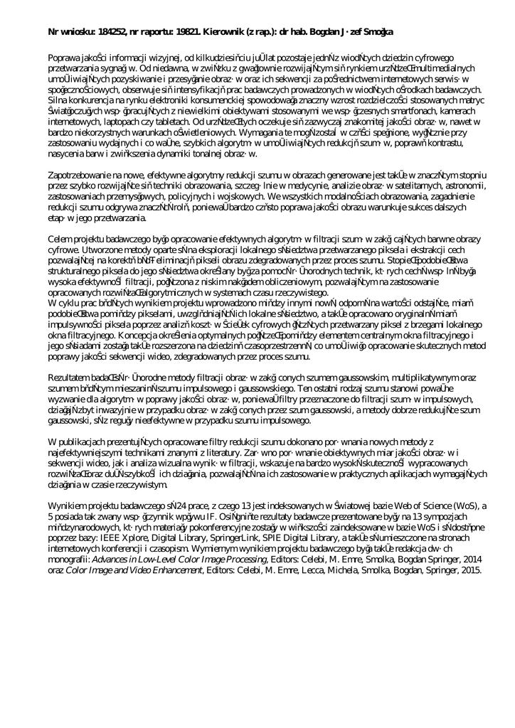 Nr wniosku: 184252, nr raportu: 19821. Kierownik (z rap.): dr hab. Bogdan Józef Smołka Poprawa jakości informacji wizyjnej, od kilkudziesięciu już lat pozostaje jedną z wiodących dziedzin cyfrowego przetwarzania sygnałów. Od niedawna, w związku z gwałtownie rozwijającym się rynkiem urządzeń multimedialnych umożliwiających pozyskiwanie i przesyłanie obrazów oraz ich sekwencji za pośrednictwem internetowych serwisów społecznościowych, obserwuje się intensyfikację prac badawczych prowadzonych w wiodących ośrodkach badawczych. Silna konkurencja na rynku elektroniki konsumenckiej spowodowała znaczny wzrost rozdzielczości stosowanych matryc światłoczułych współpracujących z niewielkimi obiektywami stosowanymi we współczesnych smartfonach, kamerach internetowych, laptopach czy tabletach. Od urządzeń tych oczekuje się zazwyczaj znakomitej jakości obrazów, nawet w bardzo niekorzystnych warunkach oświetleniowych. Wymagania te mogą zostać w części spełnione, wyłącznie przy zastosowaniu wydajnych i co ważne, szybkich algorytmów umożliwiających redukcję szumów, poprawę kontrastu, nasycenia barw i zwiększenia dynamiki tonalnej obrazów. Zapotrzebowanie na nowe, efektywne algorytmy redukcji szumu w obrazach generowane jest także w znaczącym stopniu przez szybko rozwijające się techniki obrazowania, szczególnie w medycynie, analizie obrazów satelitarnych, astronomii, zastosowaniach przemysłowych, policyjnych i wojskowych. We wszystkich modalnościach obrazowania, zagadnienie redukcji szumu odgrywa znaczącą rolę, ponieważ bardzo często poprawa jakości obrazu warunkuje sukces dalszych etapów jego przetwarzania. Celem projektu badawczego było opracowanie efektywnych algorytmów filtracji szumów zakłócających barwne obrazy cyfrowe. Utworzone metody oparte są na eksploracji lokalnego sąsiedztwa przetwarzanego piksela i ekstrakcji cech pozwalającej na korektę bądź eliminację pikseli obrazu zdegradowanych przez proces szumu. Stopień podobieństwa strukturalnego piksela do jego sąsiedztwa określany był za pomocą różnorodnych technik, których cechą wspólną była wysoka efektywność filtracji, połączona z niskim nakładem obliczeniowym, pozwalającym na zastosowanie opracowanych rozwiązań algorytmicznych w systemach czasu rzeczywistego. W cyklu prac będących wynikiem projektu wprowadzono między innymi nową, odporną na wartości odstające, miarę podobieństwa pomiędzy pikselami, uwzględniającą ich lokalne sąsiedztwo, a także opracowano oryginalną miarę impulsywności piksela poprzez analizę kosztów ścieżek cyfrowych łączących przetwarzany piksel z brzegami lokalnego okna filtracyjnego. Koncepcja określenia optymalnych połączeń pomiędzy elementem centralnym okna filtracyjnego i jego sąsiadami została także rozszerzona na dziedzinę czasoprzestrzenną, co umożliwiło opracowanie skutecznych metod poprawy jakości sekwencji wideo, zdegradowanych przez proces szumu. Rezultatem badań są różnorodne metody filtracji obrazów zakłóconych szumem gaussowskim, multiplikatywnym oraz szumem będącym mieszaniną szumu impulsowego i gaussowskiego. Ten ostatni rodzaj szumu stanowi poważne wyzwanie dla algorytmów poprawy jakości obrazów, ponieważ filtry przeznaczone do filtracji szumów impulsowych, działają zbyt inwazyjnie w przypadku obrazów zakłóconych przez szum gaussowski, a metody dobrze redukujące szum gaussowski, są z reguły nieefektywne w przypadku szumu impulsowego. W publikacjach prezentujących opracowane filtry redukcji szumu dokonano porównania nowych metody z najefektywniejszymi technikami znanymi z literatury. Zarówno porównanie obiektywnych miar jakości obrazów i sekwencji wideo, jak i analiza wizualna wyników filtracji, wskazuje na bardzo wysoką skuteczność wypracowanych rozwiązań oraz dużą szybkość ich działania, pozwalającą na ich zastosowanie w praktycznych aplikacjach wymagających działania w czasie rzeczywistym. Wynikiem projektu badawczego są 24 prace, z czego 13 jest indeksowanych w światowej bazie Web of Science (WoS), a 5 posiada tak zwany współczynnik wpływu IF. Osiągnięte rezultaty badawcze prezentowane były na 13 sympozjach międzynarodowych, których materiały pokonferencyjne zostały w większości zaindeksowane w bazie WoS i są dostępne poprzez bazy: IEEE Xplore, Digital Library, SpringerLink, SPIE Digital Library, a także są umieszczone na stronach internetowych konferencji i czasopism. Wymiernym wynikiem projektu badawczego była także redakcja dwóch monografii: Advances in Low-Level Color Image Processing, Editors: Celebi, M. Emre, Smolka, Bogdan Springer, 2014 oraz Color Image and Video Enhancement, Editors: Celebi, M. Emre, Lecca, Michela, Smolka, Bogdan, Springer, 2015.