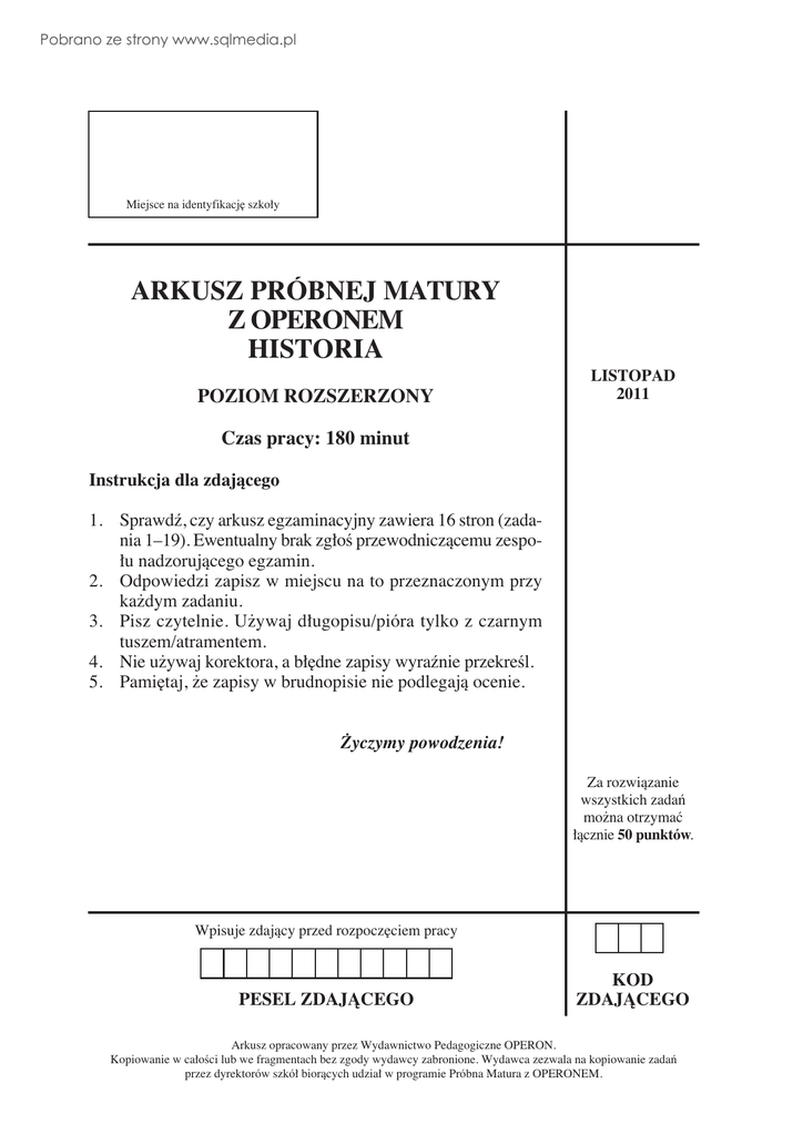 Pobrano ze strony www.sqlmedia.pl Miejsce na identyfikacj´ szko∏y ARKUSZ PRÓBNEJ MATURY Z OPERONEM HISTORIA POZIOM ROZSZERZONY LISTOPAD 2011 Czas pracy: 180 minut Instrukcja dla zdajàcego 1. 2. 3. 4. 5. Sprawdê, czy arkusz egzaminacyjny zawiera 16 stron (zadania 1–19). Ewentualny brak zg∏oÊ przewodniczàcemu zespo∏u nadzorujàcego egzamin. Odpowiedzi zapisz w miejscu na to przeznaczonym przy ka˝dym zadaniu. Pisz czytelnie. U˝ywaj d∏ugopisu/pióra tylko z czarnym tuszem/atramentem. Nie u˝ywaj korektora, a b∏´dne zapisy wyraênie przekreÊl. Pami´taj, ˝e zapisy w brudnopisie nie podlegajà ocenie. ˚yczymy powodzenia! Za rozwiàzanie wszystkich zadaƒ mo˝na otrzymaç ∏àcznie 50 punktów. Wpisuje zdajàcy przed rozpocz´ciem pracy PESEL ZDAJÑCEGO KOD ZDAJÑCEGO Arkusz opracowany przez Wydawnictwo Pedagogiczne OPERON. Kopiowanie w ca∏oÊci lub we fragmentach bez zgody wydawcy zabronione. Wydawca zezwala na kopiowanie zadaƒ przez dyrektorów szkó∏ bioràcych udzia∏ w programie Próbna Matura z OPERONEM. Pobrano ze strony www.sqlmedia.pl Historia. Poziom rozszerzony Próbna Matura z OPERONEM i „Gazetą Wyborczą” CZĘŚĆ I (20 pkt) Zadanie 1. (1 pkt) Dopasuj właściwe religie do fotografii. judaizm, islam, chrześcijaństwo, buddyzm, hinduizm 1. . . . . . . . . . . . . . . . . . . . . . . . . . . . . 2. . . . . . . . . . . . . . . . . . . . . . . . . . . . . 3. . . . . . . . . . . . . . . . . . . . . . . . . . . . . Zadanie 2. (1 pkt) Uzupełnij tabelę. Dobierz właściwych władców lub wodzów do podanych opisów. Juliusz Cezar, Gajusz Mariusz, Leonidas, Cheops, Echnaton Charakterystyka Władca lub wódz 1. Król Sparty, brał udział w wojnach z Persją. Zginął, broniąc przejścia przez góry. 2. Wódz i polityk. Pełnił funkcję konsula. Przeprowadził reformę armii rzymskiej, która doprowadziła do jej uzawodowienia. 3. Przeprowadził reformę religii egipskiej, czyniąc boga Atona głównym bóstwem. Zadanie 3. (2 pkt) Podpisz rysunki przedstawiające herby trzech zakonów rycerskich średniowiecznej Europy. 1. . . . . . . . . . . . . . . . . . . . . . . . . . . . . 2 2. . . . . . . . . . . . . . . . . . . . . . . . . . . . . 3. . . . . . . . . . . . . . . . . . . . . . . . . . . . . Pobrano ze strony www.sqlmedia.pl Historia. Poziom rozszerzony Próbna Matura z OPERONEM i „Gazetą Wyborczą” Zadanie 4. (1 pkt) Podpisz mapy. Wybierz właściwe tytuły z podanych poniżej przykładów. Rzeczpospolita Obojga Narodów po unii lubelskiej, Polska za Kazimierza Wielkiego, Polska w 1320 r., Polska i Litwa po wojnie trzynastoletniej granice Korony granice Litwy n Do Wilno Dniepr Gdaƒsk Miƒsk Poznaƒ cz´Êci terenów Spiszu oddane Polsce w zastaw przez W´gry ziemie lenne ziemie przy∏àczone Warszawa Kijów Dniepr Kraków Lwów Dn ie str 1. . . . . . . . . . . . . . . . . . . . . . . . . . . . . . . . 0 ................................... Dunaj 250 km ................................... Korona polskie ziemie lenne obszar Wielkiego Ksi´stwa Litewskiego wspólne ziemie Polski i Litwy (polsko-litewskie) ziemie w∏àczone do Korony Ryga wspólne ziemie lenne Dźw in Gdaƒsk a W isł a Wilno Warszawa Prypeć Warta Od ra Kraków Kijów Dn i ep r Lwów Dn ies tr 100 km Pru 0 Dn iep r Du na j t 2. . . . . . . . . . . . . . . . . . . . . . . . . . . . . . . . . . . . . . . . . . . . . . . . . . . . . . . . . . . . . . . . . . . . . . . . . . . . . . . . . . . . . . . . . . . . . . 3 Pobrano ze strony www.sqlmedia.pl Historia. Poziom rozszerzony Próbna Matura z OPERONEM i „Gazetą Wyborczą” Zadanie 5. (2 pkt) Wyjaśnij pojęcia. A. artykuły henrykowskie – . . . . . . . . . . . . . . . . . . . . . . . . . . . . . . . . . . . . . . . . . . . . . . . . . . . . . . . . . . . . . . . ...................................................................................... ...................................................................................... B. rejestr kozacki – . . . . . . . . . . . . . . . . . . . . . . . . . . . . . . . . . . . . . . . . . . . . . . . . . . . . . . . . . . . . . . . . . . . . . . ...................................................................................... ...................................................................................... Zadanie 6. (2 pkt) Połącz ze sobą postaci, które łączyło uczestnictwo w tych samych wydarzeniach epoki nowożytnej. 1. Oliver Cromwell A. Izabela Katolicka 2. Marcin Luter B. Karol I Stuart 3. Krzysztof Kolumb C. Francis Drake 4. Elżbieta I D. Karol V Habsburg E. Gustaw Adolf 1. . . . 2. . . . 3. . . . 4. . . . Zadanie 7. (3 pkt) Przyjrzyj się obrazowi i na jego podstawie wykonaj polecenia. 4 Pobrano ze strony www.sqlmedia.pl Historia. Poziom rozszerzony Próbna Matura z OPERONEM i „Gazetą Wyborczą” A. Podaj nazwę i datę roczną wydarzenia z dziejów Polski, do którego nawiązuje obraz. ...................................................................................... B. Napisz, kim jest osoba leżąca pod drzwiami sali. Podaj imię i nazwisko. ...................................................................................... C. Podaj imię i nazwisko artysty, który namalował ten obraz. ...................................................................................... Zadanie 8. (3 pkt) Wymień i wyjaśnij wszystkie zasady, którymi kierował się w swoich pracach kongres wiedeński. ...................................................................................... ...................................................................................... ...................................................................................... ...................................................................................... ...................................................................................... Zadanie 9. (3 pkt) Uporządkuj chronologicznie podane w tabeli wydarzenia. Zacznij od najwcześniejszego – oznacz je 1. W