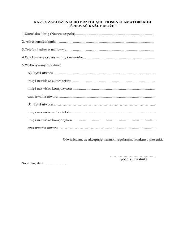 KARTA ZGŁOSZENIA DO PRZEGLĄDU PIOSENKI AMATORSKIEJ „ŚPIEWAĆ KAŻDY MOŻE” 1.Nazwisko i imię (Nazwa zespołu)..................................................................................... 2. Adres zamieszkania ......................................................................................................... 3.Telefon i adres e-mailowy ................................................................................................ 4.Opiekun artystyczny – imię i nazwisko............................................................................. 5.Wykonywany repertuar: A) Tytuł utworu ............................................................................................................. imię i nazwisko autora tekstu ......................................................................................... imię i nazwisko kompozytora ....................................................................................... czas trwania utworu ........................................................................................................ B) Tytuł utworu……………………………………………………………………….. imię i nazwisko autora tekstu .......................................................................................... imię i nazwisko kompozytora .......................................................................................... czas trwania utworu …………………………………..................................................... Oświadczam, że akceptuję warunki regulaminu konkursu piosenki. ………………………………. podpis uczestnika Sicienko, dnia ..........................