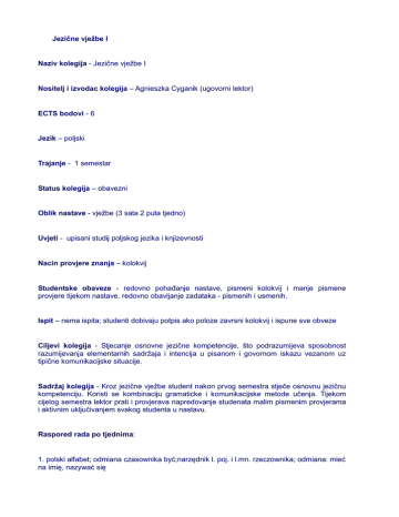 Jezične vježbe I Naziv kolegija - Jezične vježbe I Nositelj i izvodac kolegija – Agnieszka Cyganik (ugovorni lektor) ECTS bodovi - 6 Jezik – poljski Trajanje - 1 semestar Status kolegija – obavezni Oblik nastave - vježbe (3 sata 2 puta tjedno) Uvjeti - upisani studij poljskog jezika i knjizevnosti Nacin provjere znanja – kolokvij Studentske obaveze - redovno pohañanje nastave, pismeni kolokvij i manje pismene provjere tijekom nastave, redovno obavljanje zadataka - pismenih i usmenih. Ispit – nema ispita; studenti dobivaju potpis ako poloze zavrsni kolokvij i ispune sve obveze Ciljevi kolegija - Stjecanje osnovne jezične kompetencije, što podrazumijeva sposobnost razumijevanja elementarnih sadržaja i intencija u pisanom i govornom iskazu vezanom uz tipične komunikacijske situacije. Sadržaj kolegija - Kroz jezične vježbe student nakon prvog semestra stječe osnovnu jezičnu kompetenciju. Koristi se kombinaciju gramaticke i komunikacijske metode učenja. Tijekom cijelog semestra lektor prati i provjerava napredovanje studenata malim pismenim provjerama i aktivnim uključivanjem svakog studenta u nastavu. Raspored rada po tjednima: 1. polski alfabet; odmiana czasownika być;narzędnik l. poj. i l.mn. rzeczownika; odmiana: mieć na imię, nazywać się 2. konstrukcje składniowe typu: On jest + narzędnik, To jest + mianownik; rodzaj gramatyczny;zaimki ten, tamten; odmiana czasownika mieć; biernik l. poj. rzeczownika i przymiotnika 3. koniugacja -ę, isz (II), -m, -sz (III); koniugacja -ę, -esz (I); przysłówki częstotliwości: nigdy, czasami, często; narzędnik l. poj. i l. mn. przymiotników;biernik zaimków osobowych 4. odmiana czasowników typu: nosić; konstrukcje składniowe typu: jechać + narzędnik; odmiana czasowników: jechać, iść; dopełniacz l. poj. Rzeczowników; czasownik być w przeczeniach; dopełniacz zaimków osobowych 5. dopełniacz l. poj. przymiotników, zamiana formy biernikowej na dopełniaczową przy czasownikach zaprzeczonych; dopełniacz posesywny; zaimki dzierŜawcze;czasowniki z rekcją dopełniaczową: słuchać, bać się, potrzebować, uczyć się, szukać 6. odmiana czasownika móc; czasowniki modalne + bezokolicznik; liczebniki do 100; dopełniaczowe i biernikowe formy zaimków osobowych po przyimkach 7. czasowniki z rekcją narzędnikową: bawić się, interesować się, opiekować się; narzędnik zaimków osobowych; określanie czasu – godziny; określanie czasu - pytanie: O której godzinie? 8. koniugacje – powtórzenie; strona zwrotna czasowników; czas przeszły; mianownik i biernik l. mn rzeczowników i przymiotników niemęskoosobowych; odmiana czasownika jeść 9. czas przeszły czasowników na -eć; dopełniacz l. mn. rzeczowników i przymiotników; formy czasu przeszłego czasownika być w zdaniach zaprzeczonych typu: Nie było tutaj Piotra.; czas przeszły czasownika iść; Przyimki na i do jako określenia kierunku 10. określania czasu - dni tygodnia; odmiana rzeczownika: tydzień; miejscownik l. poj. i mn. rzeczowników; miejscownik l. poj. i mn. zaimków i przymiotników 11. pytania typu: O kim (o czym) rozmawiacie?; rekcja przyimków; aspekt, czas przyszły czasowników dokonanych i niedokonanych (typu: będę mówić); aspekt – czasowniki nieregularne; czas przyszły typu: będę mówił 12. uŜycie form dokonanych i niedokonanych czasowników; czasowniki fazowe zaczynać, kończyć + czasowniki niedokonane; określenia czasu: nagle, za chwilę + czasowniki dokonane; zaimki nieokreślone typu: ktoś, coś, jakiś; formy grzecznościowe: Czy moŜesz podać mi cukier? 13. rekcja liczebników ; określenia miary z dopełniaczem ; określenia czasu – nazwy miesięcy; celownik l. poj. i l. mn. rzeczowników i zaimków 14. przymiotniki a przysłówki: mało – mały, duŜo – duŜy; zdania okolicznikowe; mianownik l. mn. rzeczowników męskoosobowych 15. przymiotnik przy rzeczownikach męskoosobowych w mianowniku; liczebniki od 100 do 1000; dopełniacz i biernik l. mn. rzeczowników i przymiotników męskoosobowych Obvezna literatura: Priručnici: A. Janowska, M. Pastuchowa, Dzień dobry, Śląsk Wydawnictwo Naukowe,, Katowice 2005; A. Achtelik, B. Serafin, Miło mi panią poznać, Wydawnictwo US, Katowice 2007; Dopunska: B. KryŜan-Stanojević, I. Sawicka, Ćwiczenia z fleksji języka polskiego dla cudzoziemców, Wydawnictwo Uniwersytetu Mikołaja Kopernika, Toruń 2007; M. Pasieka, Język polski dla cudzoziemców - ćwiczenia dla początkujących, Wrocław, 2001; M. Moguš, N. Pintarić, Poljsko-hrvatski rječnik, Zagreb, 2002.